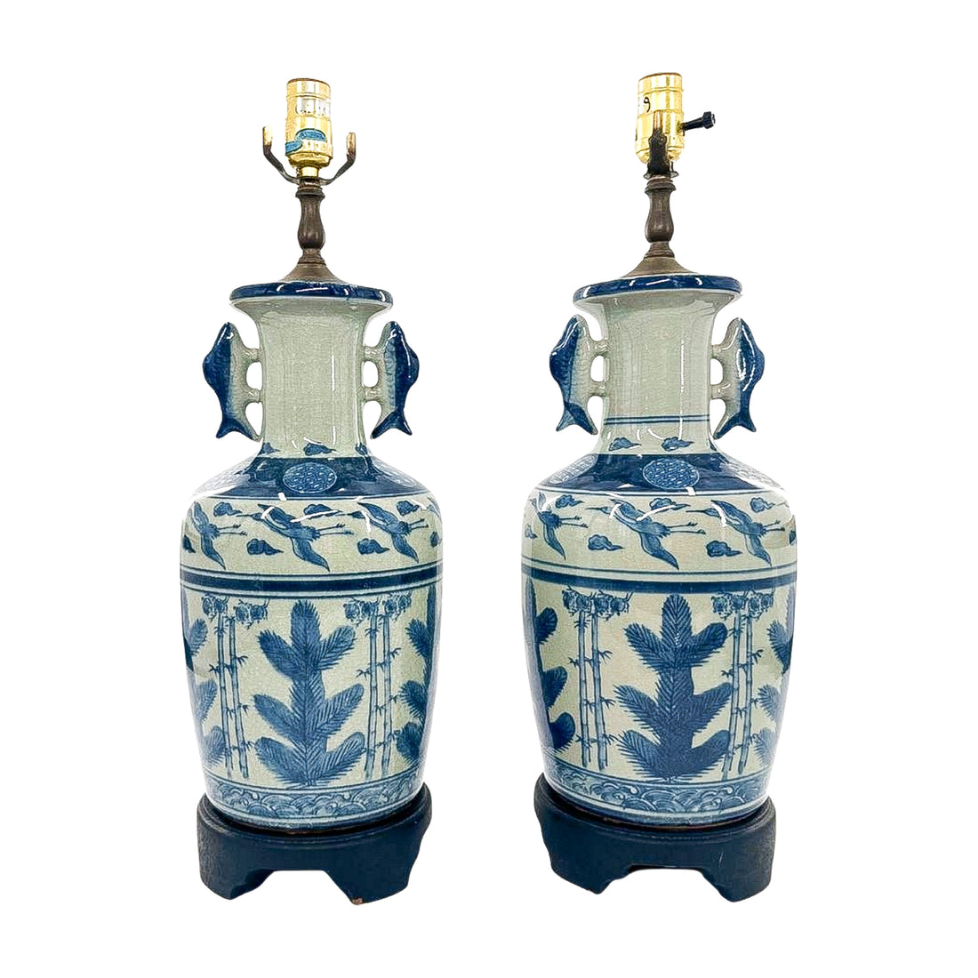 Pair of Blue and White Porcelain Fish and Heron Motif Lamps