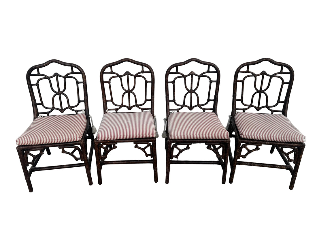 A beautifully detailed set of four faux bamboo dining chairs in a rich tortoiseshell finish...