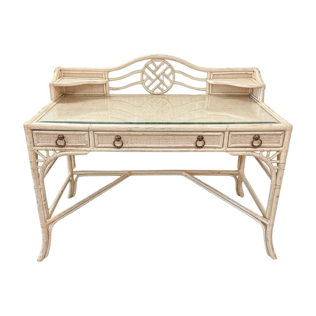 Vintage Hekman White Chinoiserie Rattan Desk with Glass Top