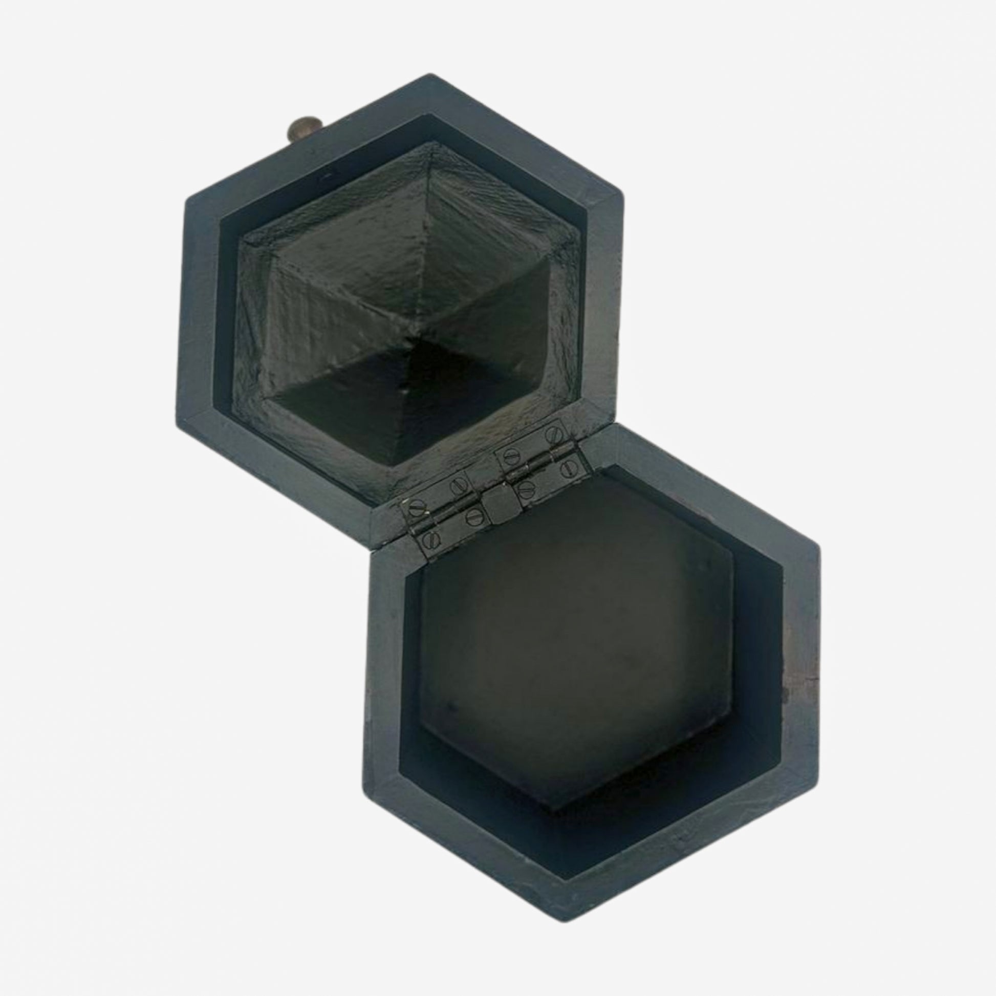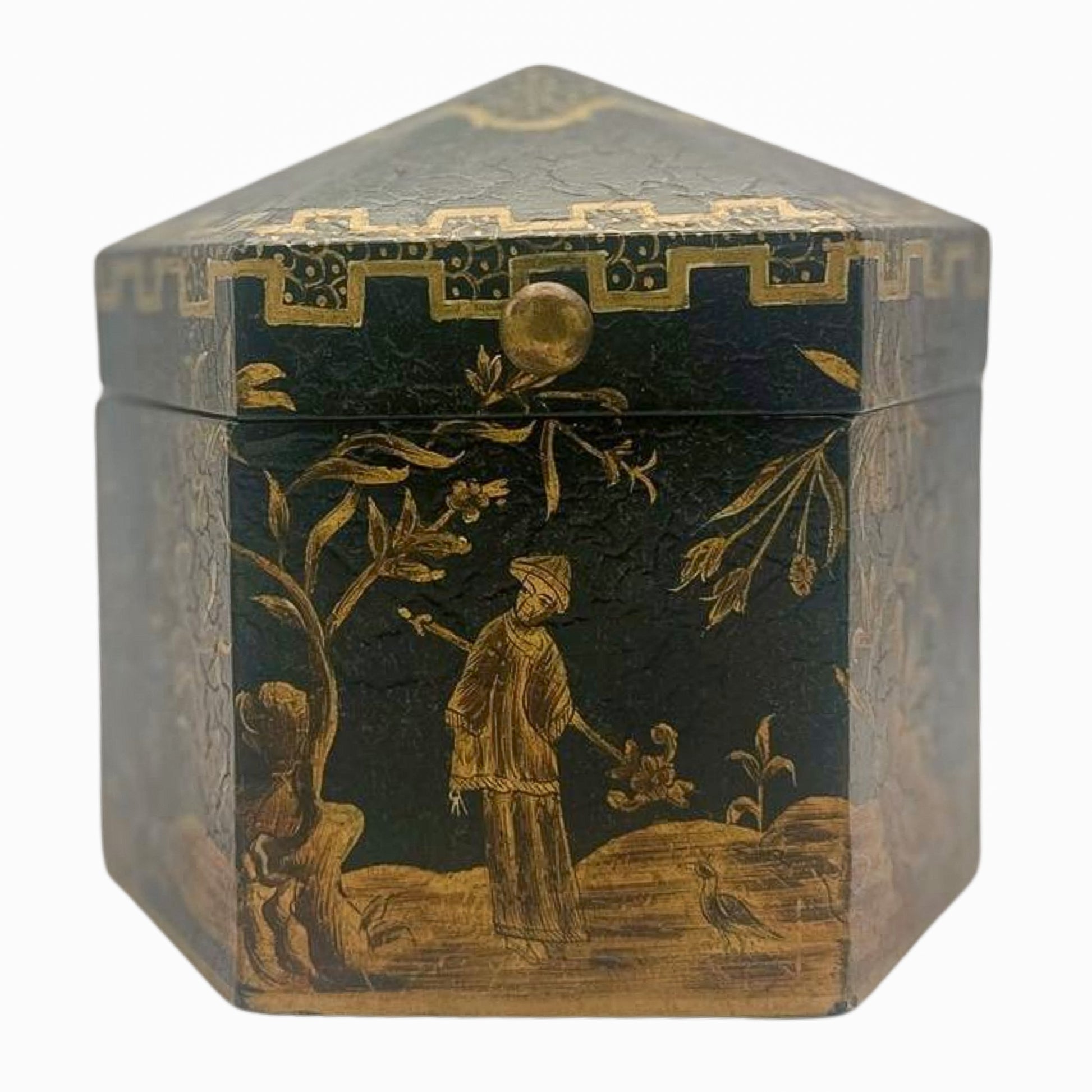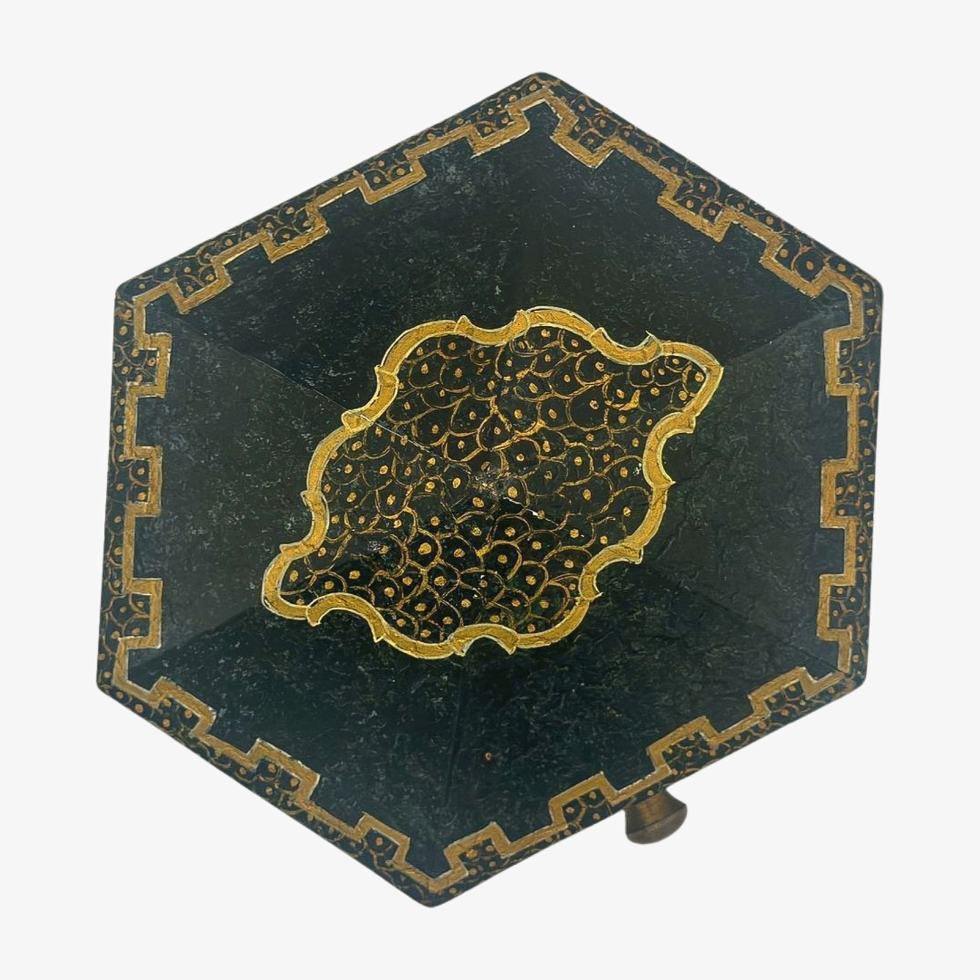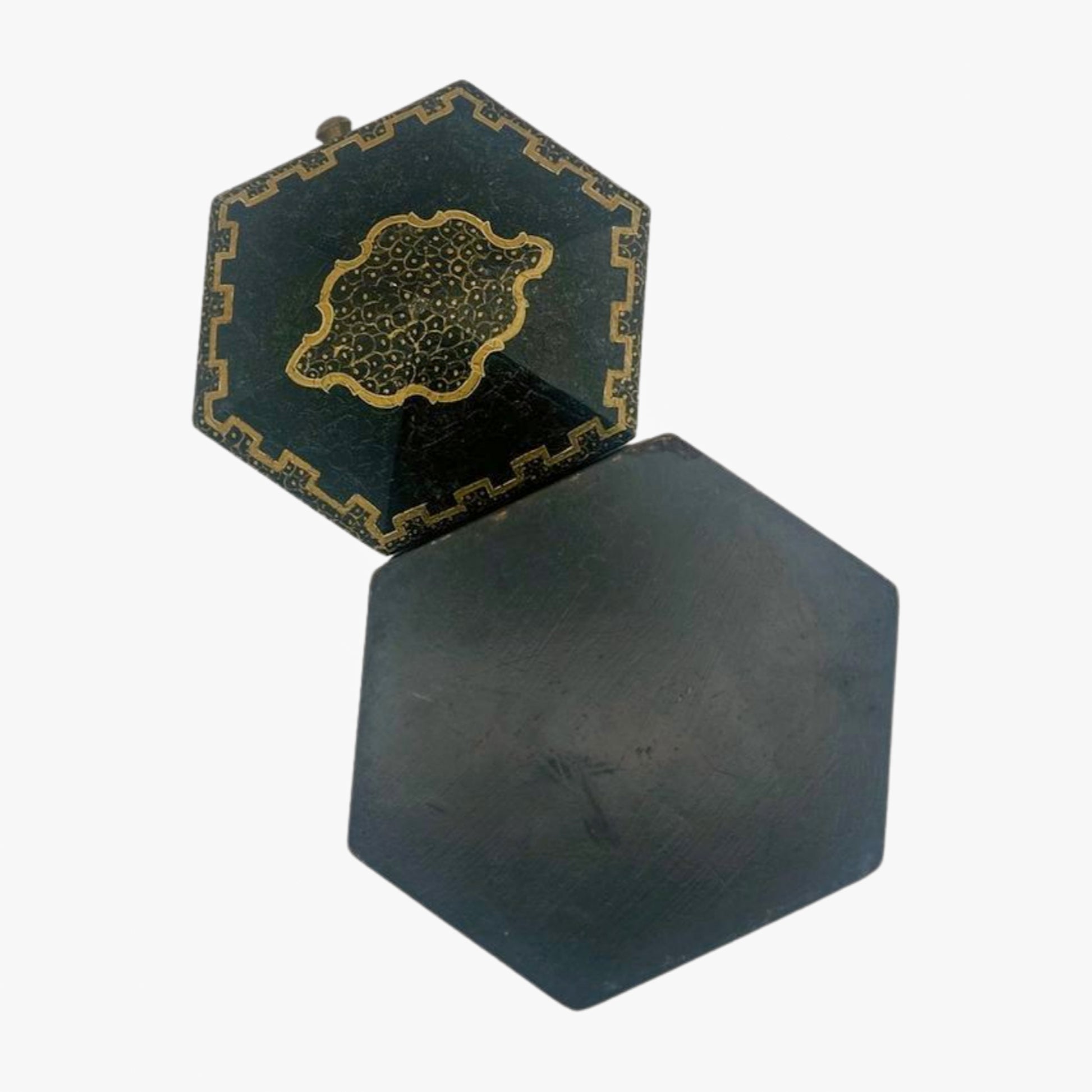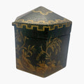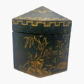 For the maximalist with restraint. This hexagonal chinoiserie box features classic black-and-gold lacquered scenes with garden figures, flora, and a sweet little bird or two. The pyramid-style lid is just a touch askew when closed—like it knows it’s too pretty to be perfect.