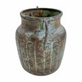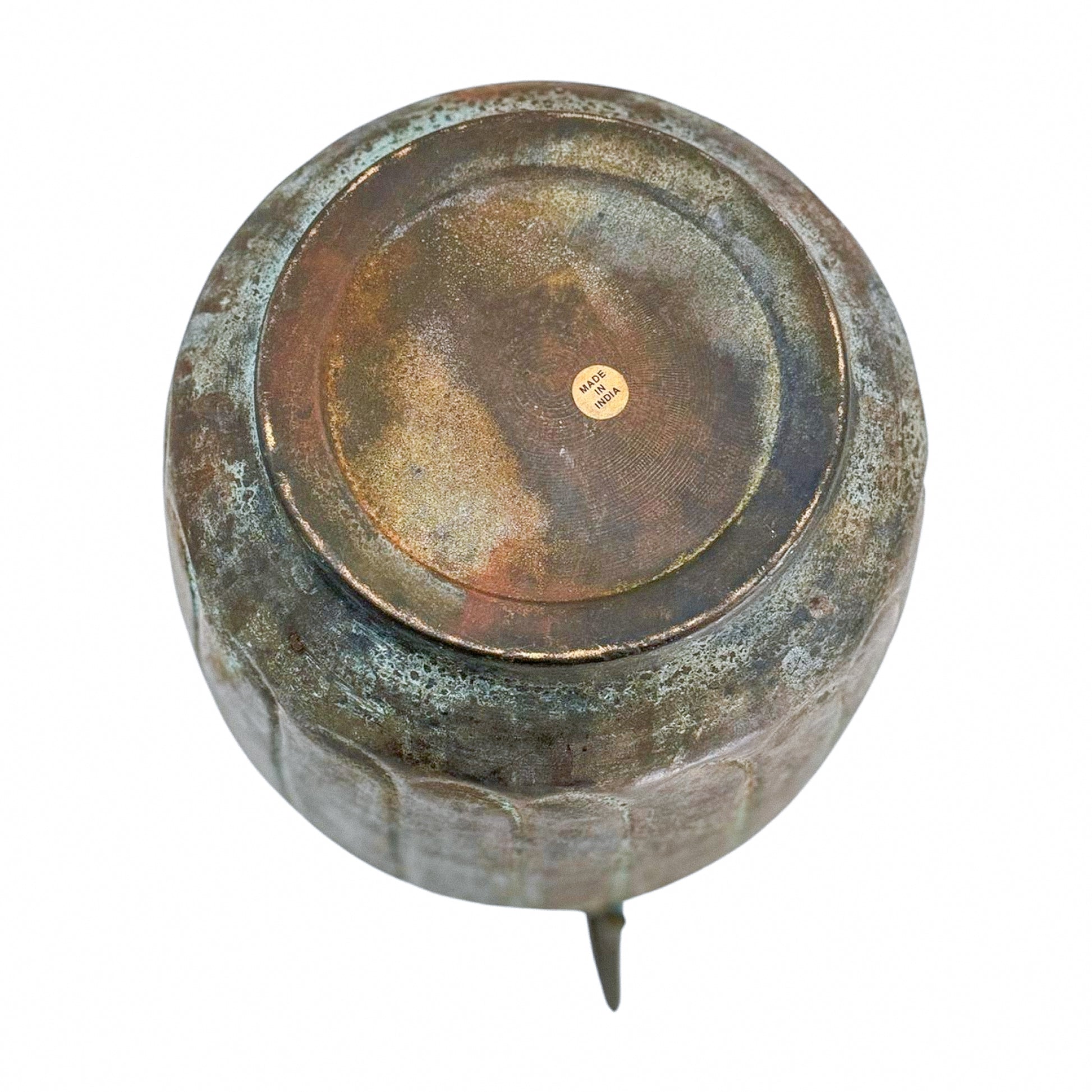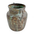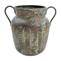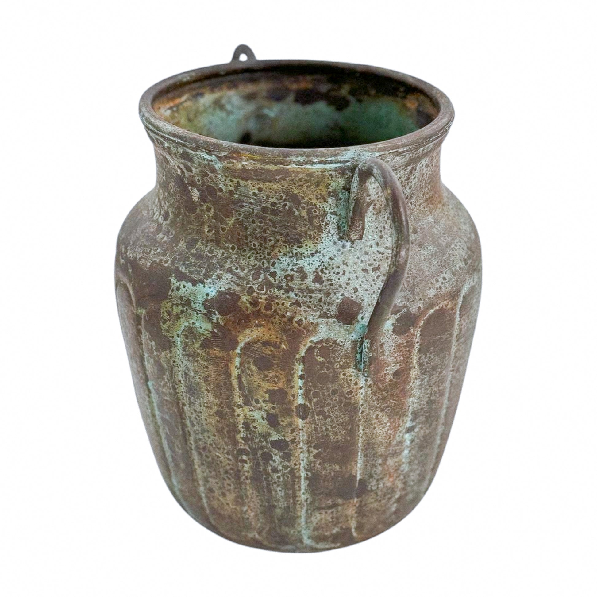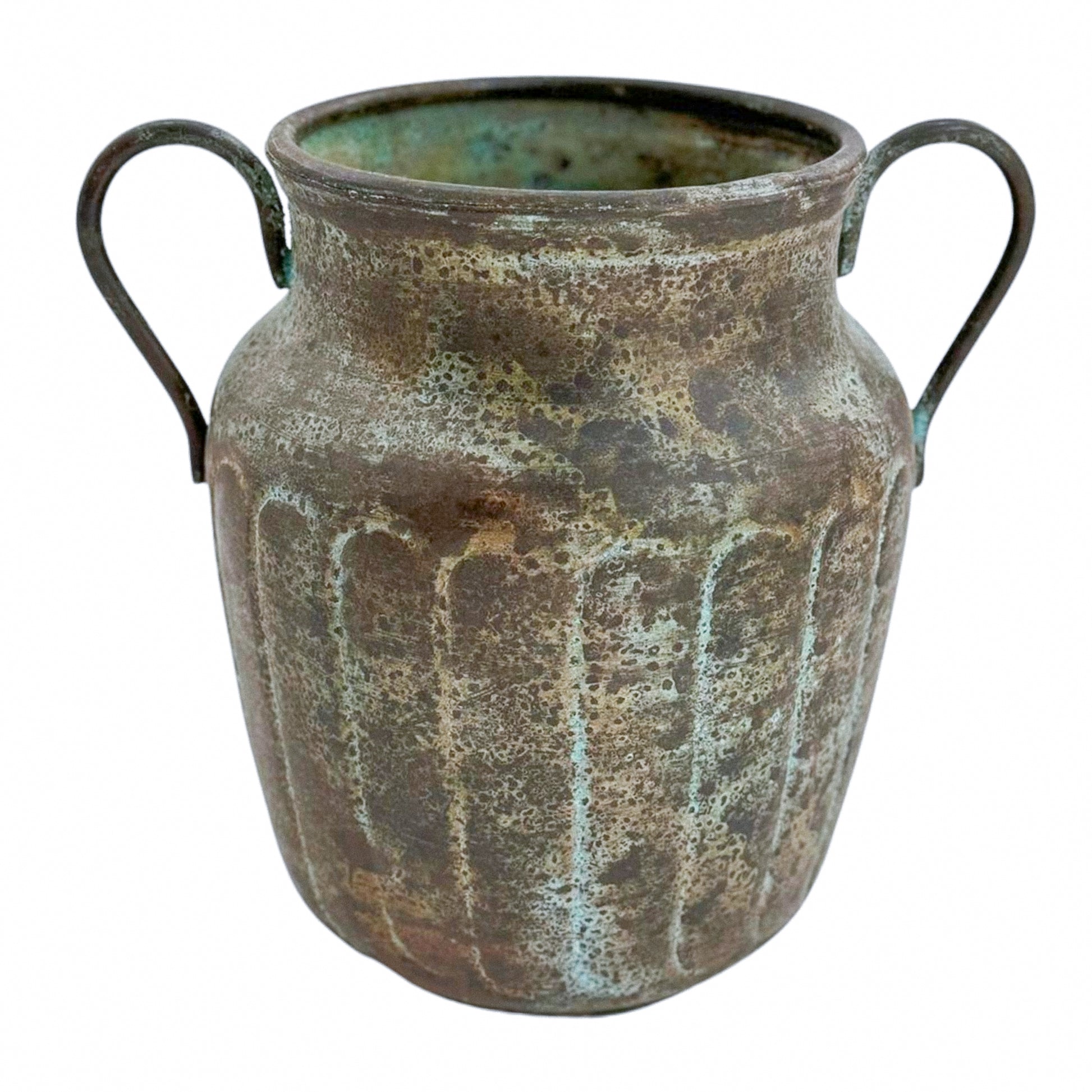 A striking antique copper vessel aged to perfection, with vertical scalloped ridges and an enviable patina that only time can create. The surface is richly mottled with green and turquoise oxidation, softening the industrial strength of its form. Flared at the lip with delicately curved side handles, it reads somewhere between ancient artifact and sculptural accent. Ideal as a standalone statement or holding tall branches in a coastal entryway.