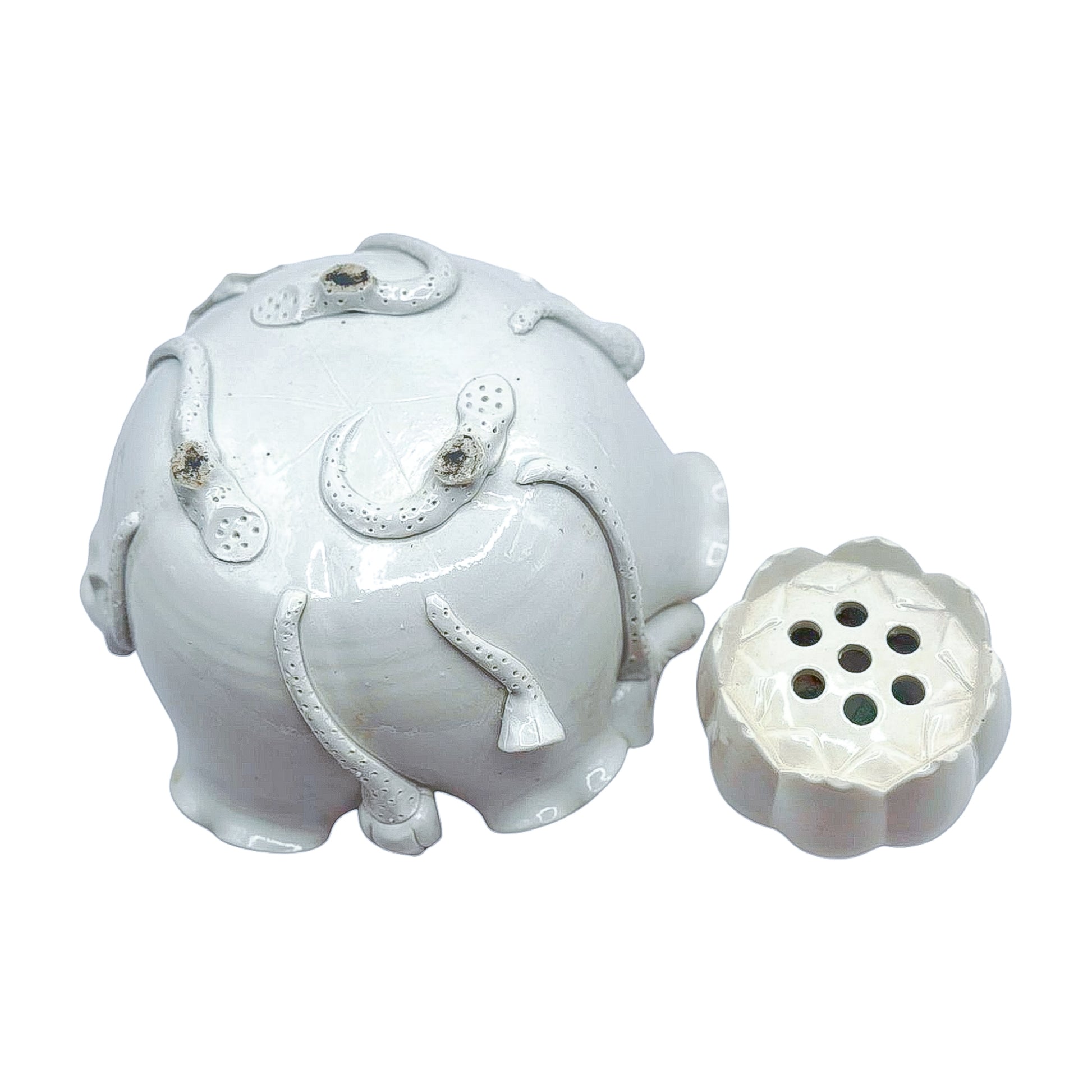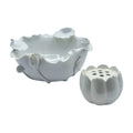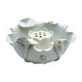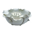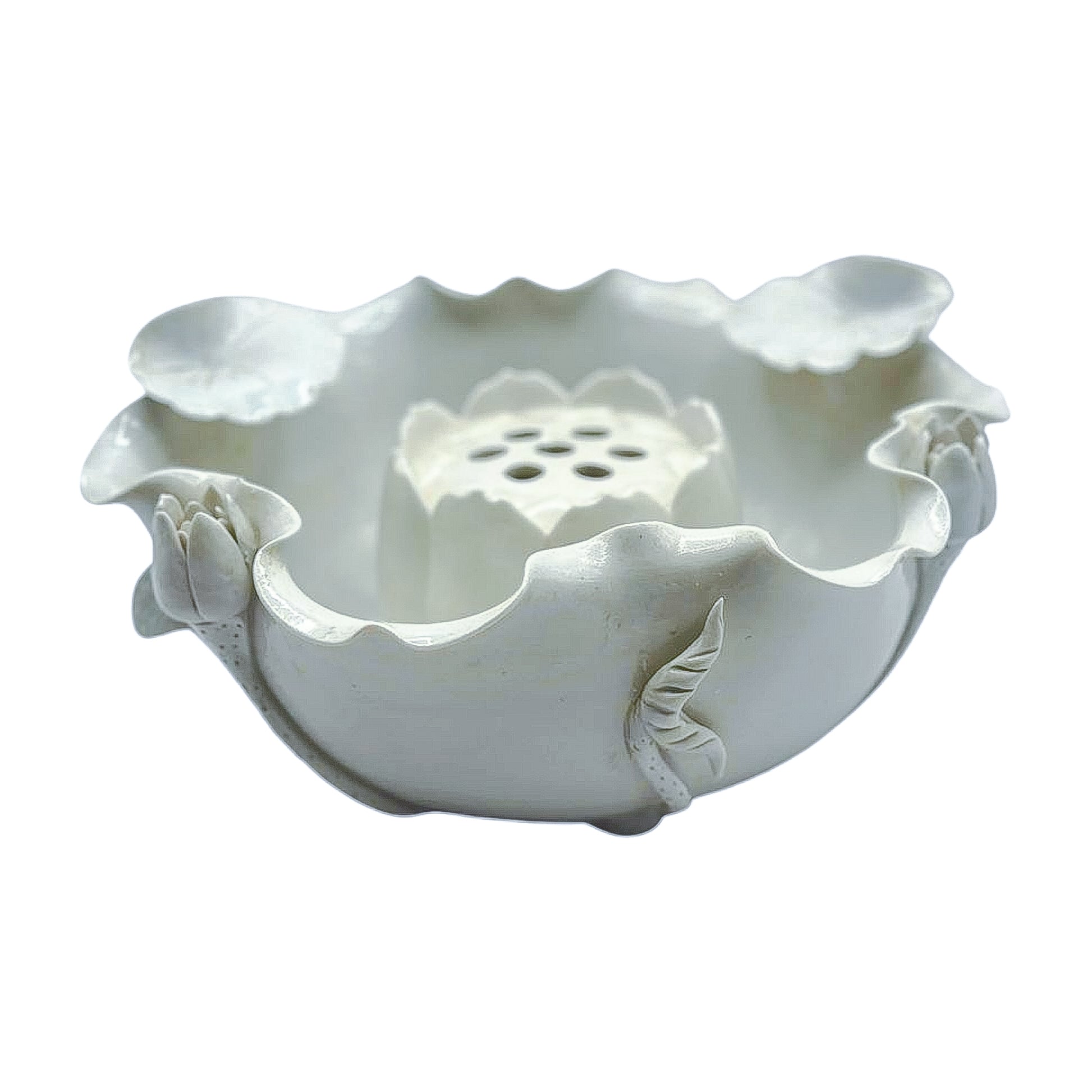An elegant Blanc de Chine lotus-form bowl with a sculptural pierced frog insert at center. The soft white glaze highlights the raised lotus leaves and gently ruffled rim. Designed for floral arranging but just as striking left empty. The form catches the light beautifully and layers easily with both modern and traditional pieces. Lovely on a coffee table, entry console, or open shelving.