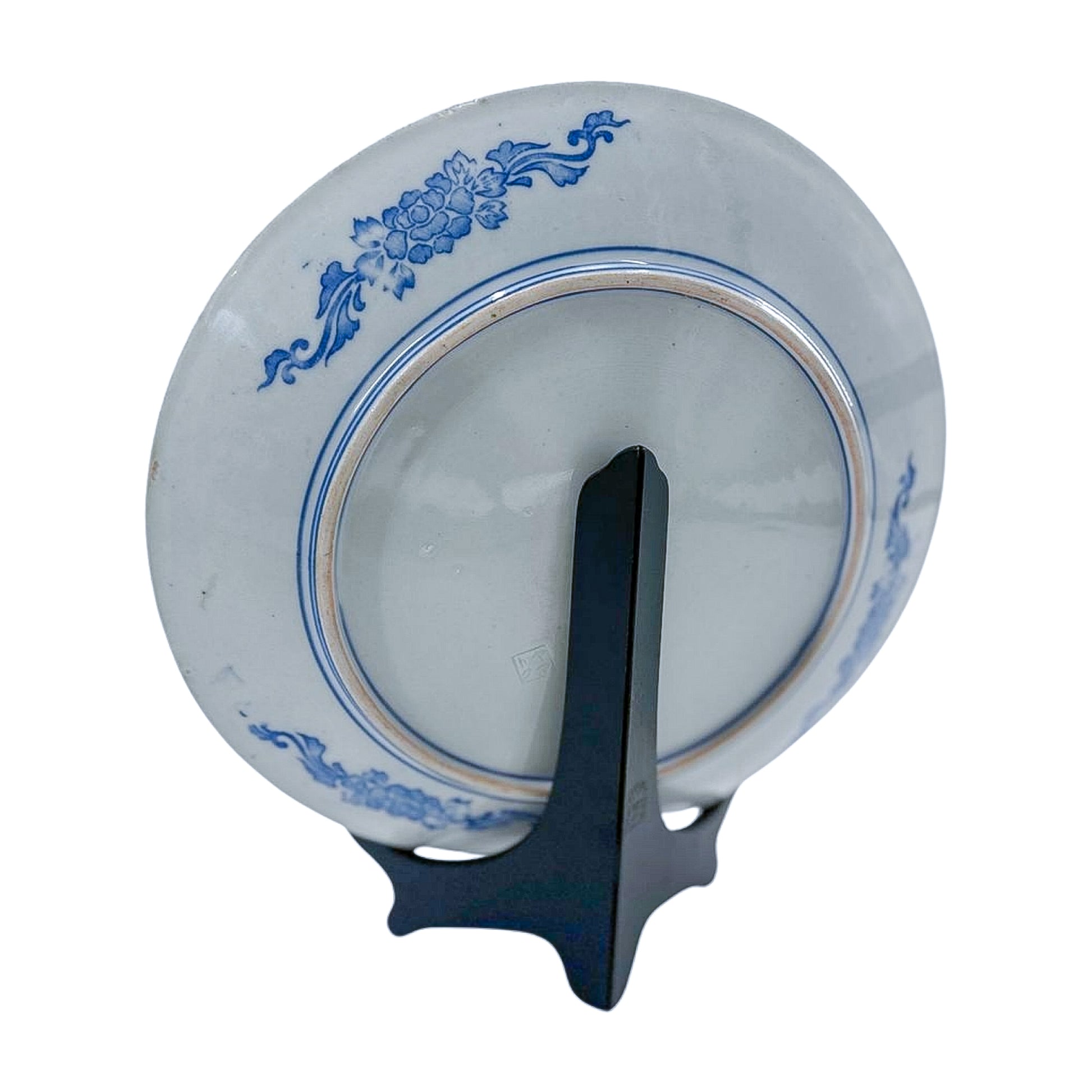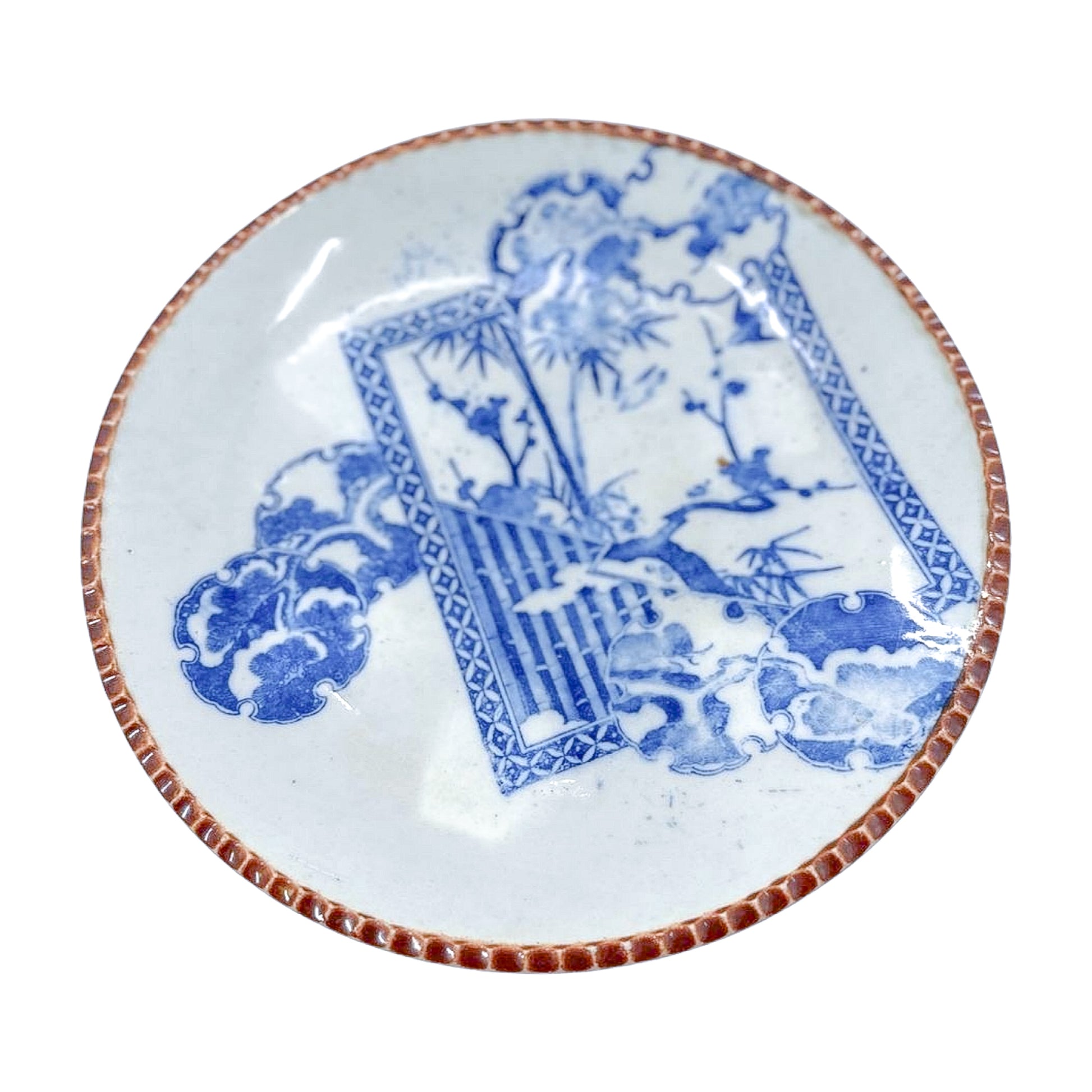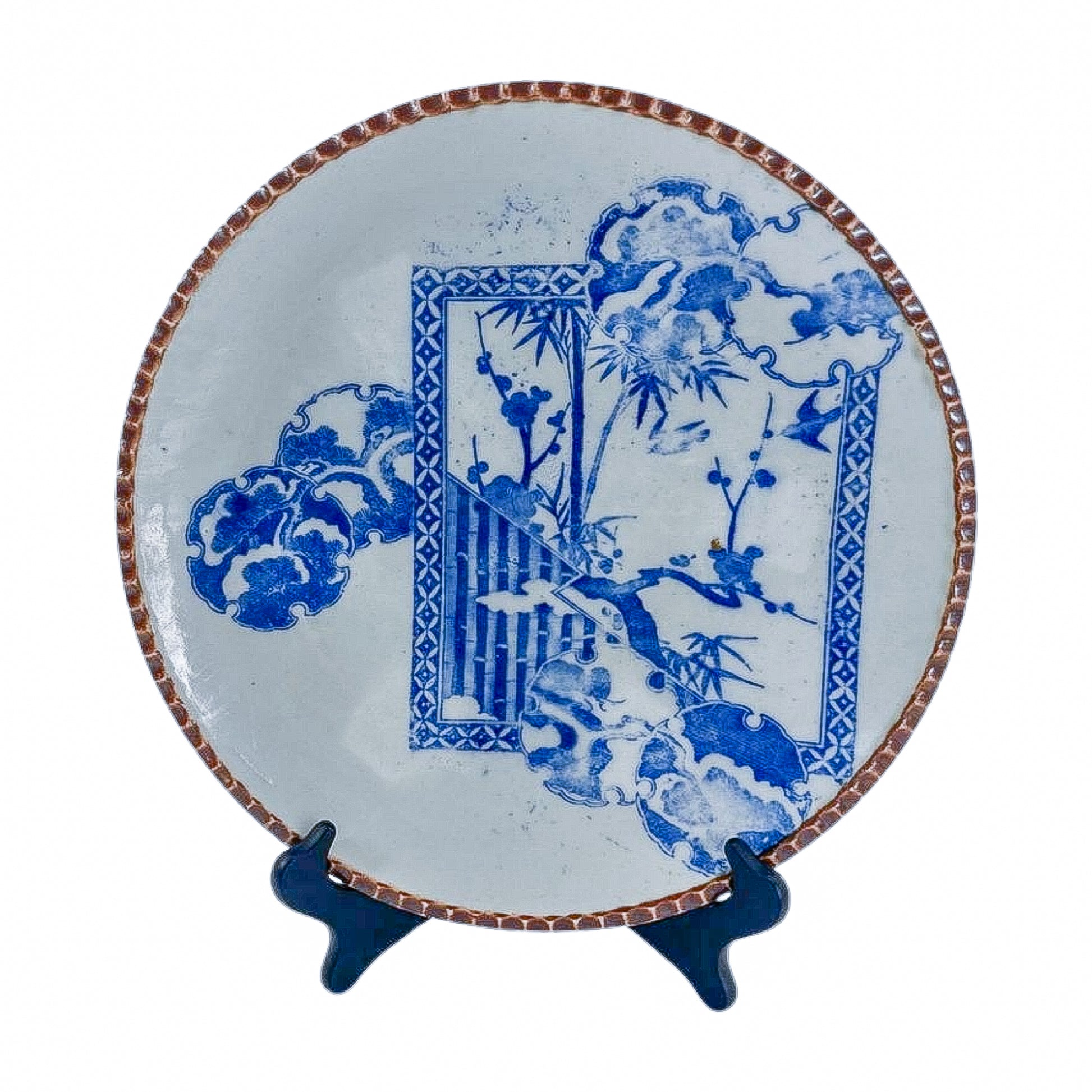 Not your average blue-and-white. This antique Imari plate features a striking offset cartouche with bamboo, plum blossoms, and painterly clouds—all bordered with a rich rust-toned rim. It’s asymmetric in the best way, and perfect hung on a wall or layered into a plate display.
