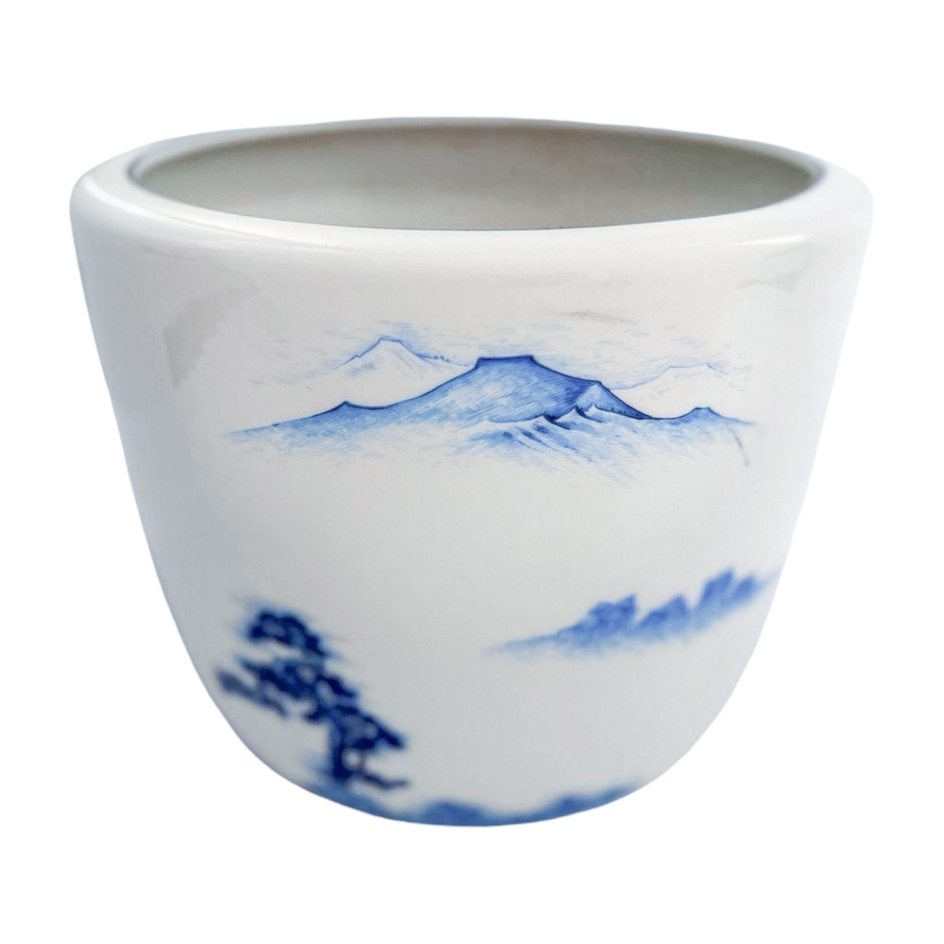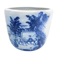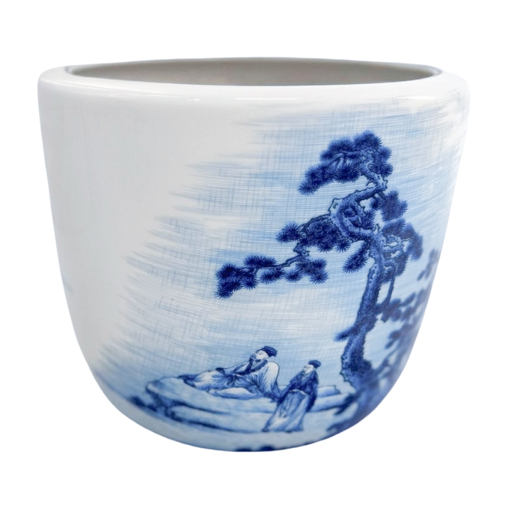 Not quite planter, not quite sculpture—this hand-painted blue and white cachepot reads like a scroll wrapped in porcelain. The scenes are quiet: scholars beneath pine trees, mist drifting over mountains. Look closer and you’ll catch the painter’s crosshatched background, a subtle texture that gives the glaze its softness. No drainage hole, which makes it ideal for drop-in pots or as a cache for orchids and ferns.