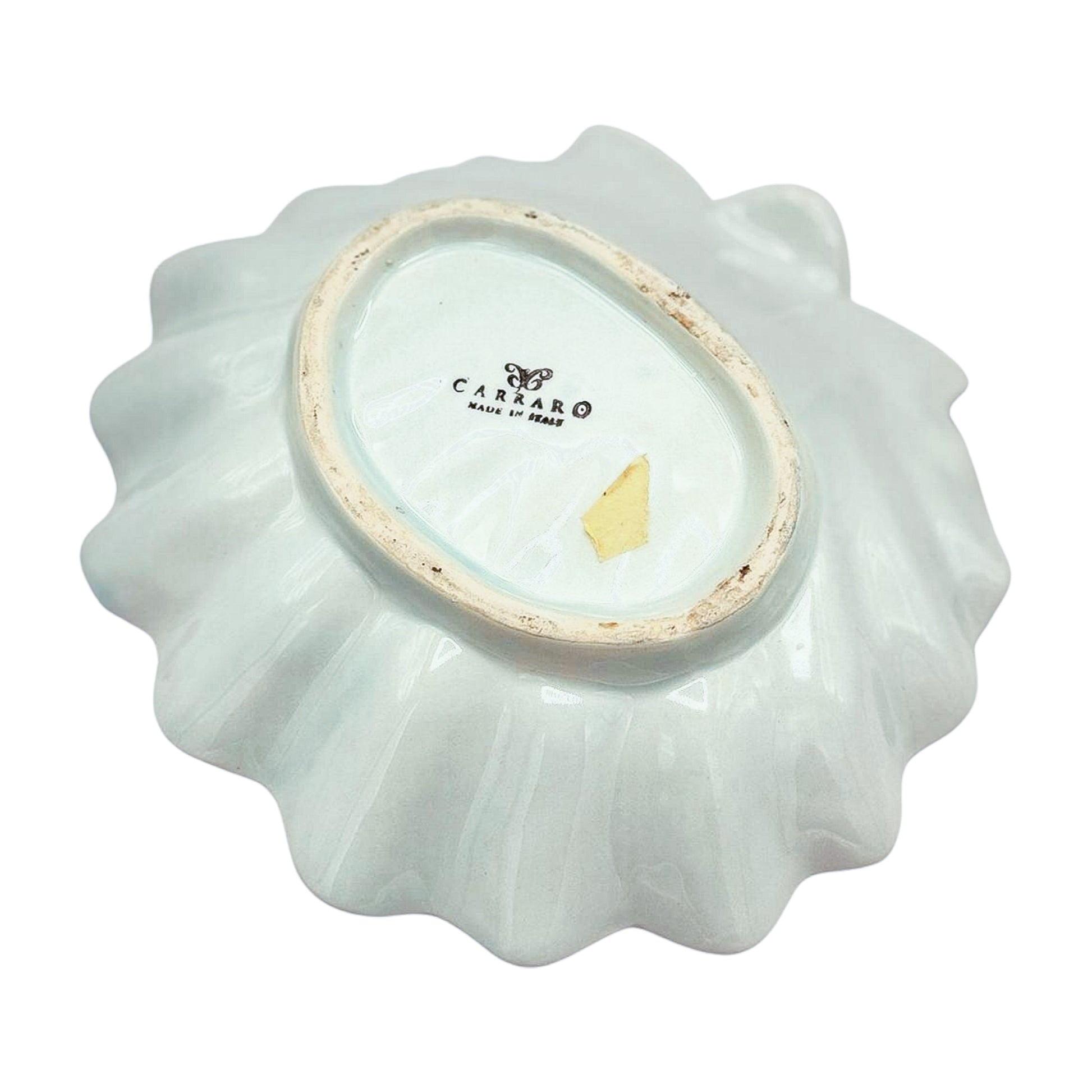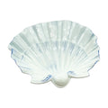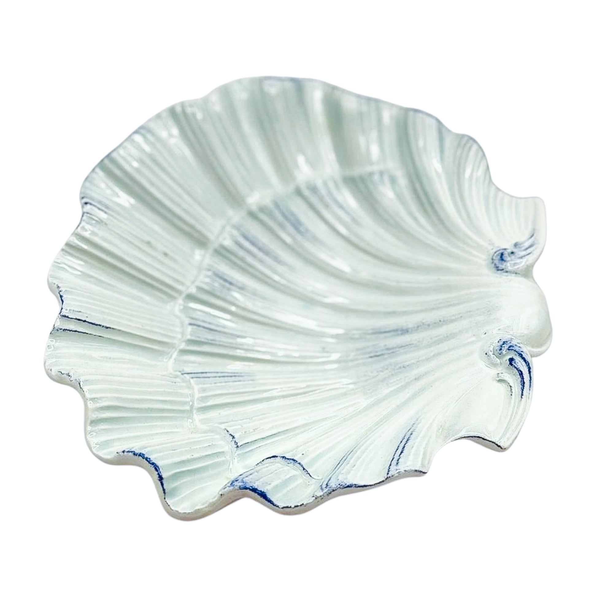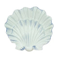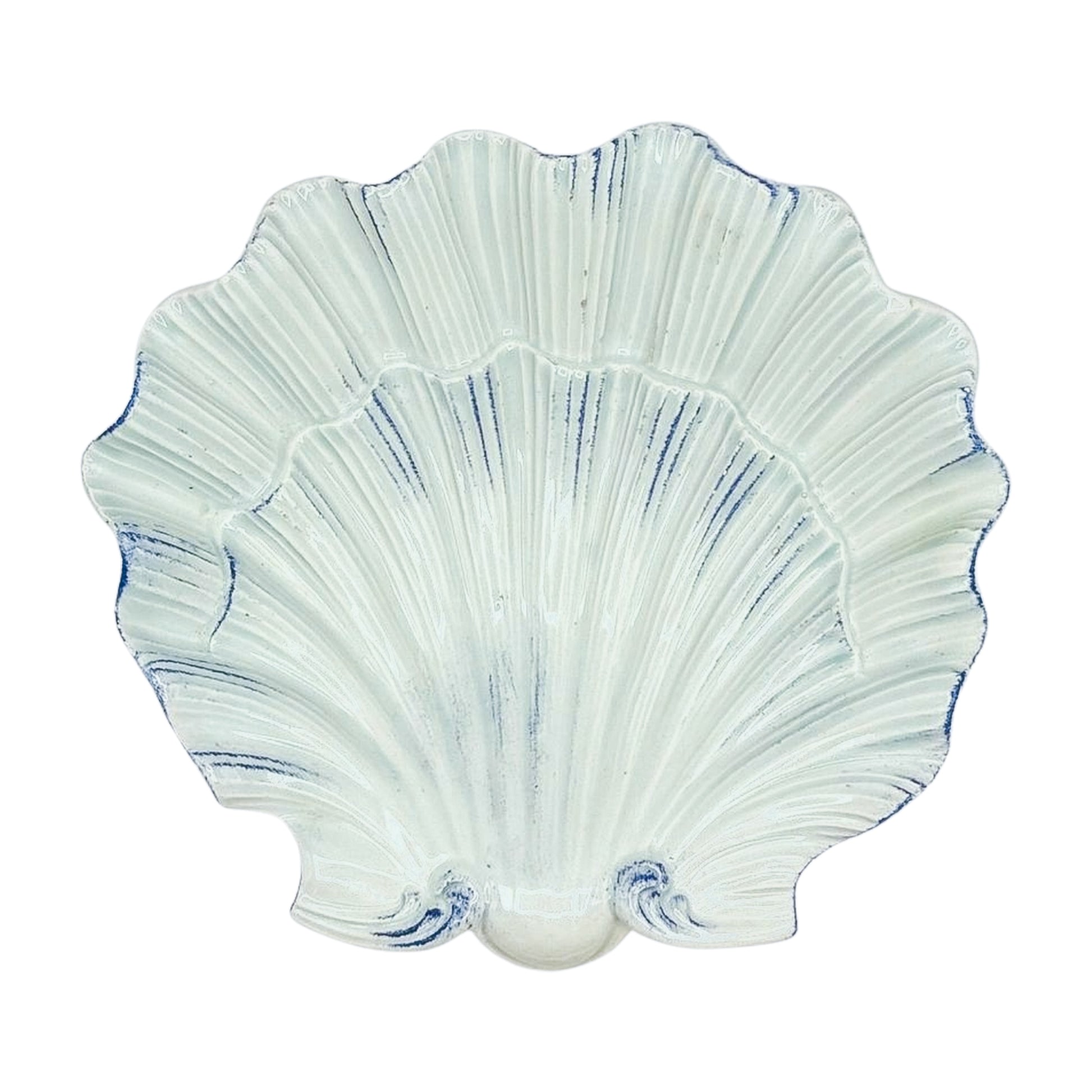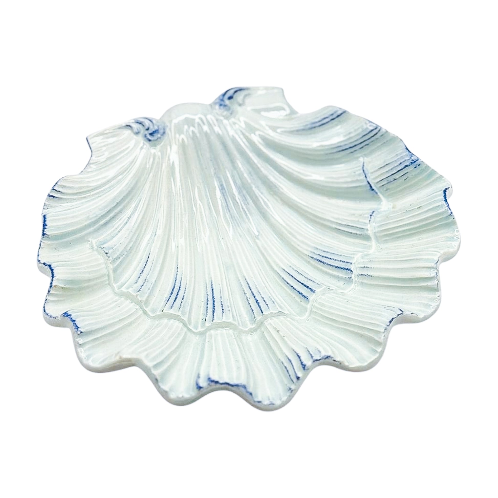A textured ceramic plate in the shape of a scallop shell with soft blue feathered accents on creamy white glaze. Equally charming as a serving piece, catchall, or wall-hung moment.