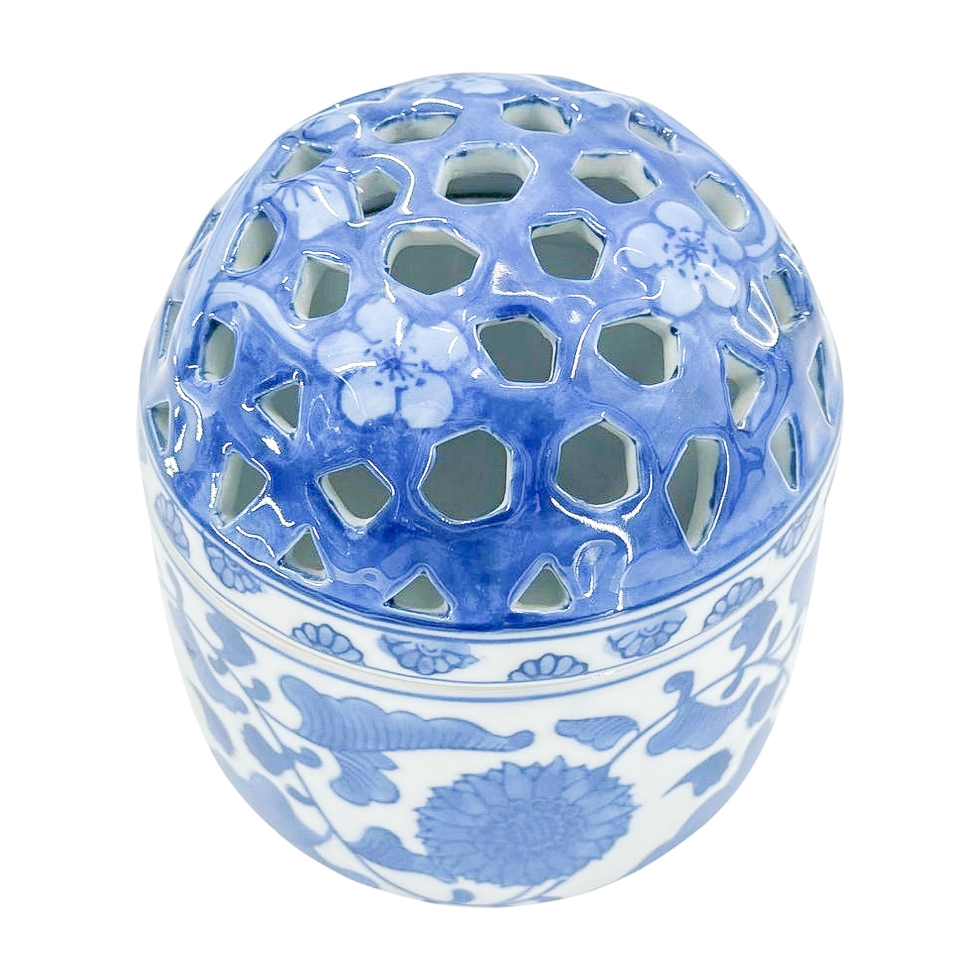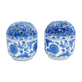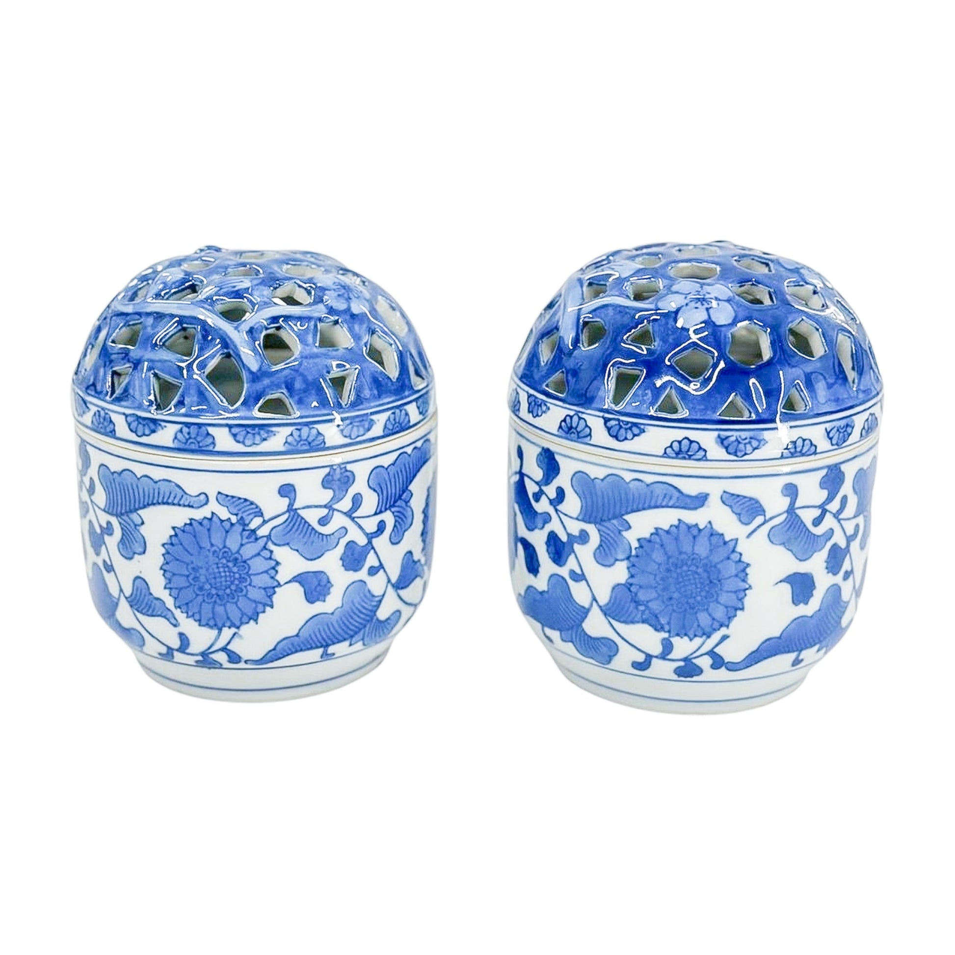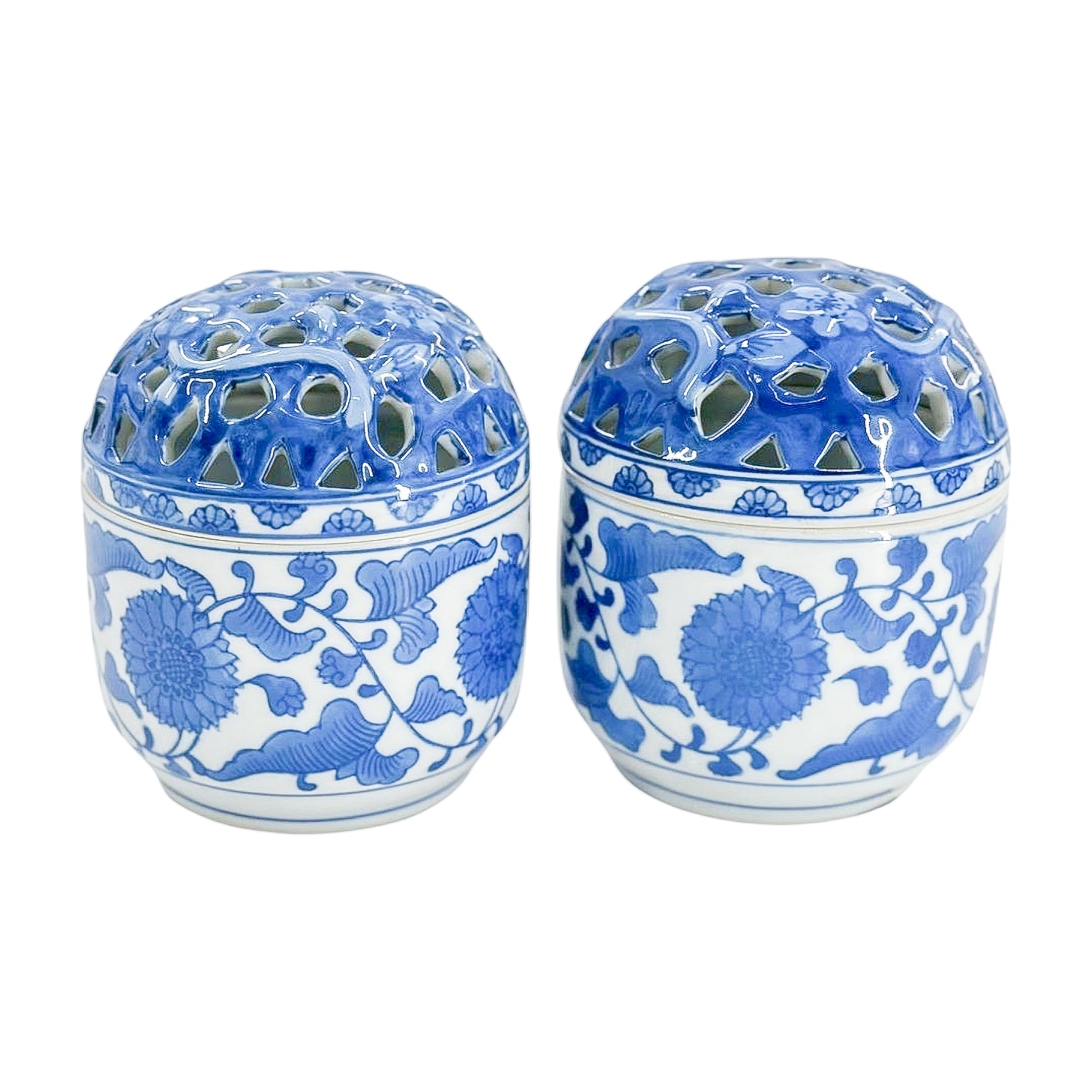 A chinoiserie lover’s dream. This pair of pierced porcelain flower frogs is dressed in classic cobalt and white, with traditional florals and cutout tops perfect for blooms—or just for styling. Use them as cachepots, brush holders, or sculptural accents that feel quietly luxe.