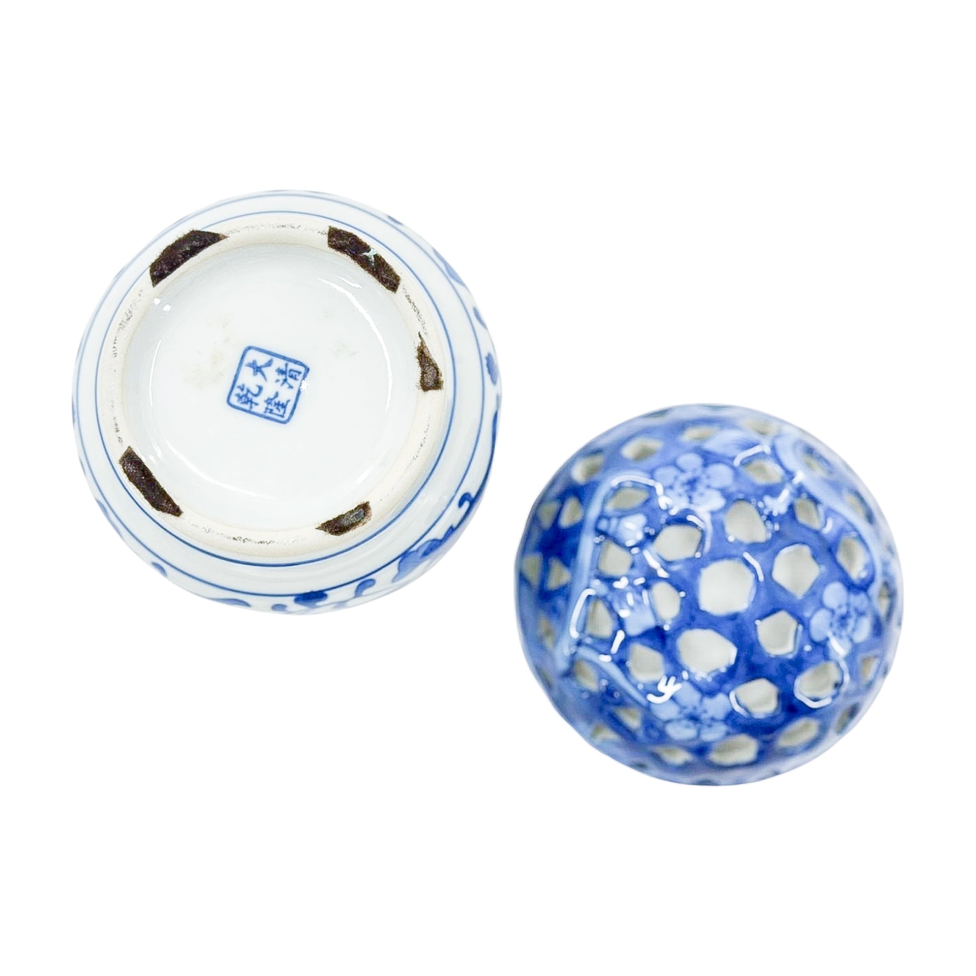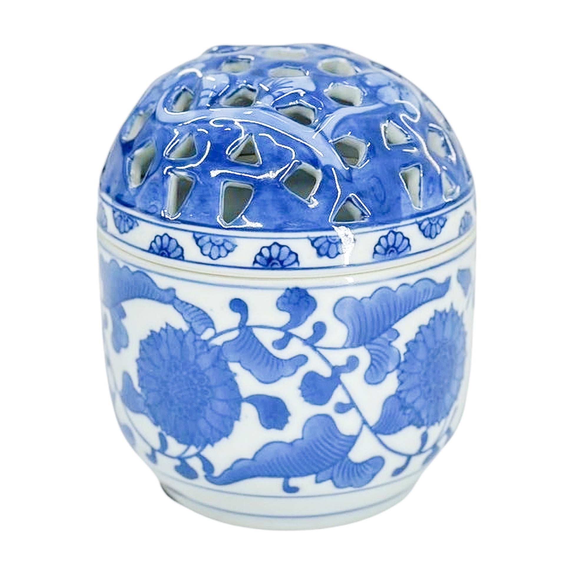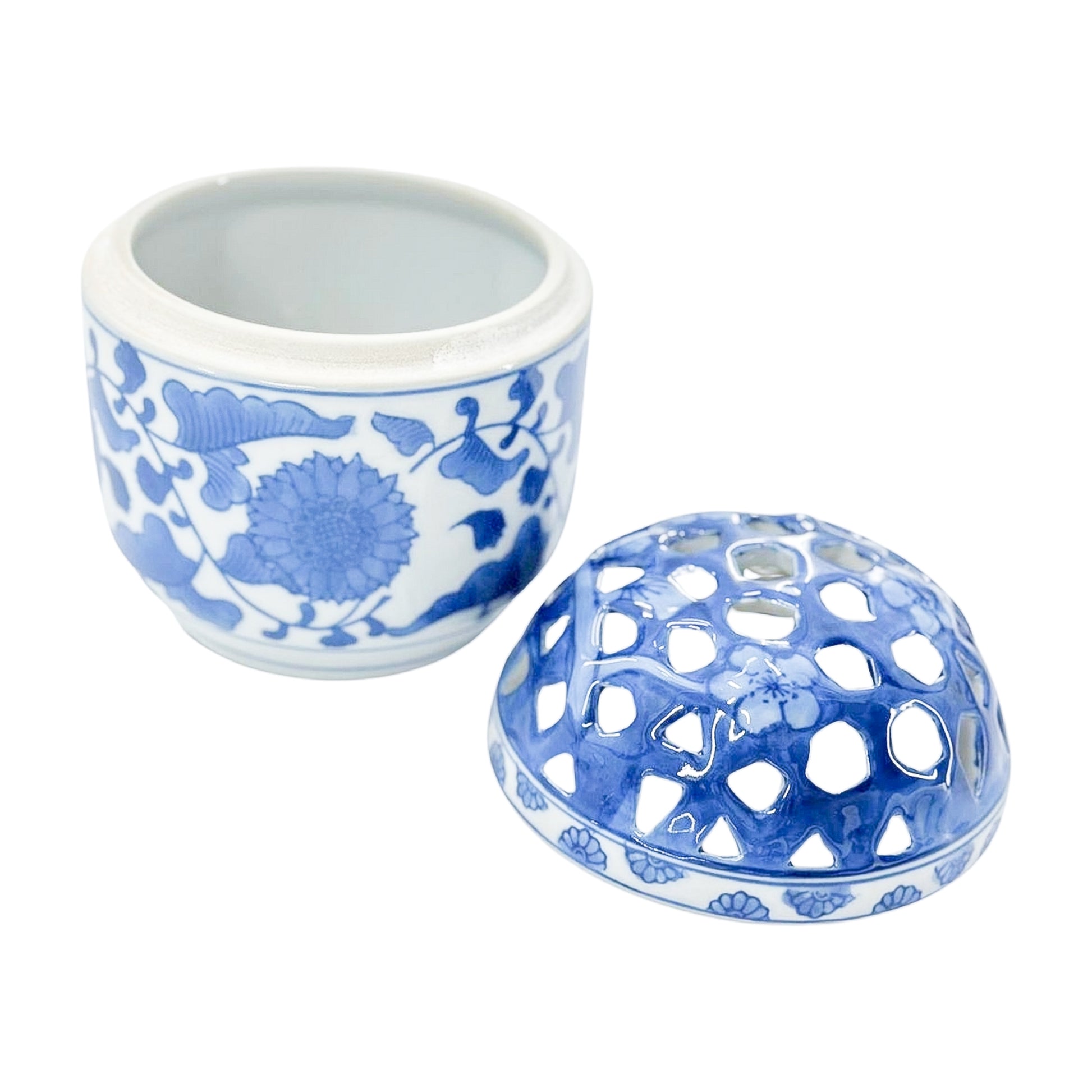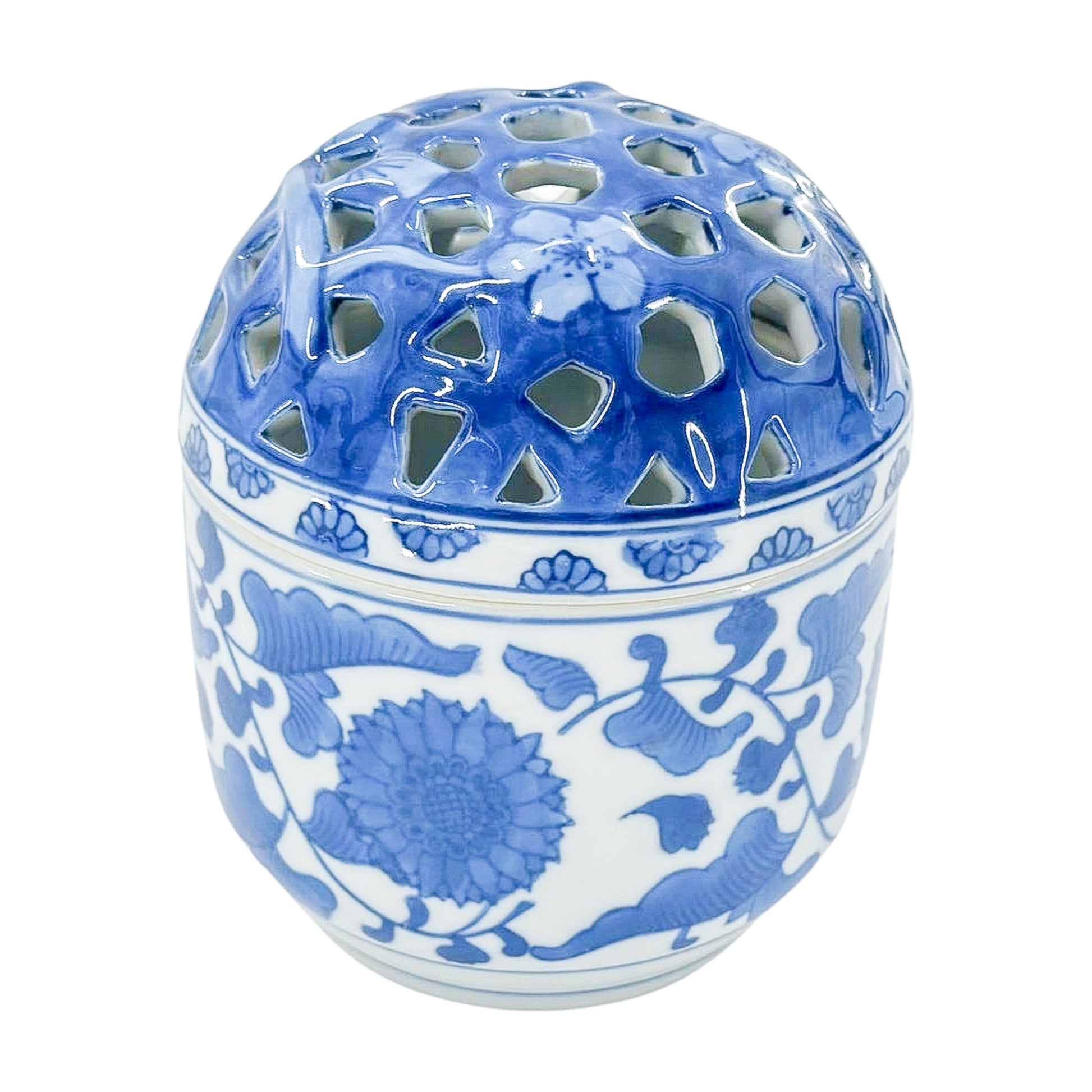 A chinoiserie lover’s dream. This pair of pierced porcelain flower frogs is dressed in classic cobalt and white, with traditional florals and cutout tops perfect for blooms—or just for styling. Use them as cachepots, brush holders, or sculptural accents that feel quietly luxe.