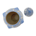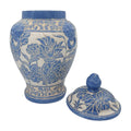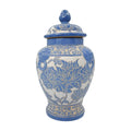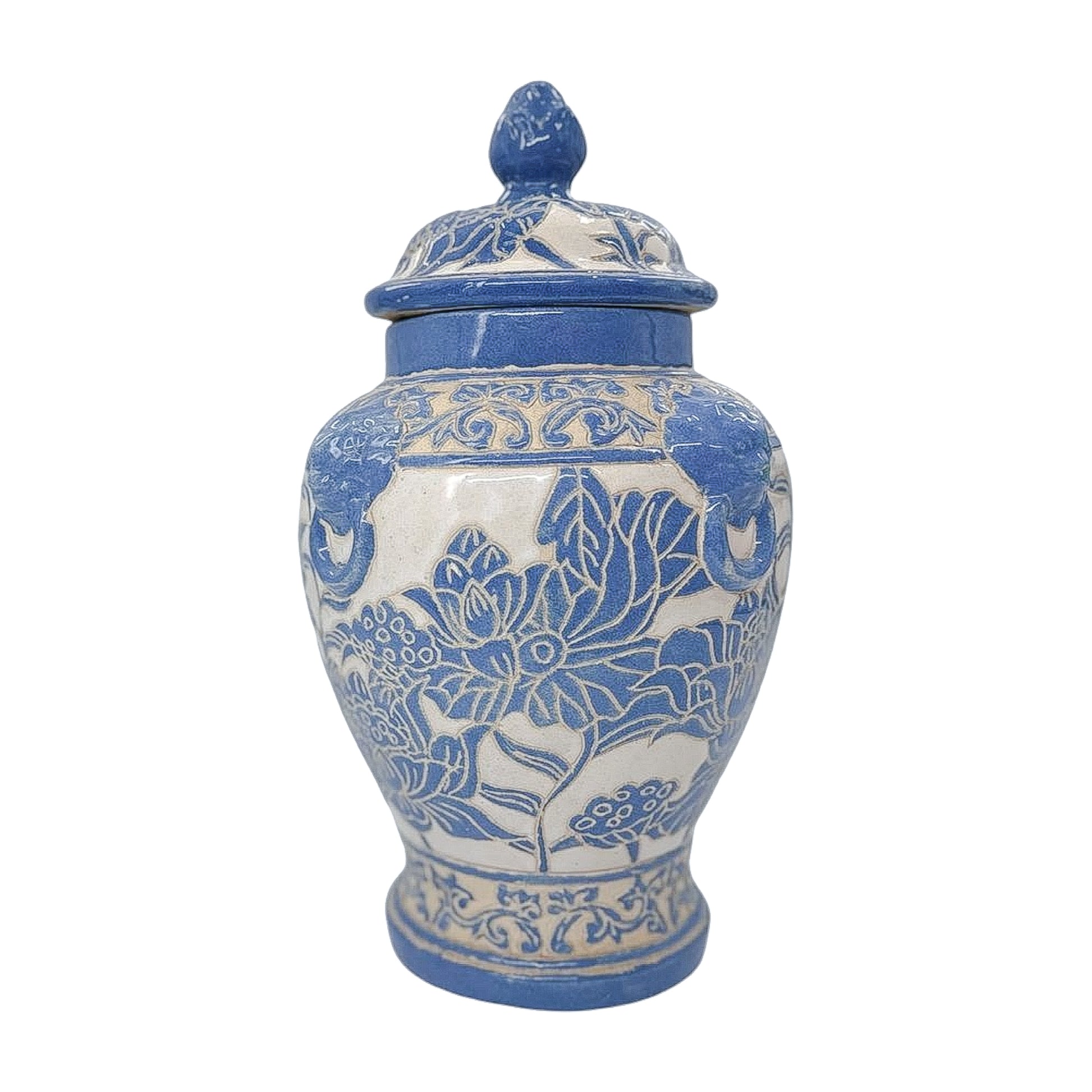 A substantial blue and white lidded jar with deeply carved floral motifs and a beautifully textured surface. The glaze has soft tonal variation, giving the piece depth and warmth. The generous scale makes it a standout on a console, kitchen island, or bookshelf. A classic shape that plays well in both traditional and modern spaces.