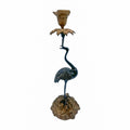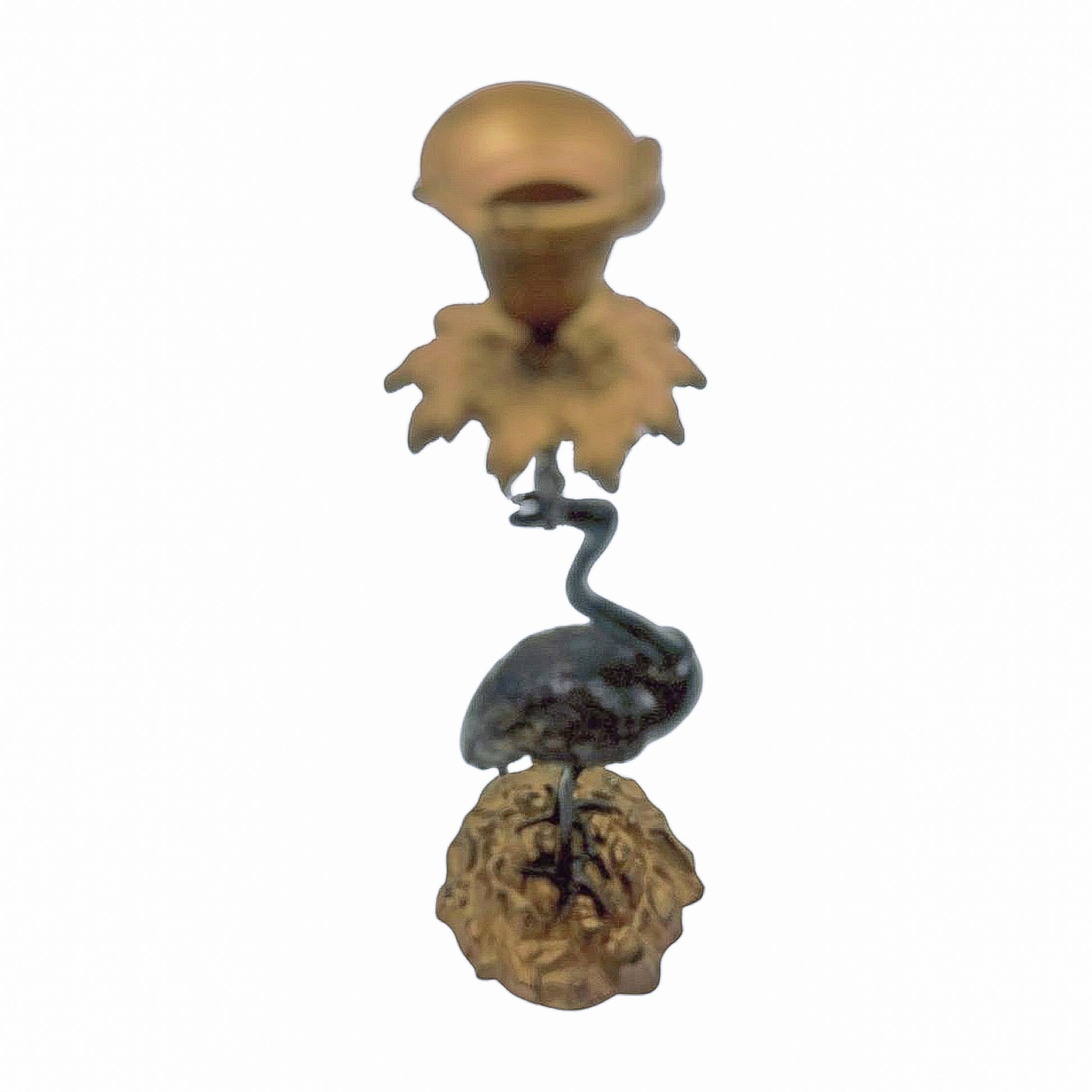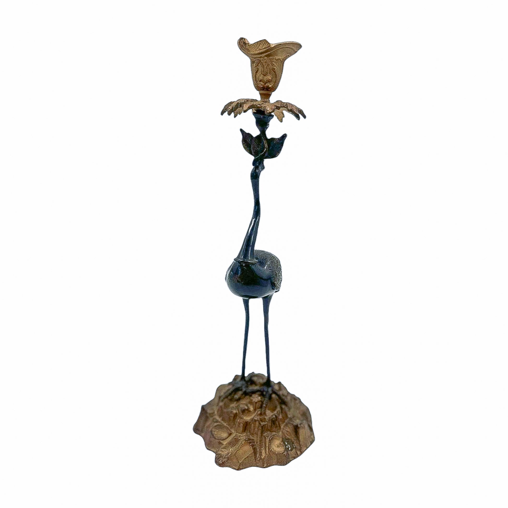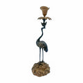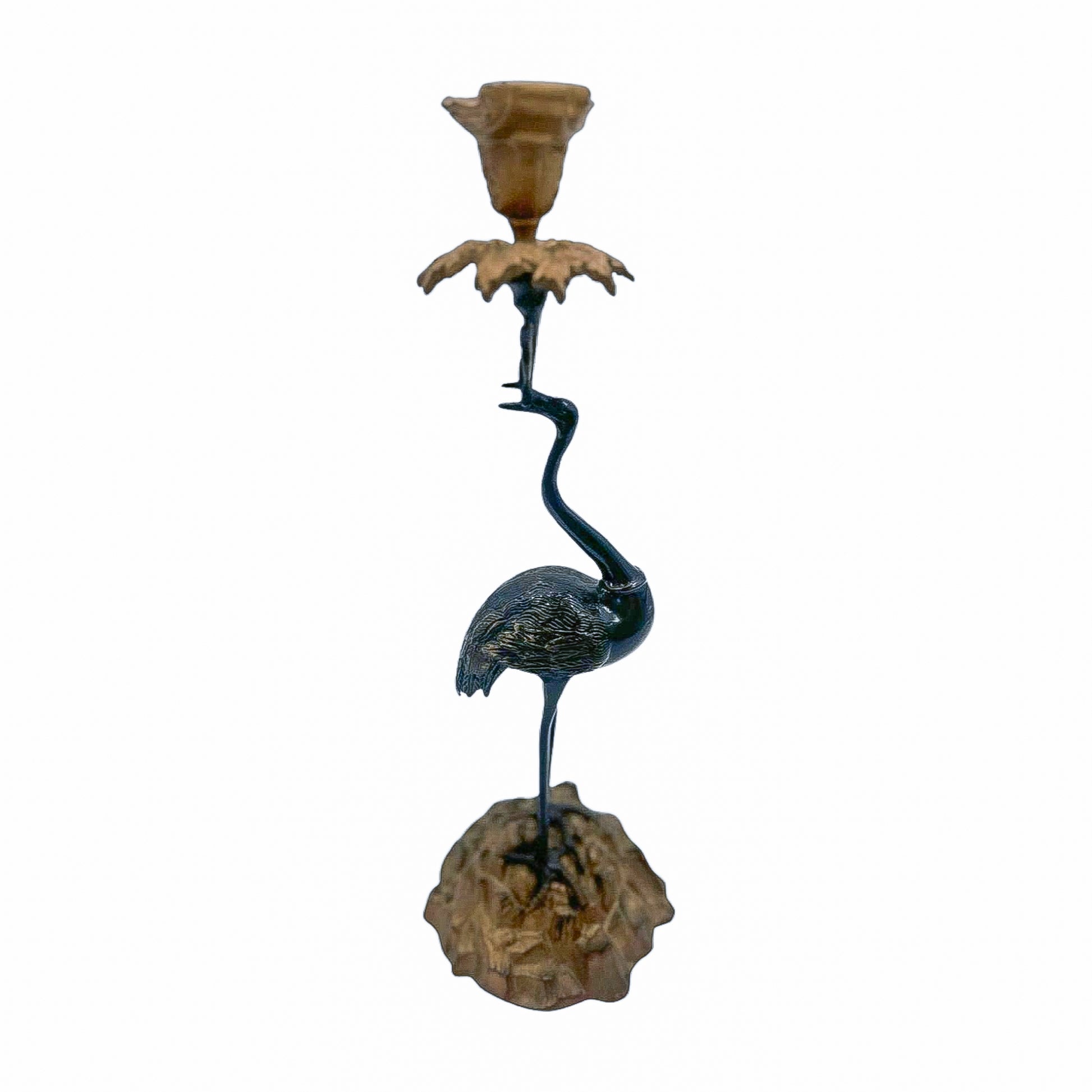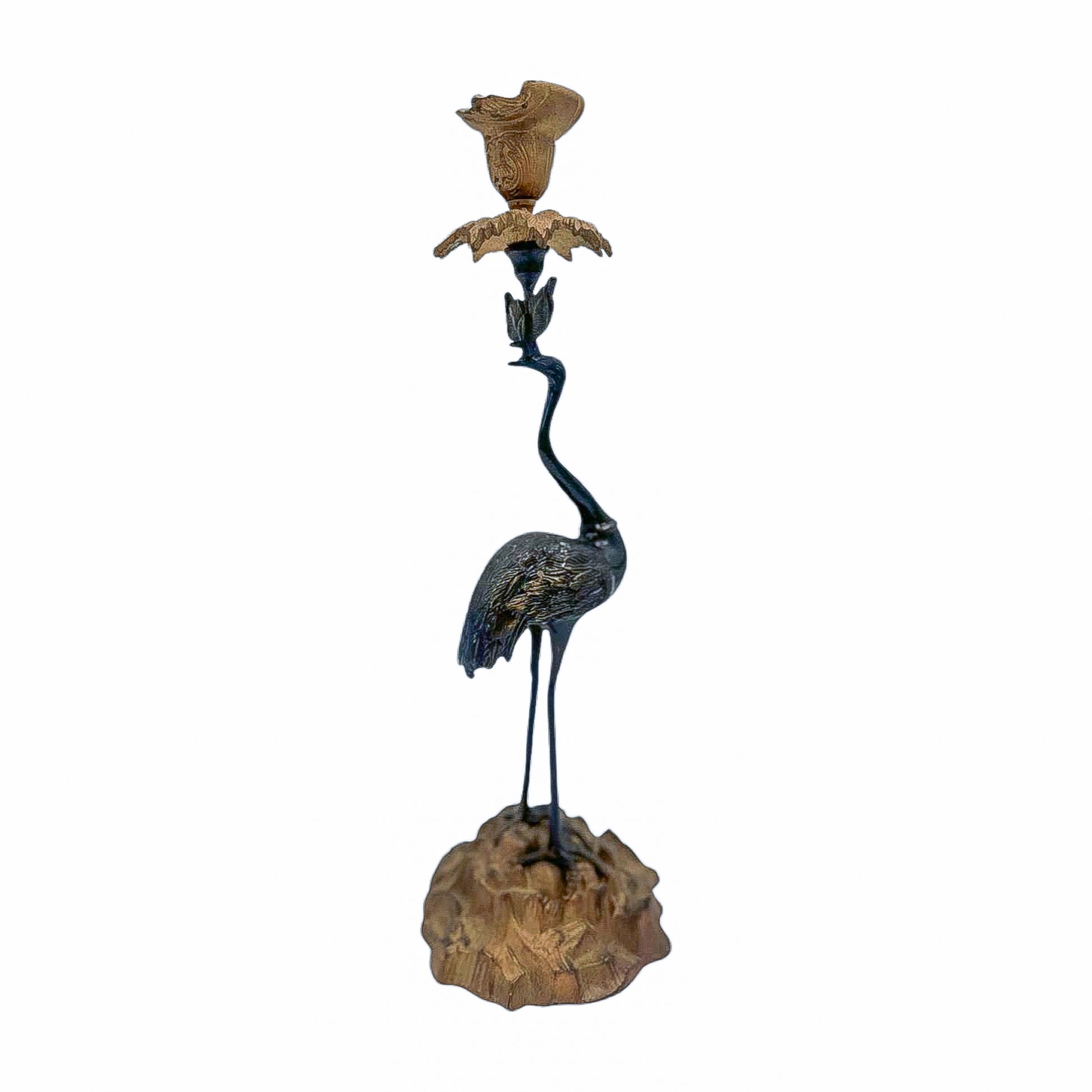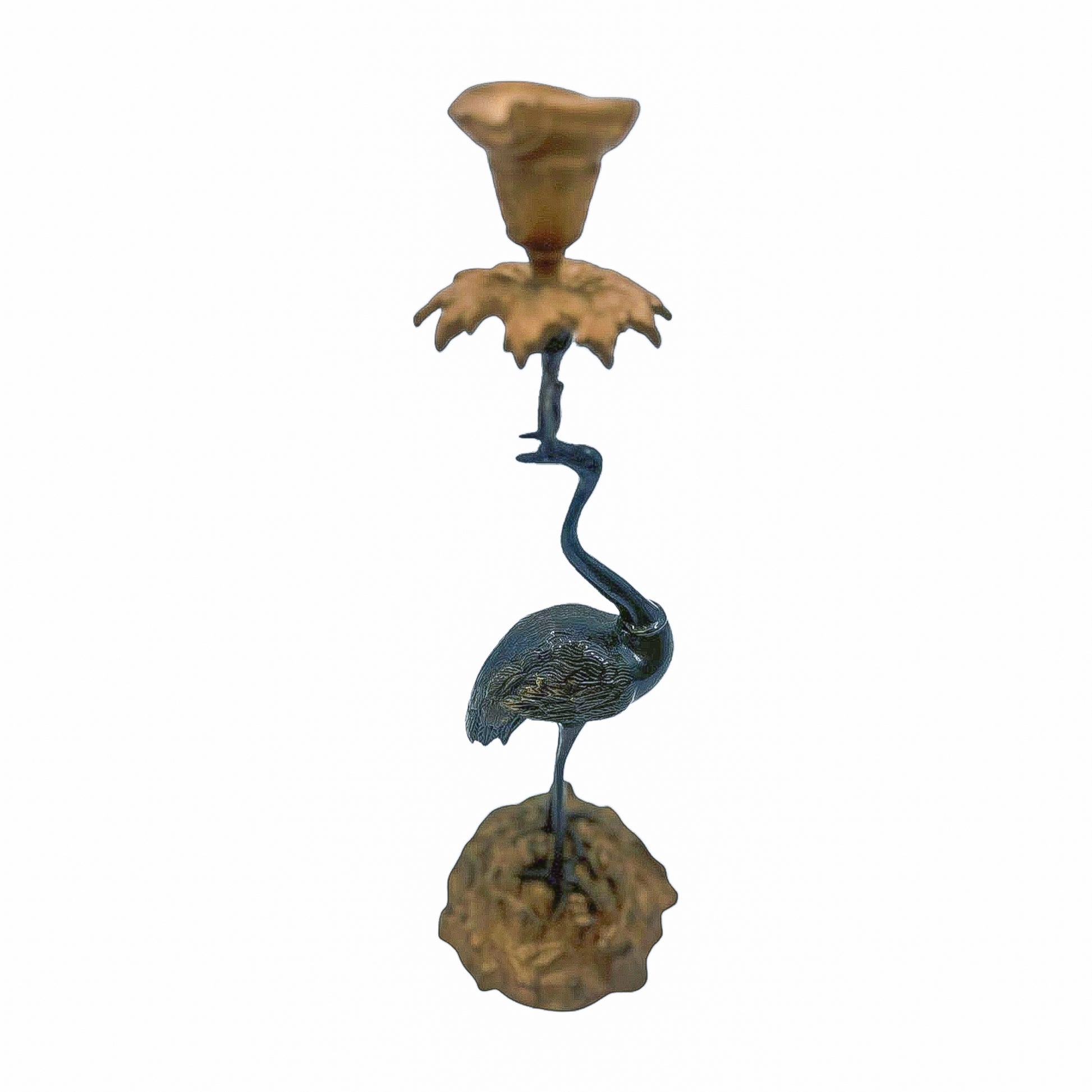 A tall, elegant silhouette with unexpected edge. This bronze candlestick takes the form of a crane perched on rocky terrain, topped with a leafy lotus bloom to hold your taper. Dramatic, a little mysterious, and guaranteed to turn heads on a mantel or dining table.