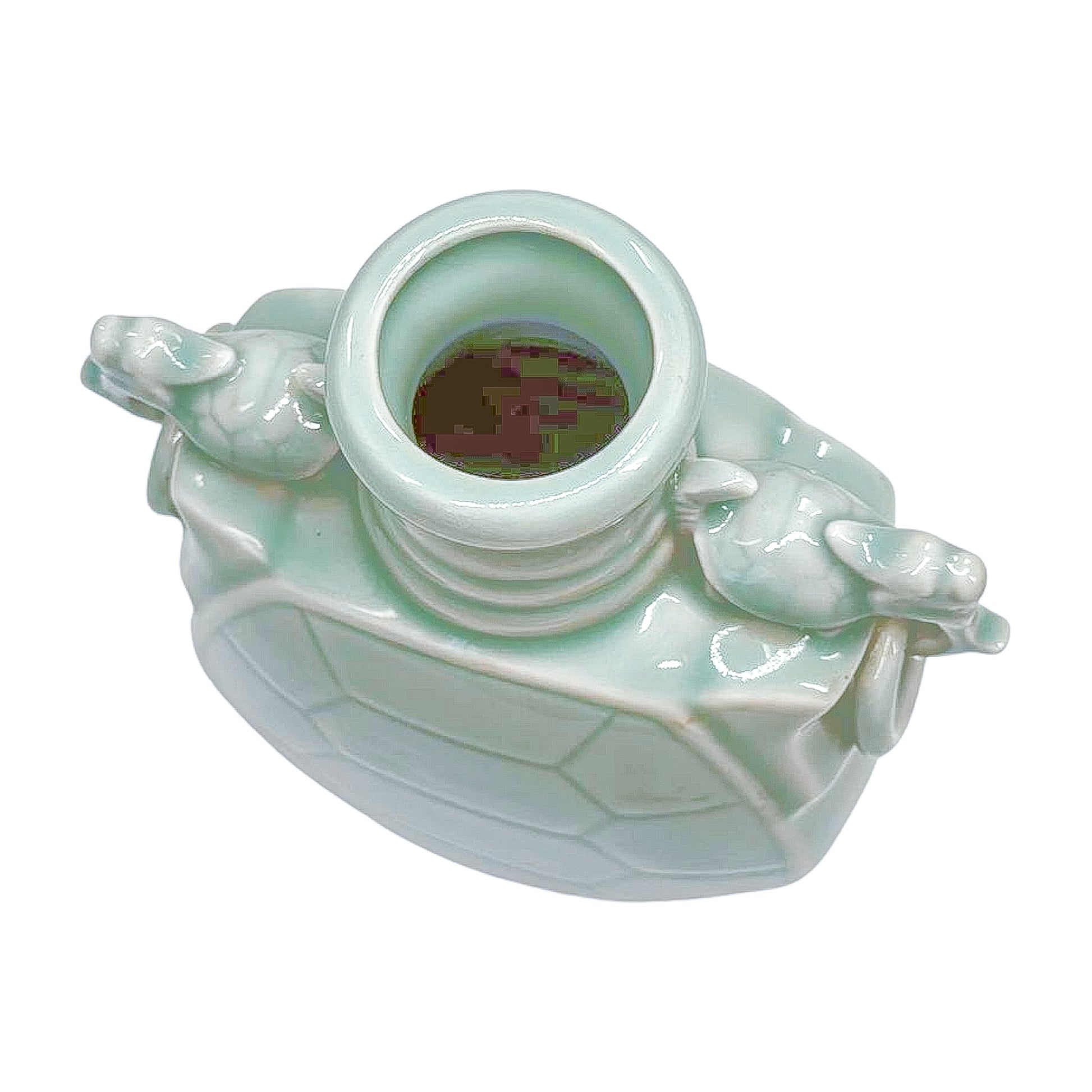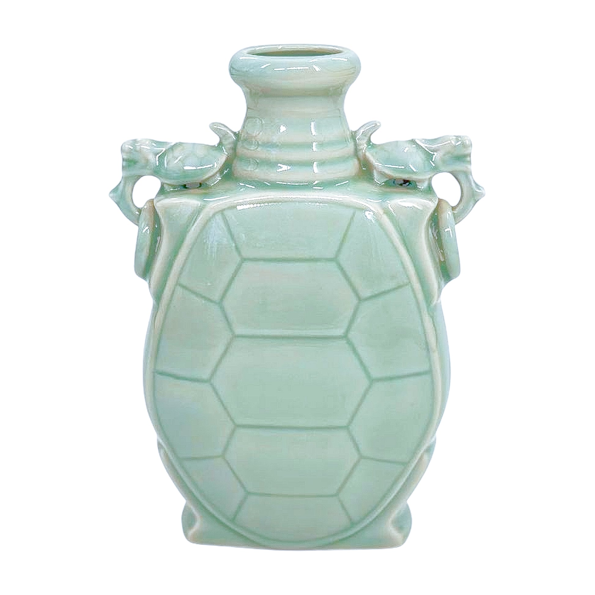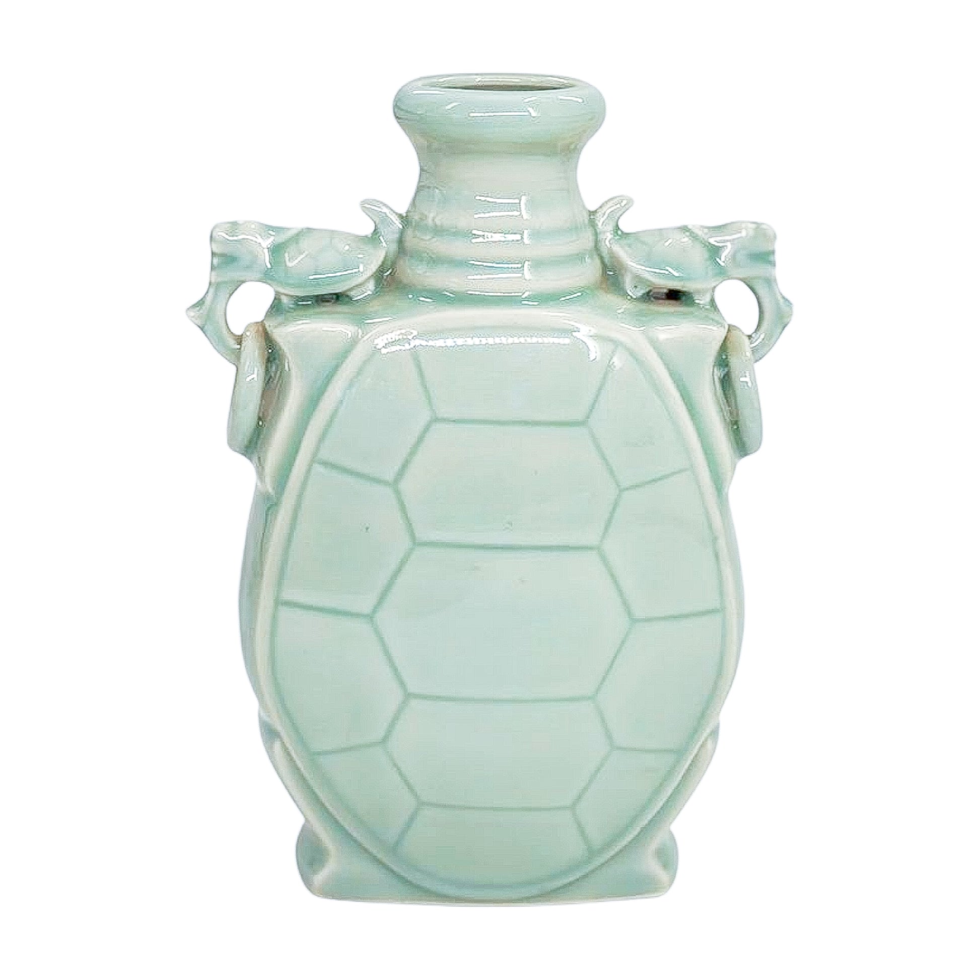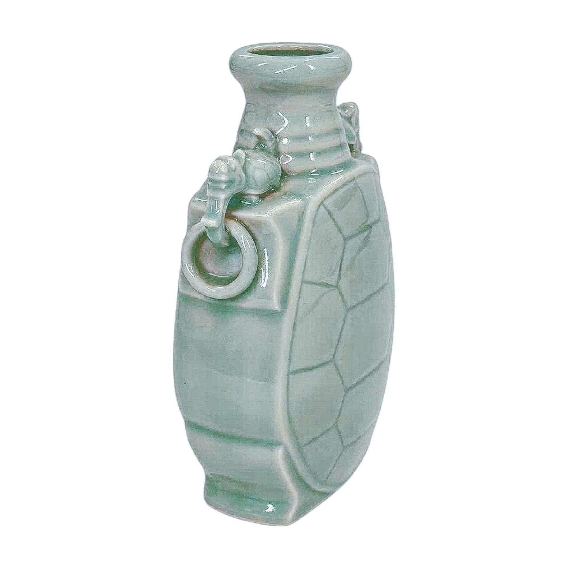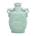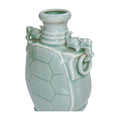 A striking celadon-glazed vase in the form of a turtle shell, complete with sculpted side handles. The pale green glaze pools softly over the surface, highlighting the sculptural details. A conversation piece with presence — perfect on its own or filled with branches or stems.