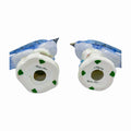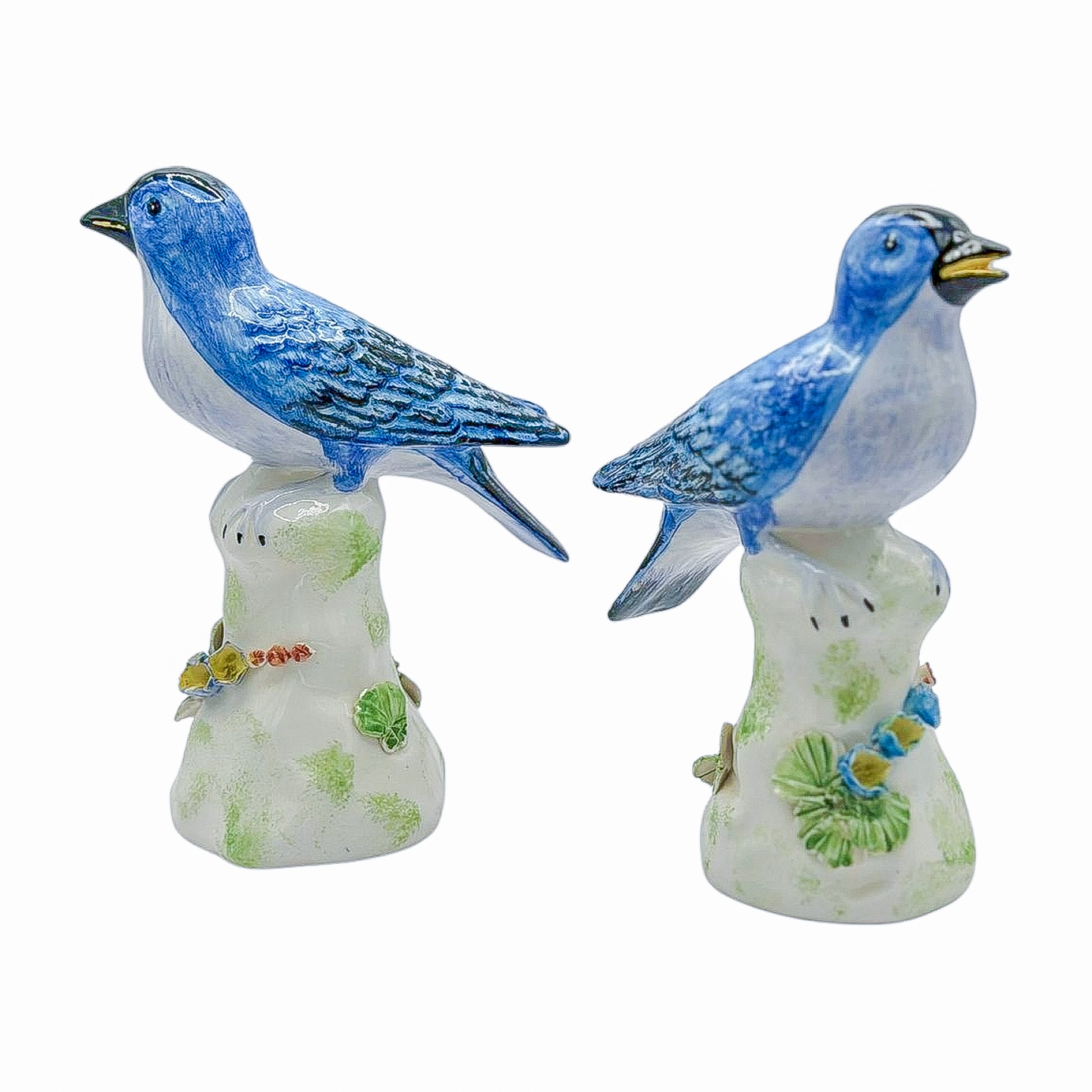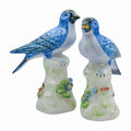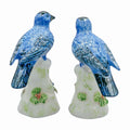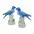 A pair worth chirping about. These painted Chelsea House birds sit perched atop delicate leafy bases, rendered in soft pastel tones with flashes of glossy cobalt. Equal parts elegant and cheeky—they make any tabletop, bookshelf, or vanity a bit more delightful.