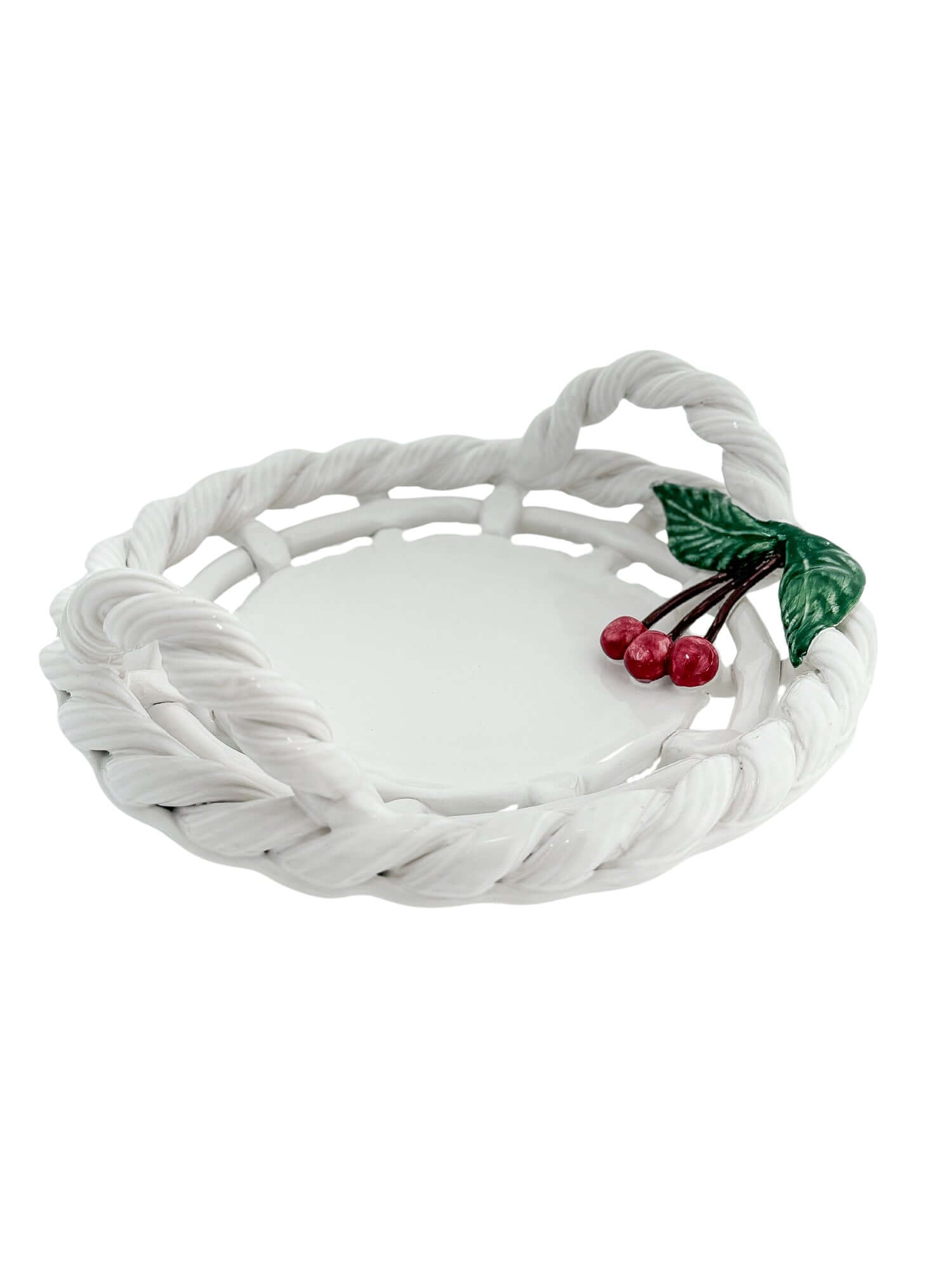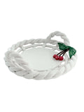 A sweetly sculpted tray with thick, twisted ceramic “rope” forming its open basket edge. One corner is adorned with a trio of glossy cherries and green leaves—just the right wink of color. Charming as a catchall or small serving piece: classic, but not too serious.