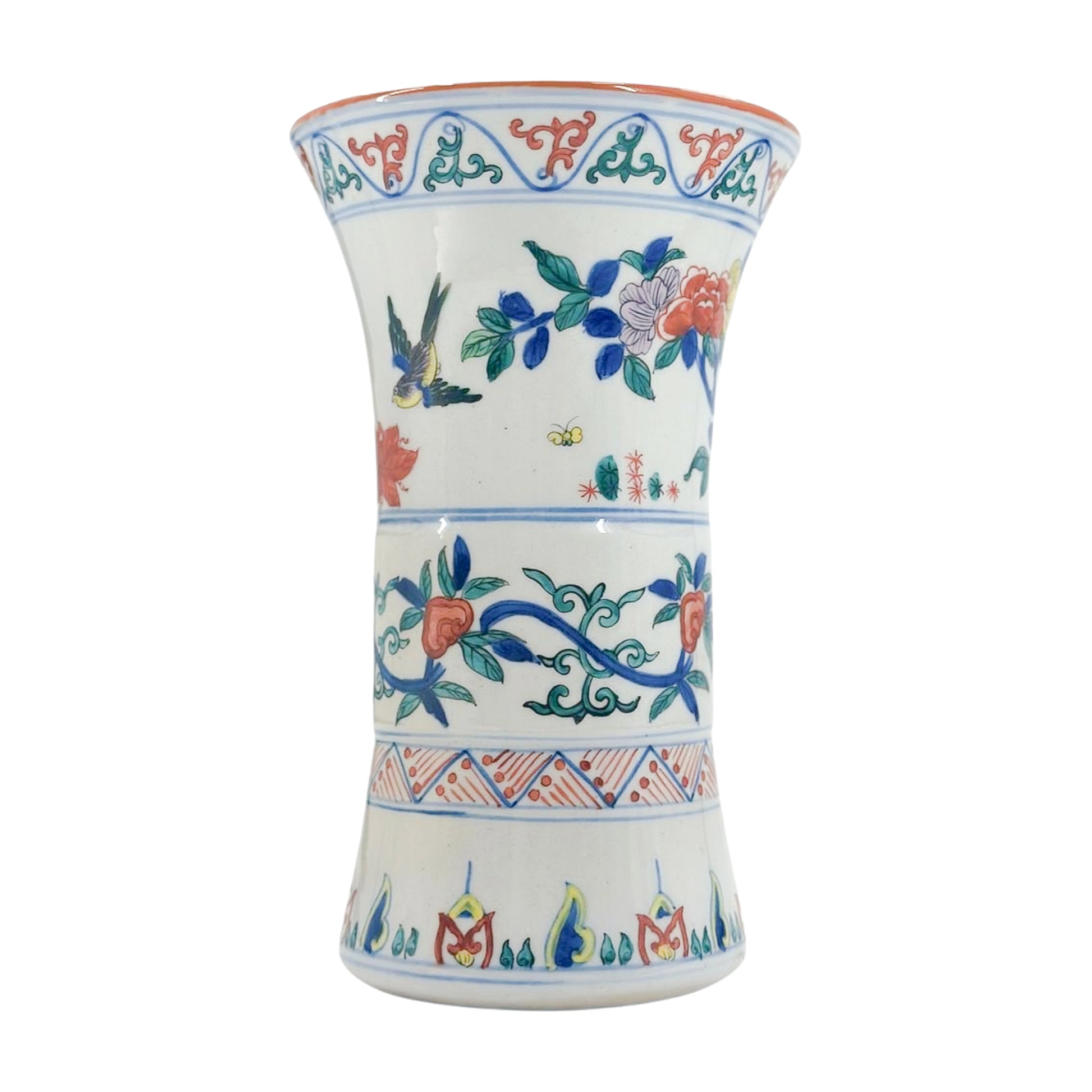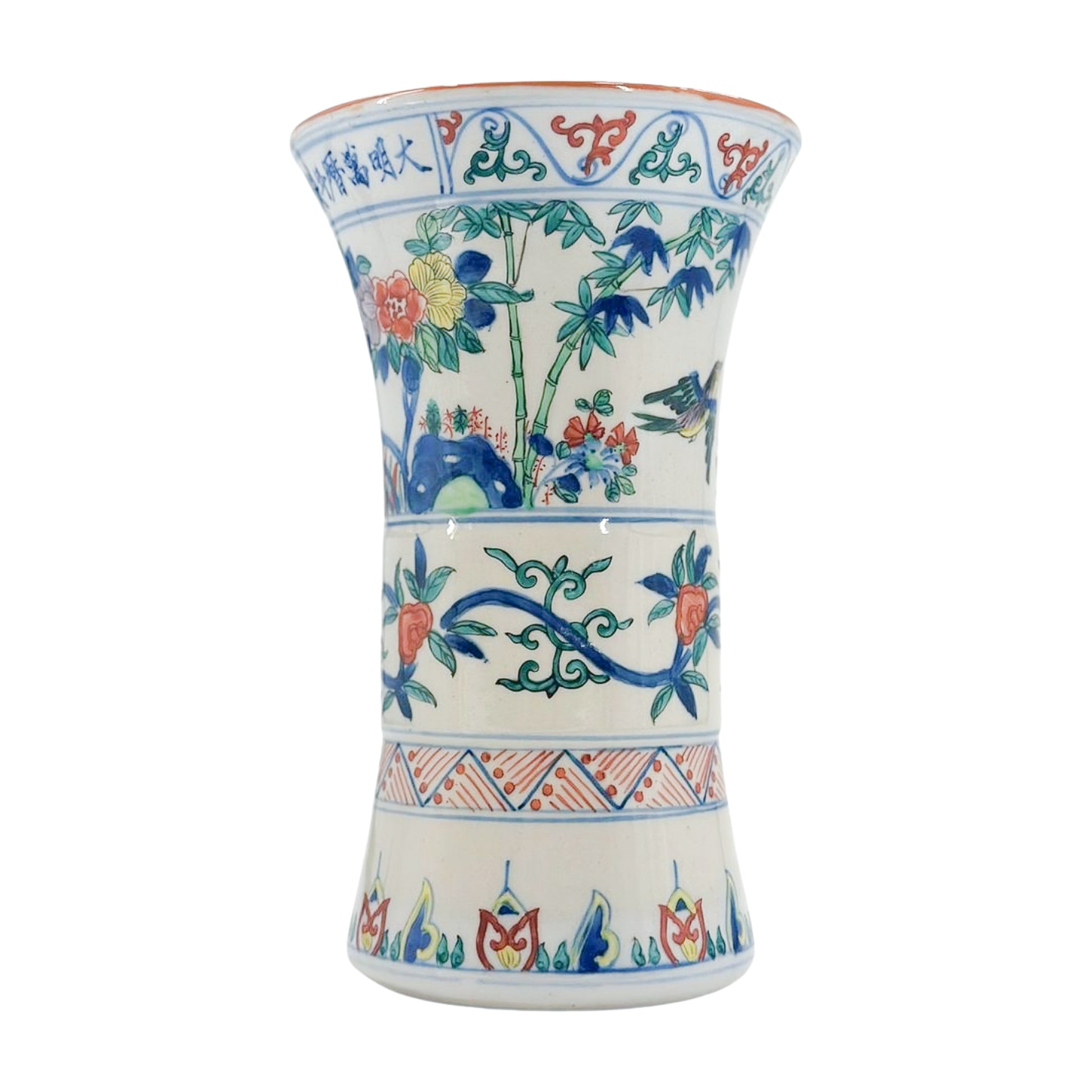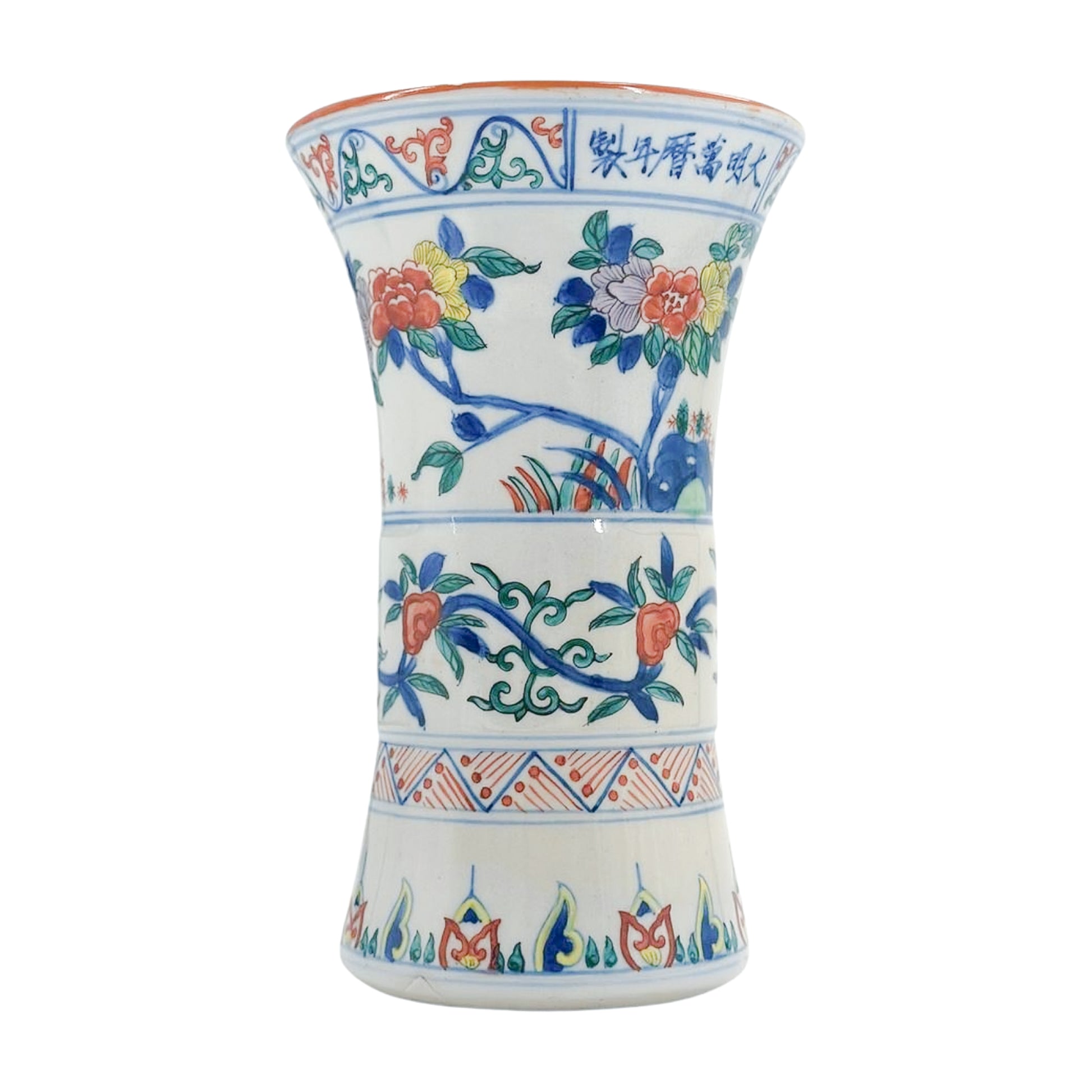 Elegant, restrained, and rooted in tradition. This trumpet-shaped porcelain vase features soft florals and scrolling vines in the doucai palette, flaring into a wide mouth that adds just the right amount of drama. Marked with a Ming Dynasty Wanli period reign mark, it’s a beautiful nod to centuries-old design—graceful without ever feeling heavy-handed.