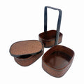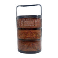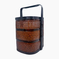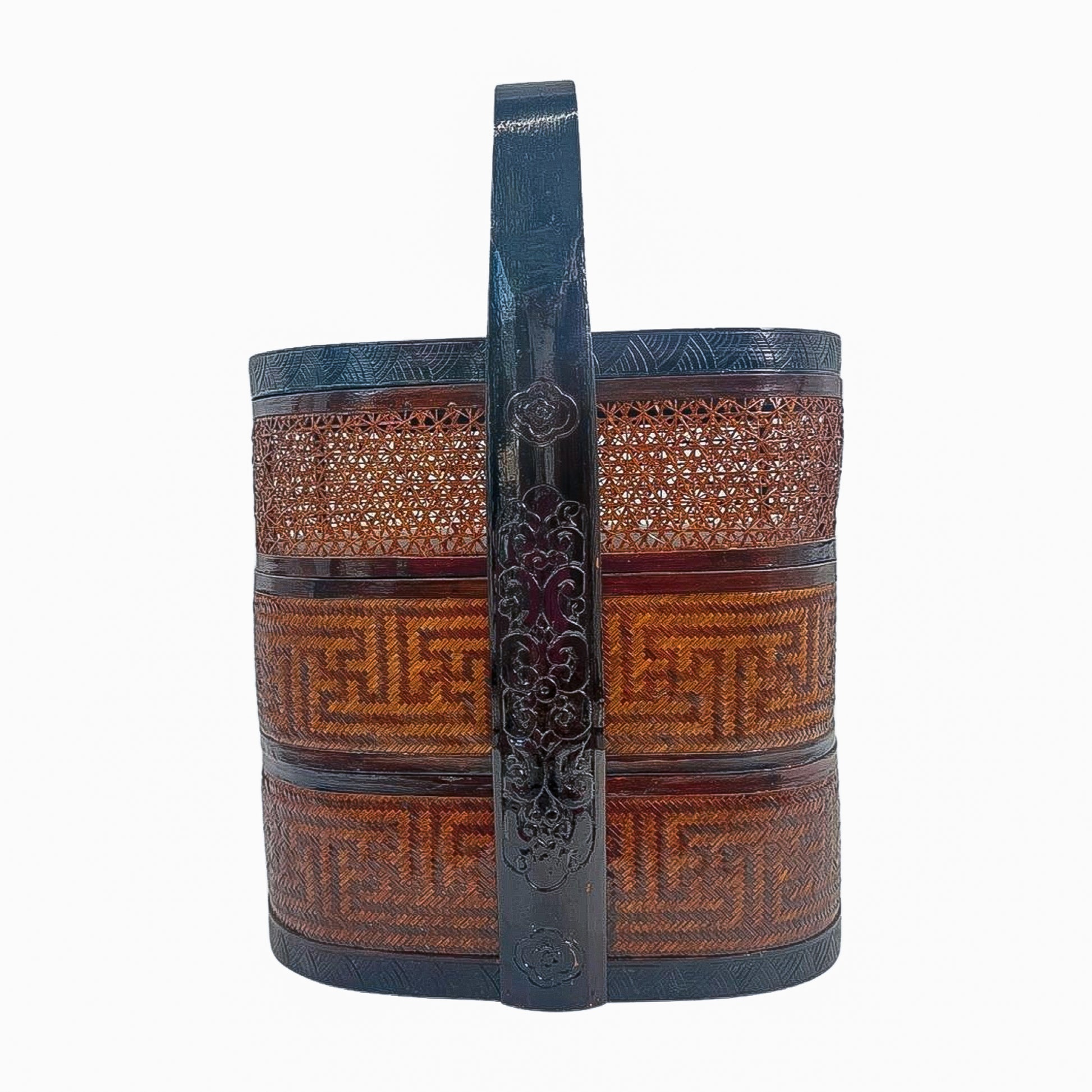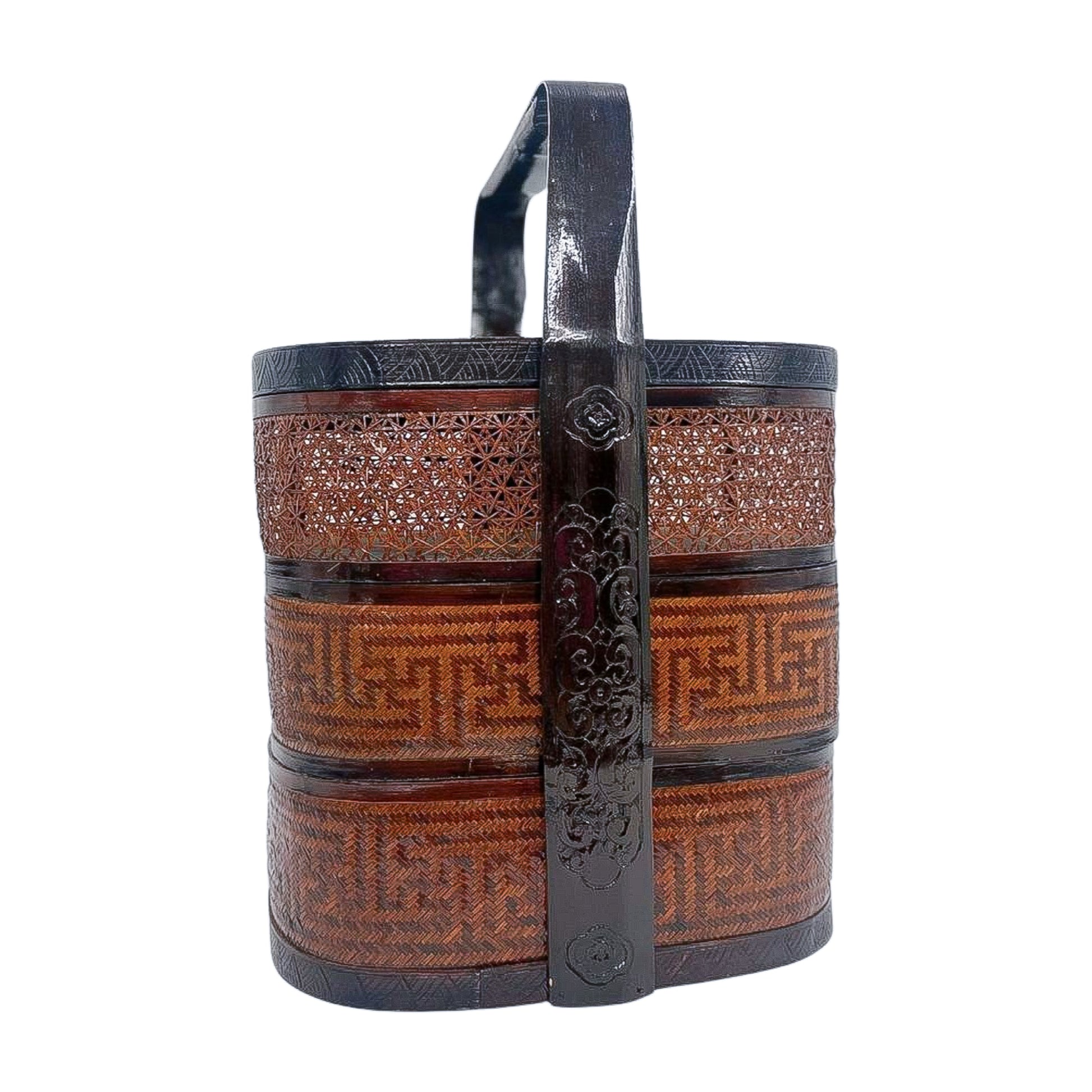 Equal parts sculptural and storied. This three-tier woven wedding basket features intricate geometric patterns and a carved central spine, all in deep oxblood and amber tones. Use it for storage, display, or let it be the piece guests ask about every time.