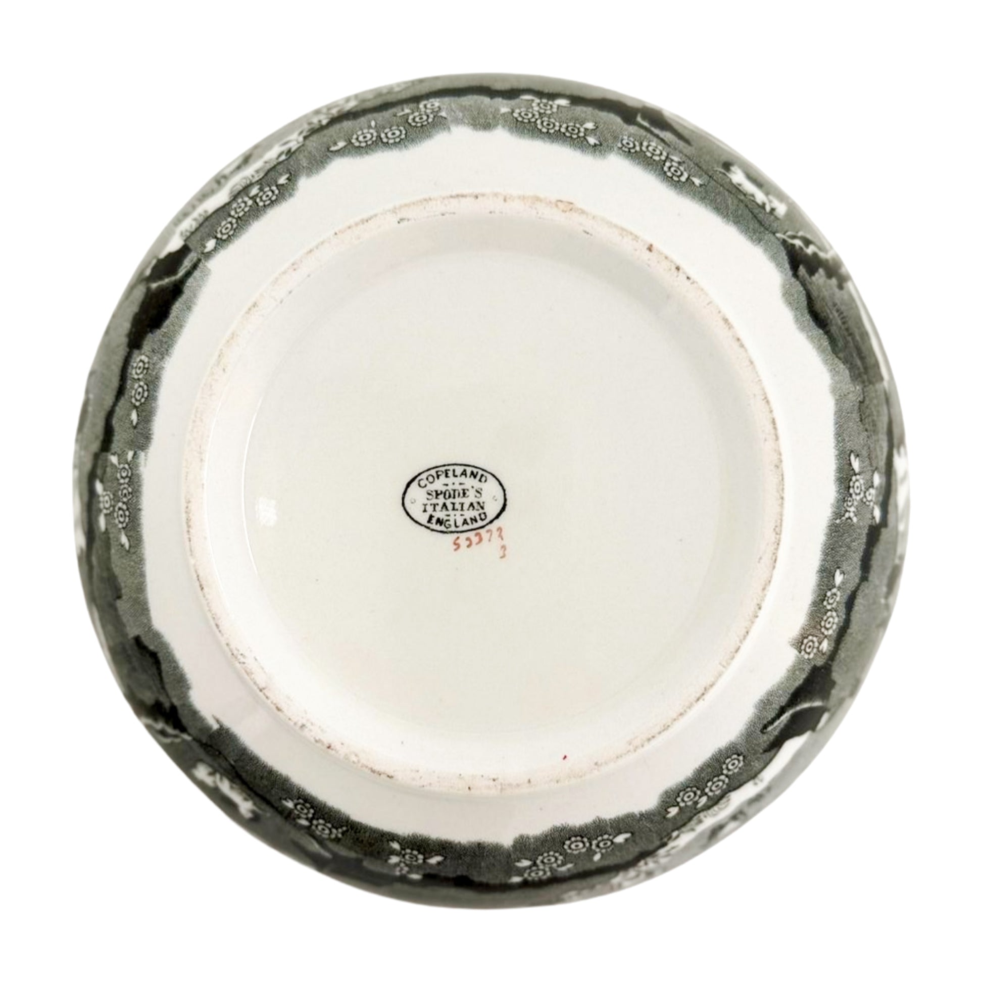 A richly detailed Copeland Spode “Italian” bowl in black transferware with hand-applied gold trim. The classic pastoral scene—ruins, rivers, and wandering figures—is rendered in bold monochrome, making this piece feel both traditional and strikingly graphic. The bowl’s gently curved form and full wraparound patterning make it as lovely on display as it is in use. Marked on the base.