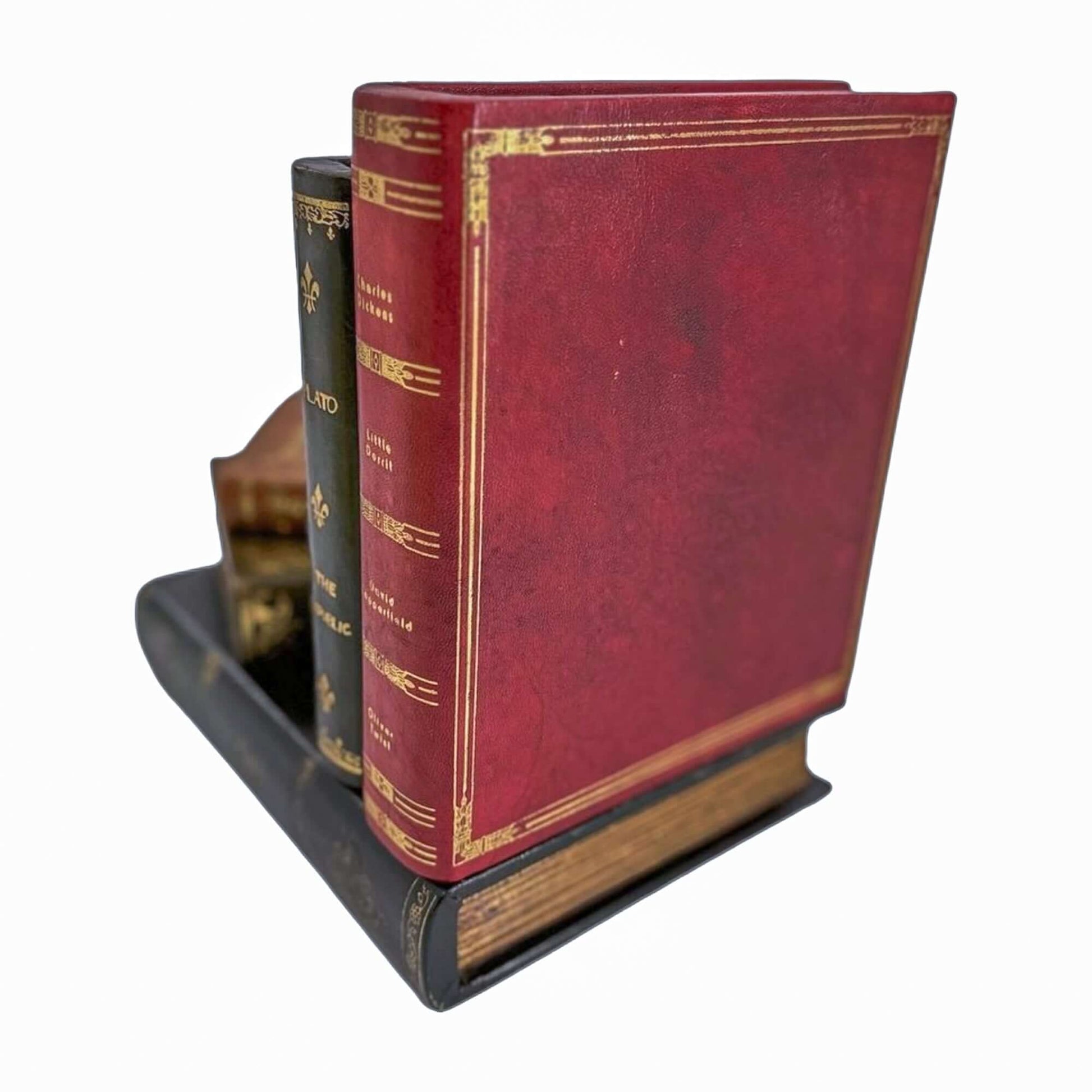 This charming sculptural piece captures the look of a well-loved stack of classic tomes—Plato, Dickens, Twain—rendered in richly textured finishes with gilt detailing. A clever nod to the literary, this decorative accent by John-Richard adds instant depth to bookshelves, consoles, or desks. Decorative only (not real books).