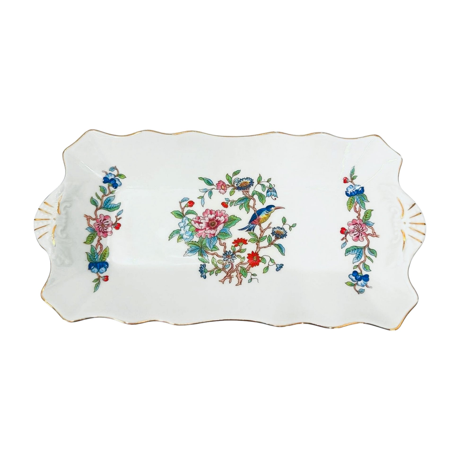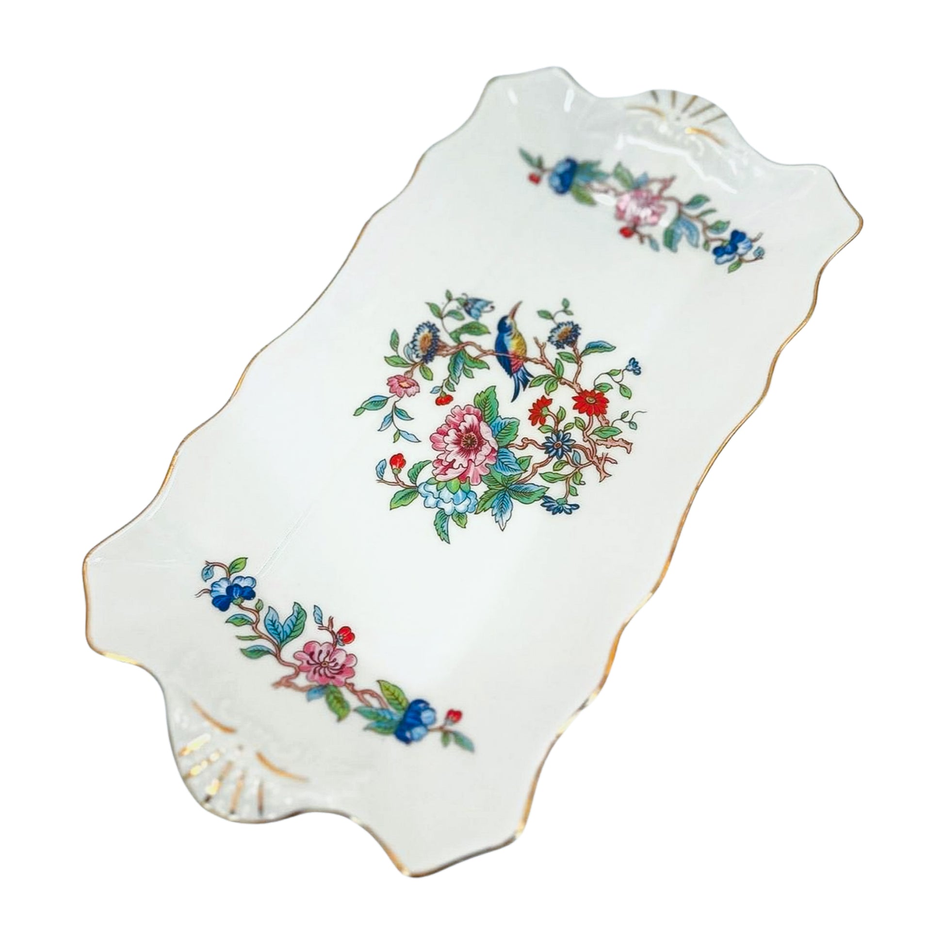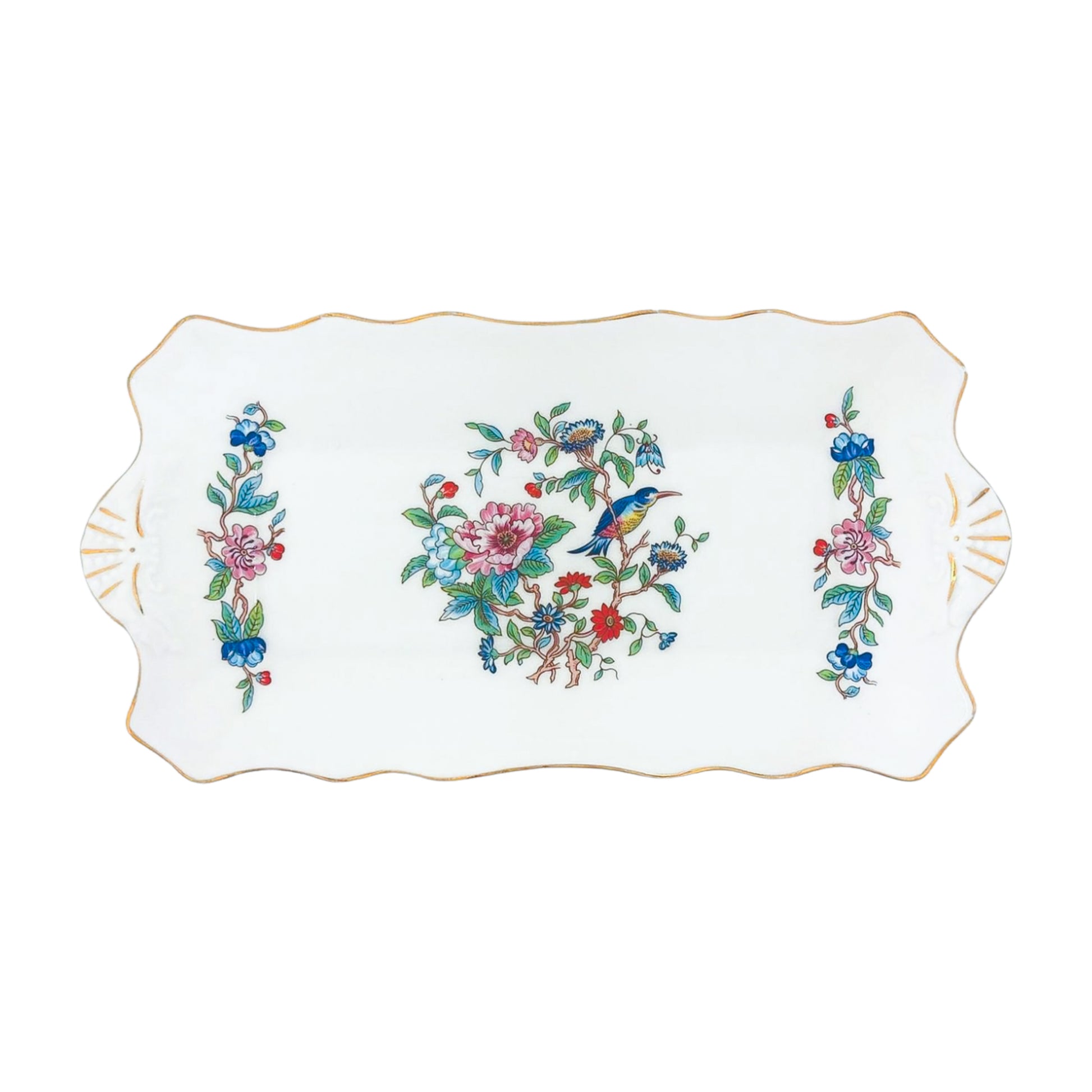 A classic from Aynsley’s beloved Pembroke pattern, this scalloped rectangular tray features vibrant florals and a bluebird motif inspired by 18th-century Chinese porcelain. Finished with hand-painted gold accents and delicate molded handles, it's a graceful piece for display or serving. Perfect on a vanity, sideboard, or breakfast table.