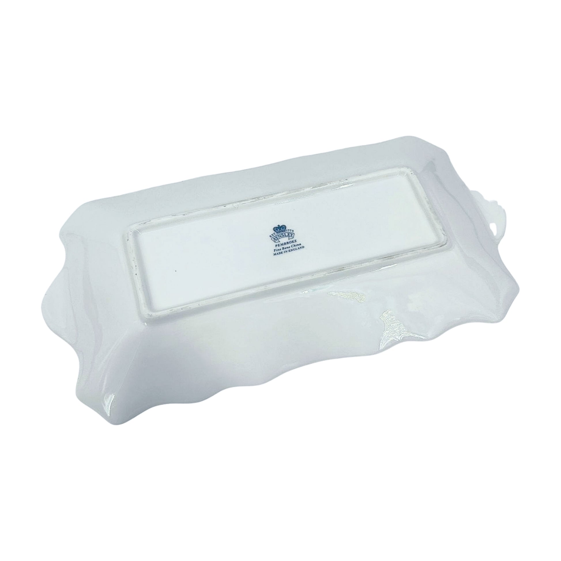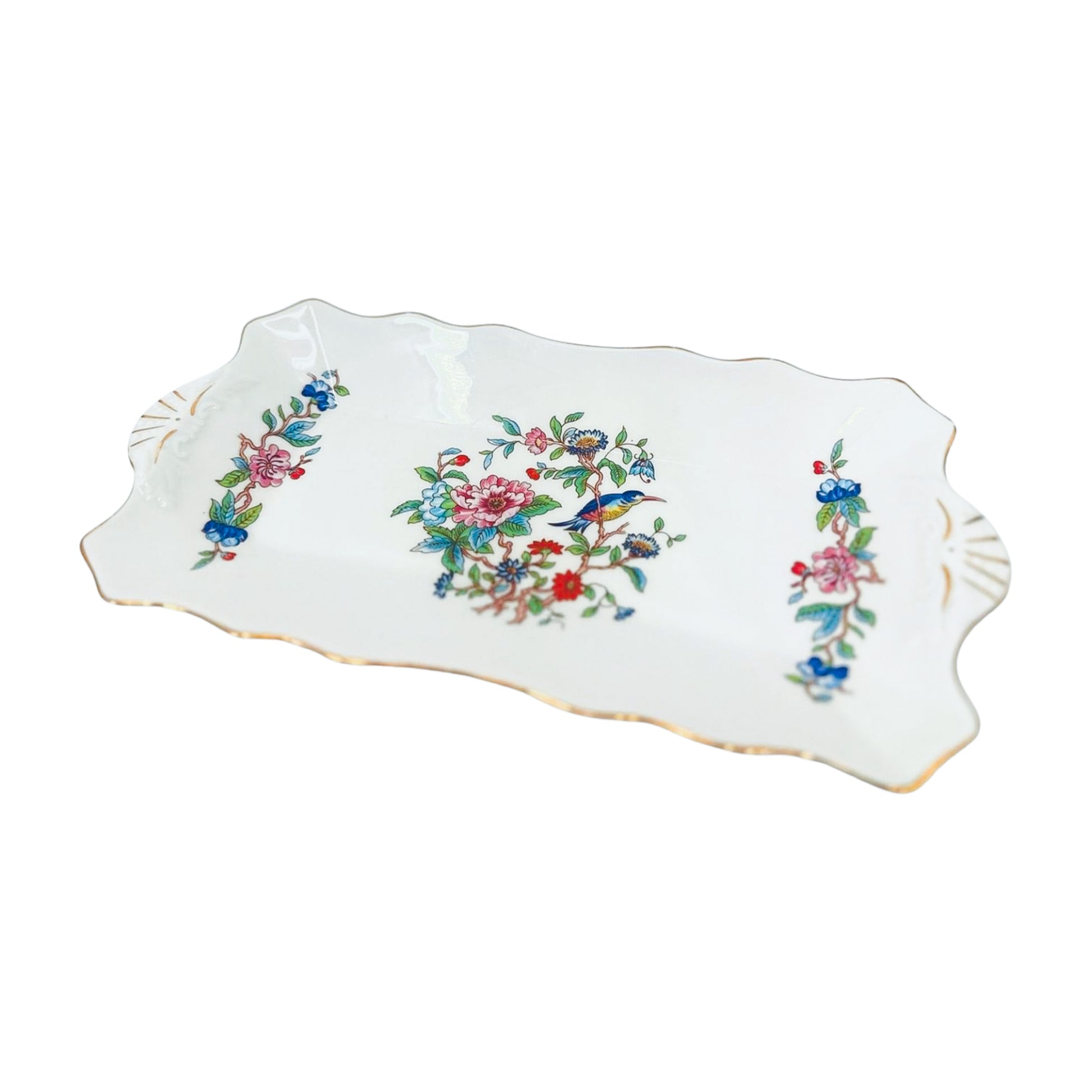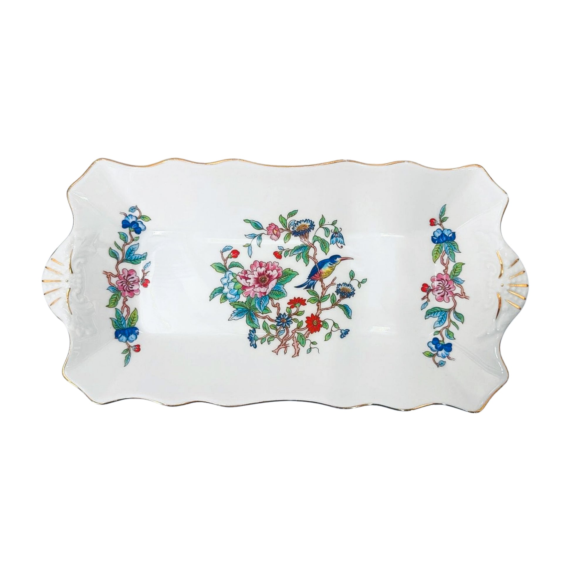 A classic from Aynsley’s beloved Pembroke pattern, this scalloped rectangular tray features vibrant florals and a bluebird motif inspired by 18th-century Chinese porcelain. Finished with hand-painted gold accents and delicate molded handles, it's a graceful piece for display or serving. Perfect on a vanity, sideboard, or breakfast table.