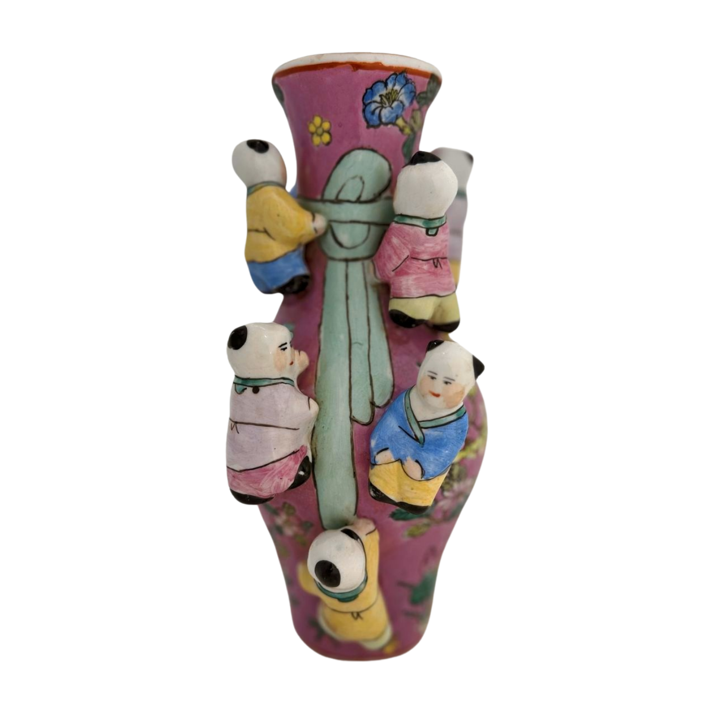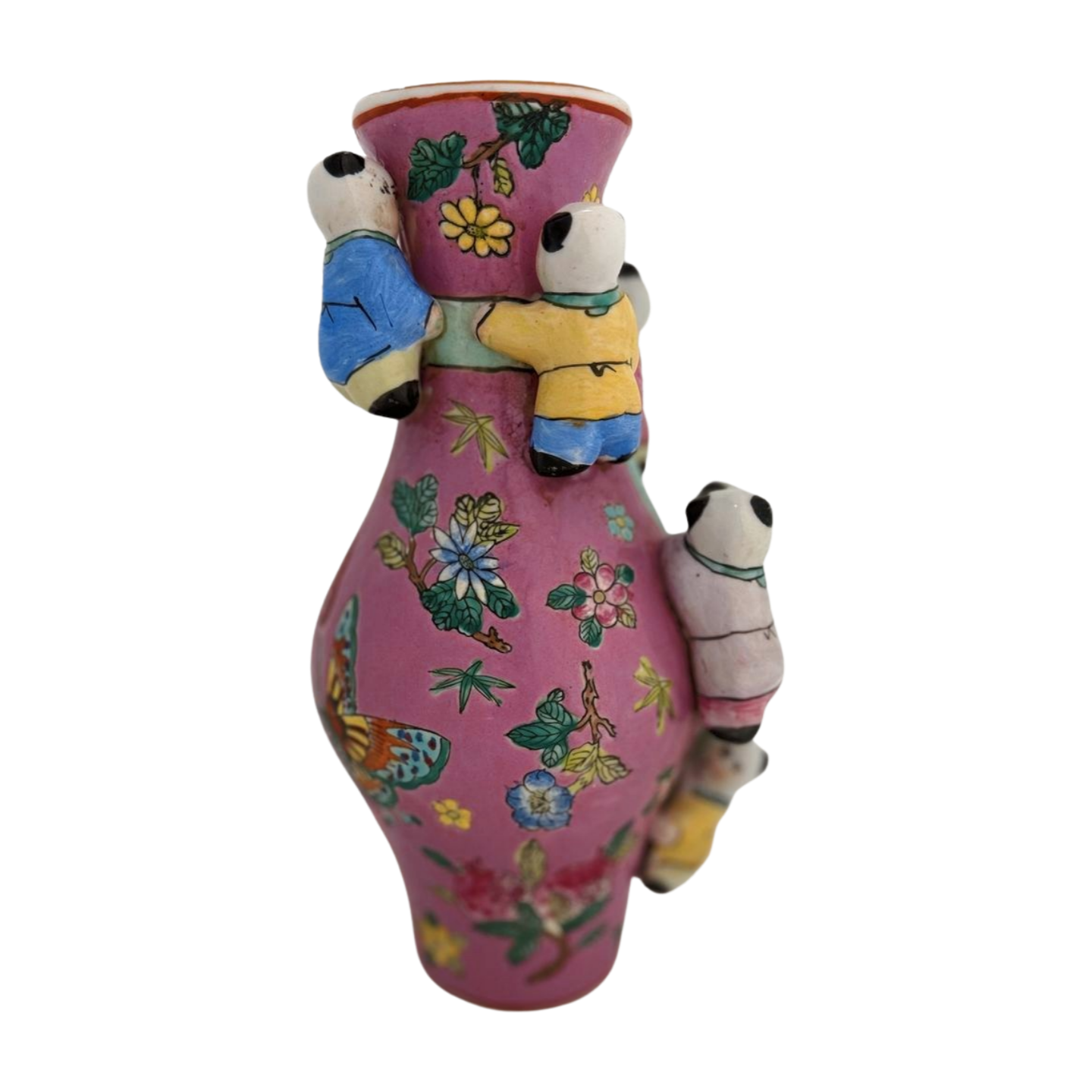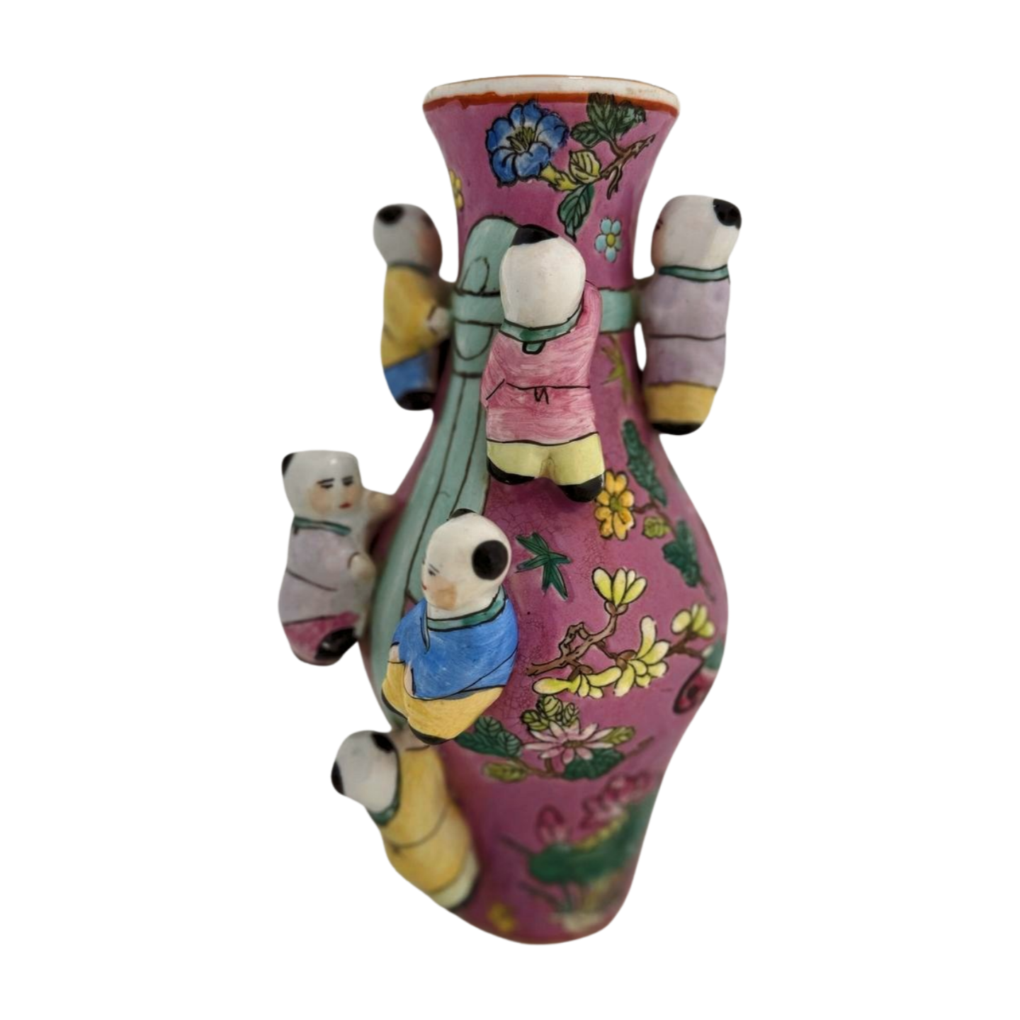Painted in a rosy ground with delicate florals and butterflies, this exuberant ceramic vase features six dimensional children scaling the sides in high relief—a motif often associated with blessings of prosperity, happiness, and fertility. With hand-painted detail and joyful palette, it channels the spirit of traditional Famille Rose porcelain, but with playful depth and sculptural charm. A beautiful standalone display piece or part of a chinoiserie vignette.