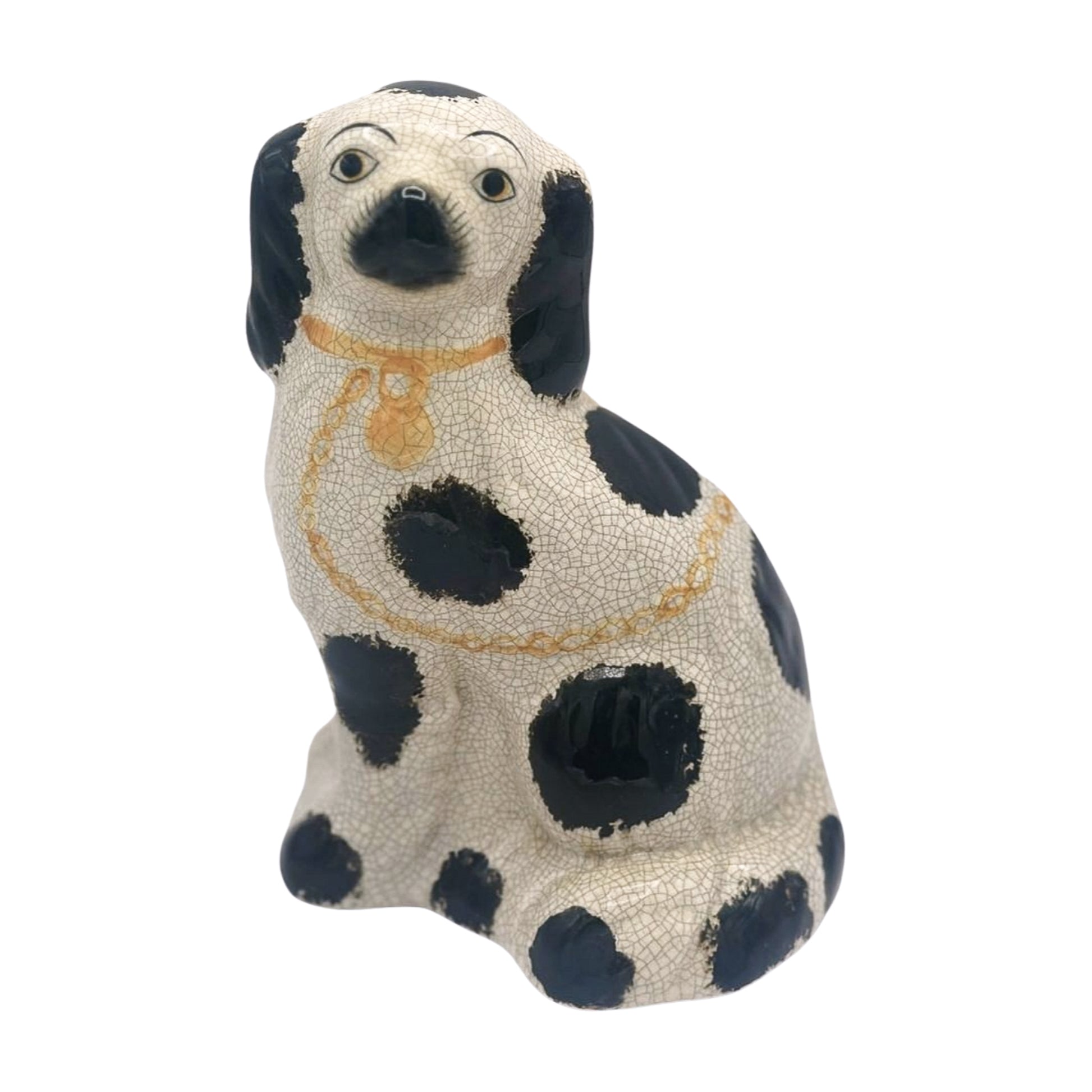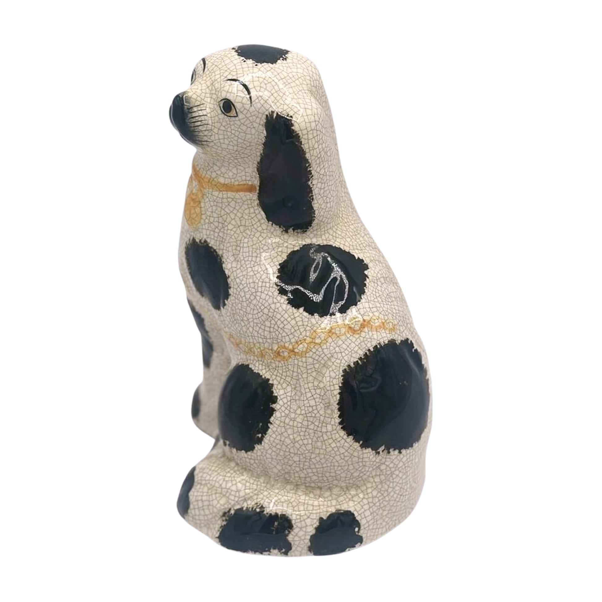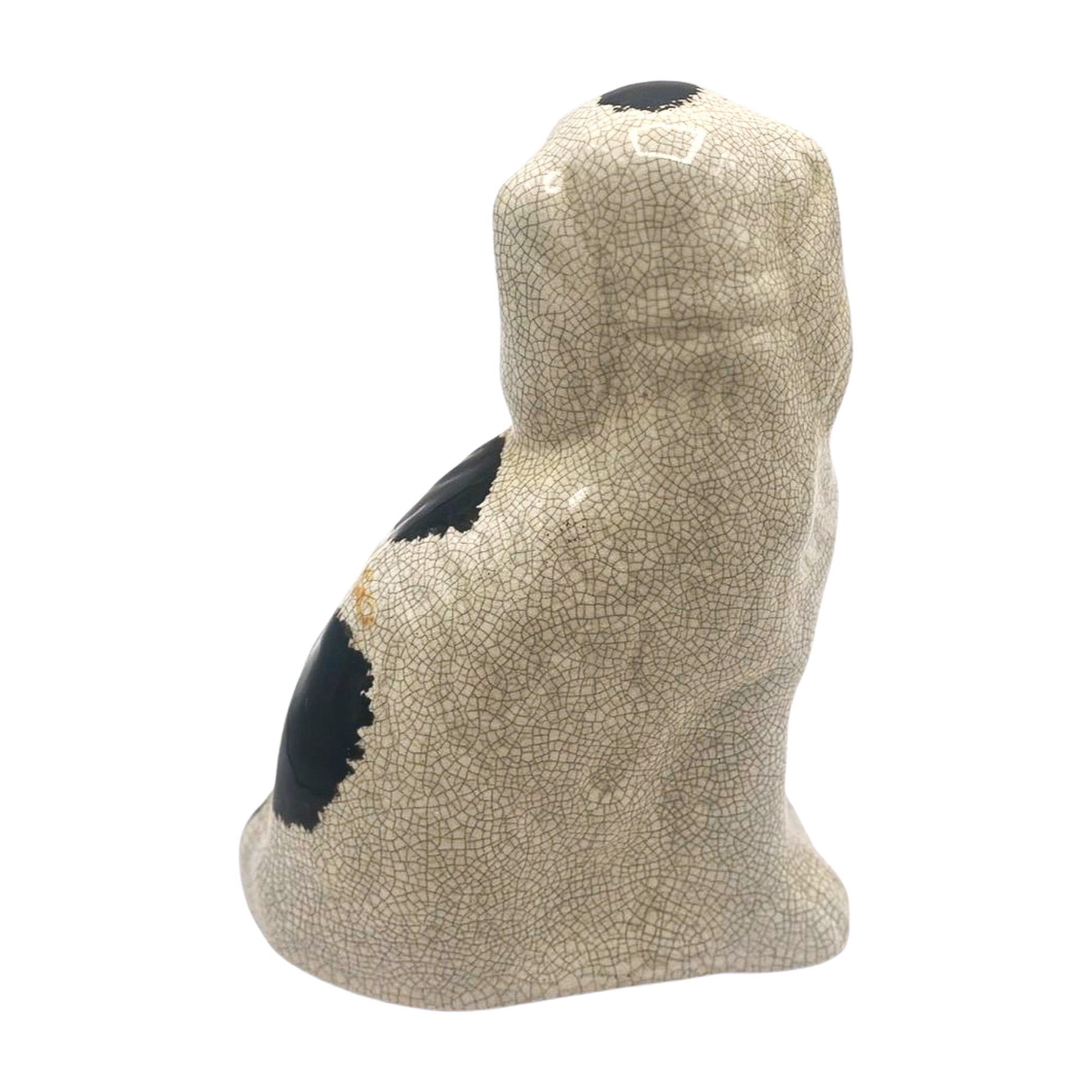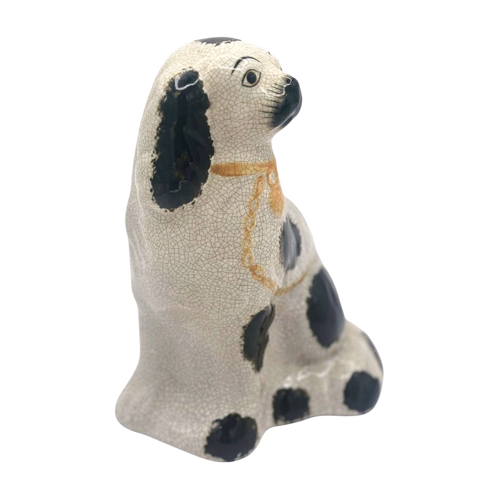 A classic Fitz & Floyd ceramic spaniel figure in black and white with gold collar. The crackle glaze gives it subtle texture and character. A playful, timeless accent — perfect on a bookshelf, console, or as part of a collected vignette.