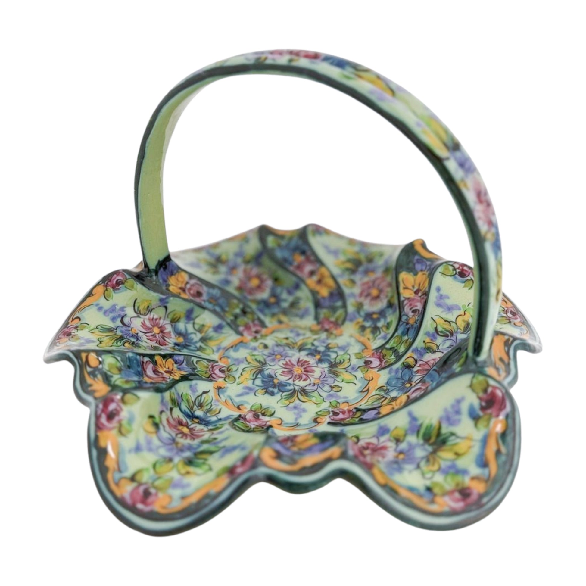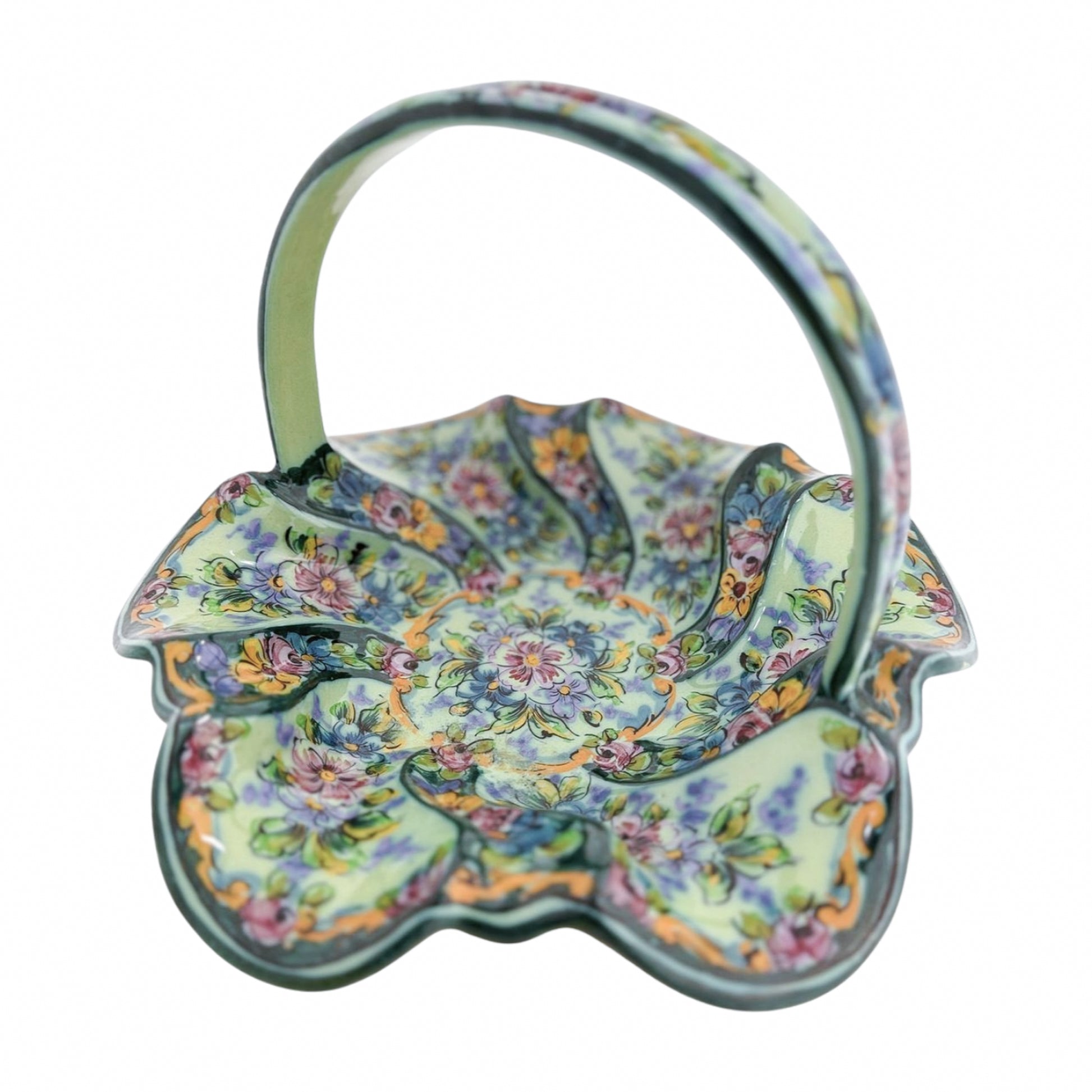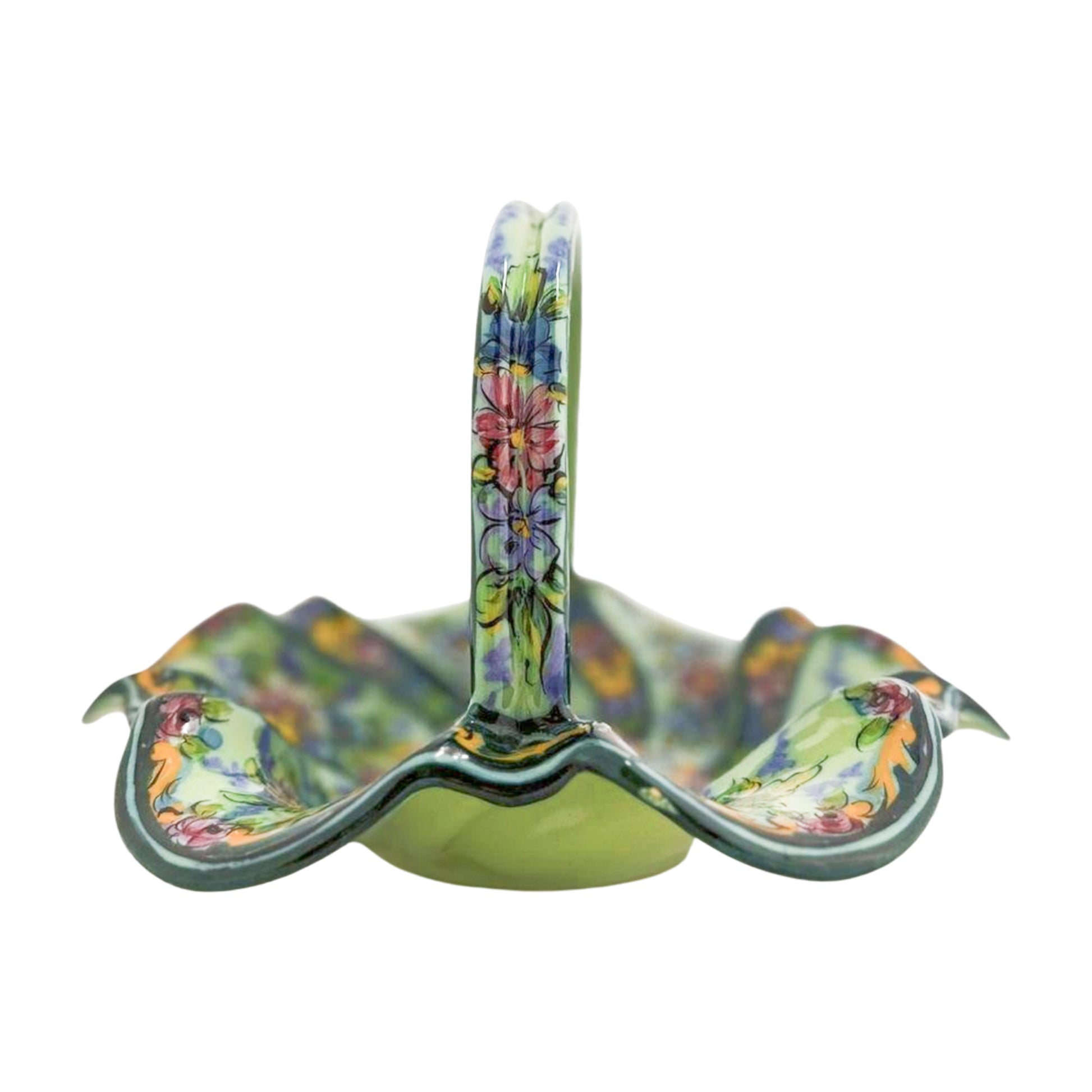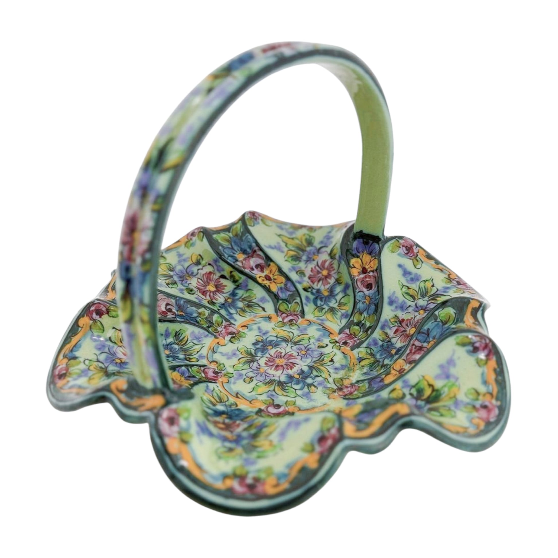 Made in Portugal, A wildly cheerful majolica basket dish with a scalloped floral form and fixed handle. Hand-painted in Portugal with abundant blossoms in rich, saturated tones—think old-world garden party meets maximalist cottage. Marked on base.