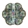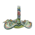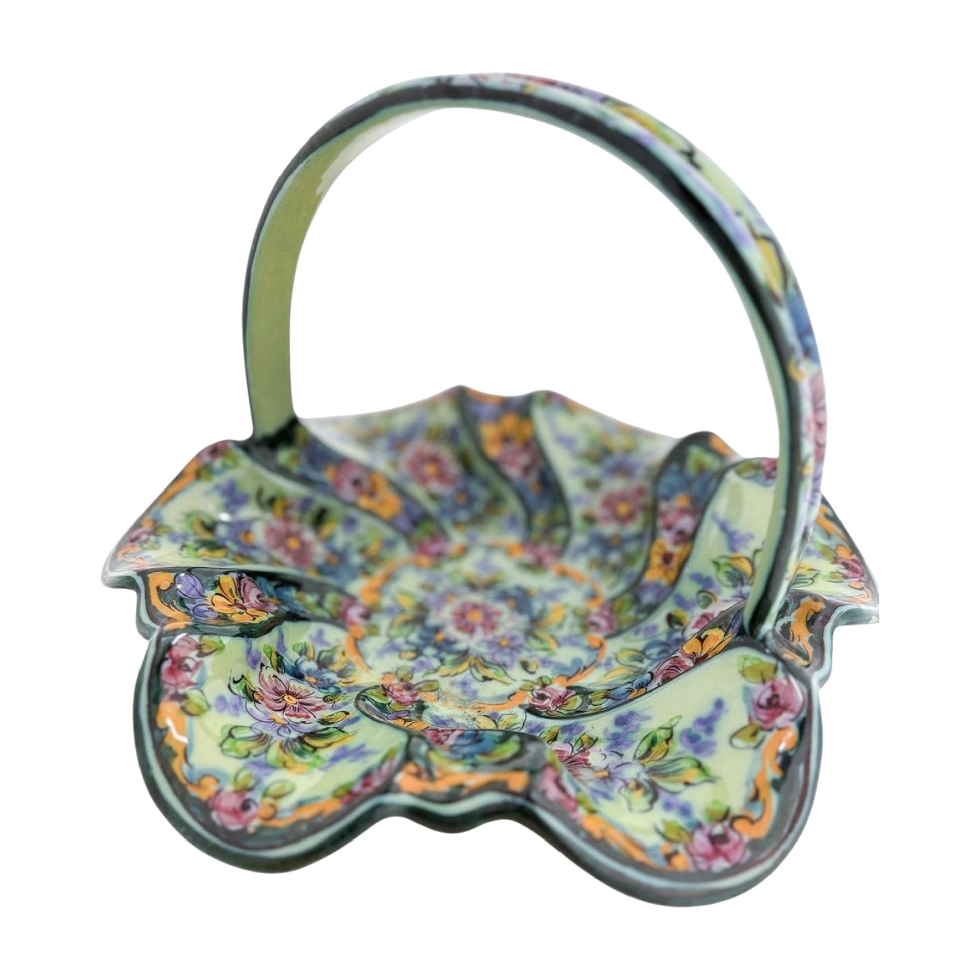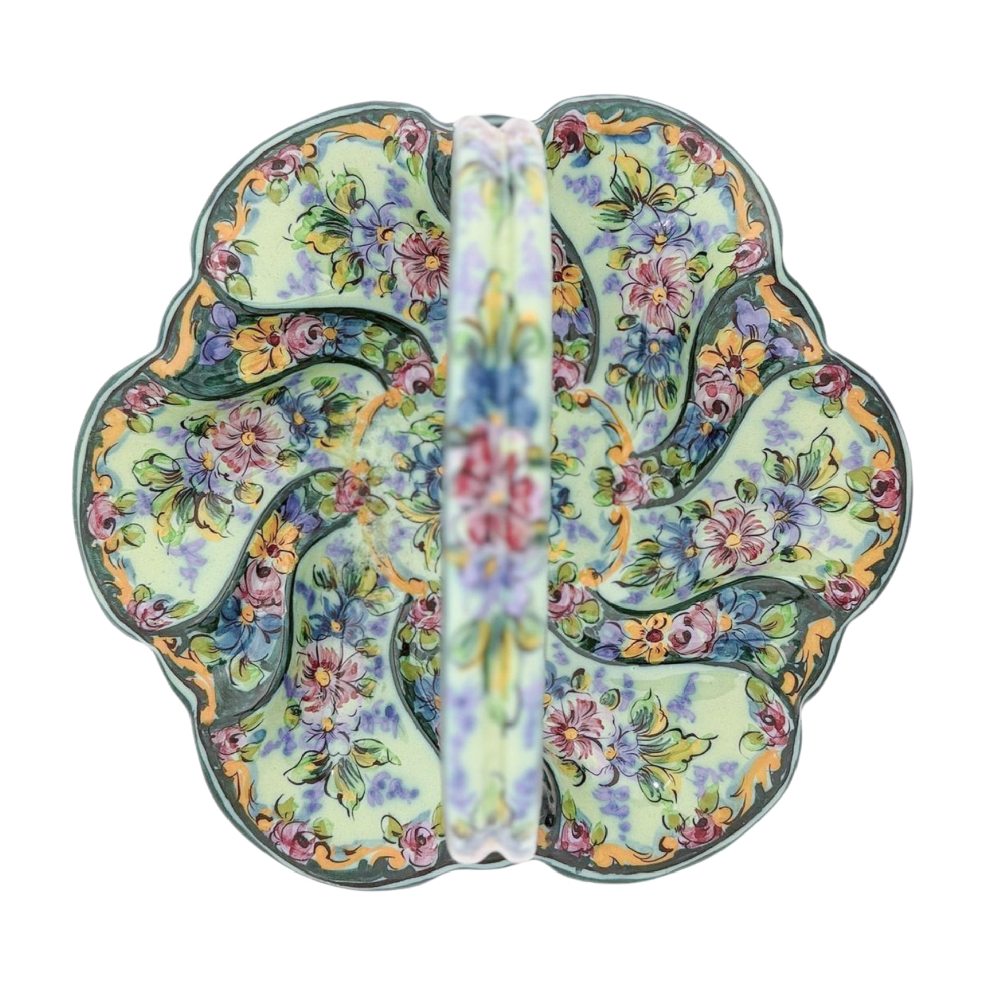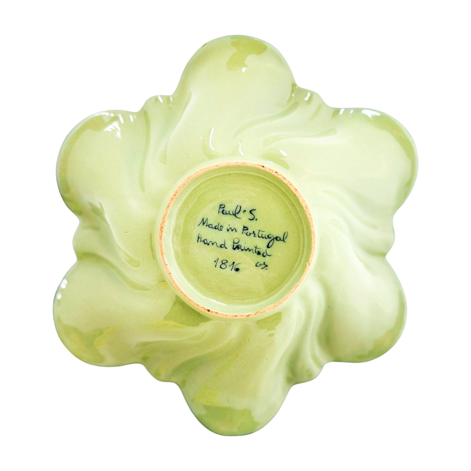 Made in Portugal, A wildly cheerful majolica basket dish with a scalloped floral form and fixed handle. Hand-painted in Portugal with abundant blossoms in rich, saturated tones—think old-world garden party meets maximalist cottage. Marked on base.