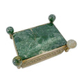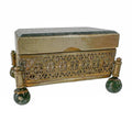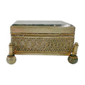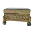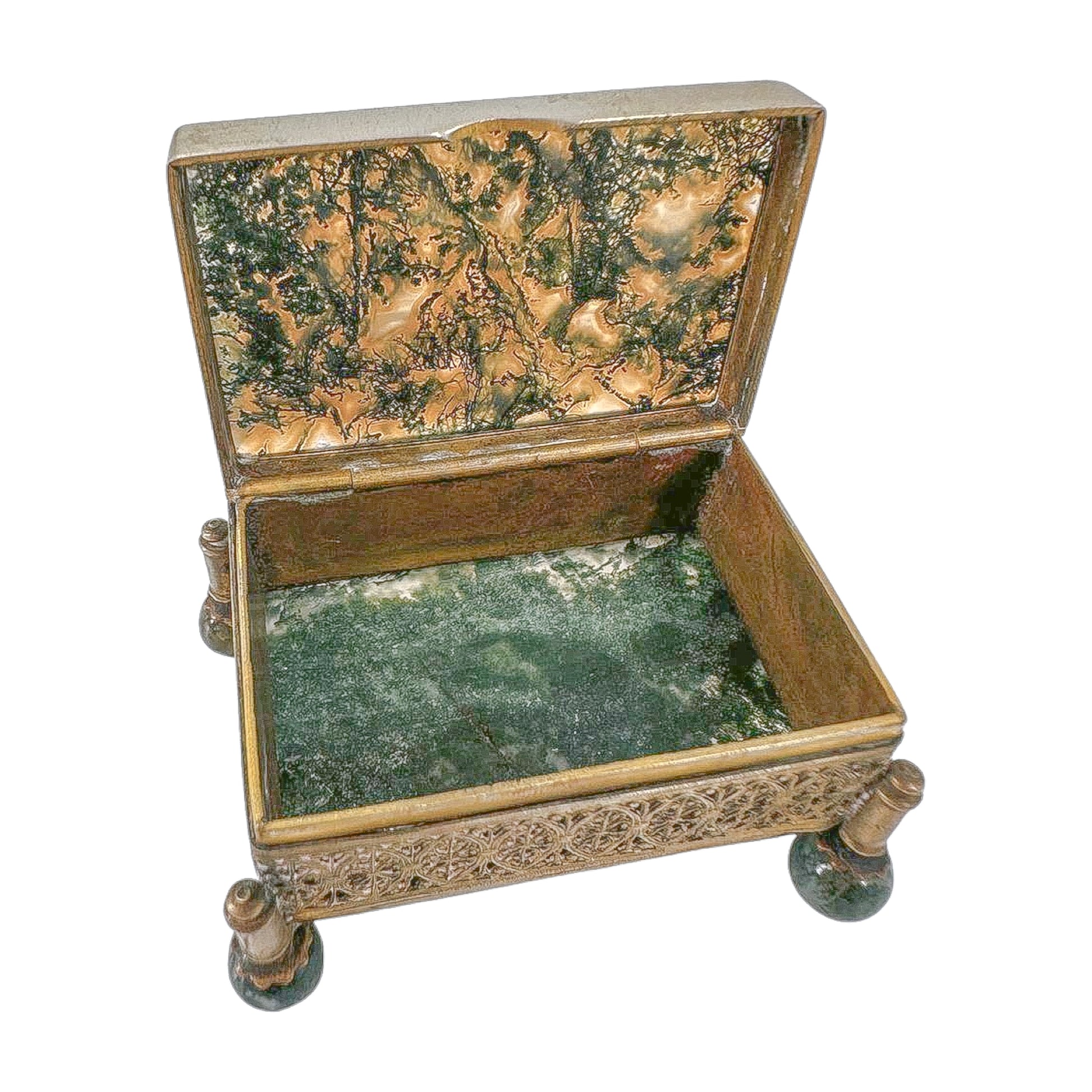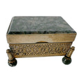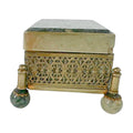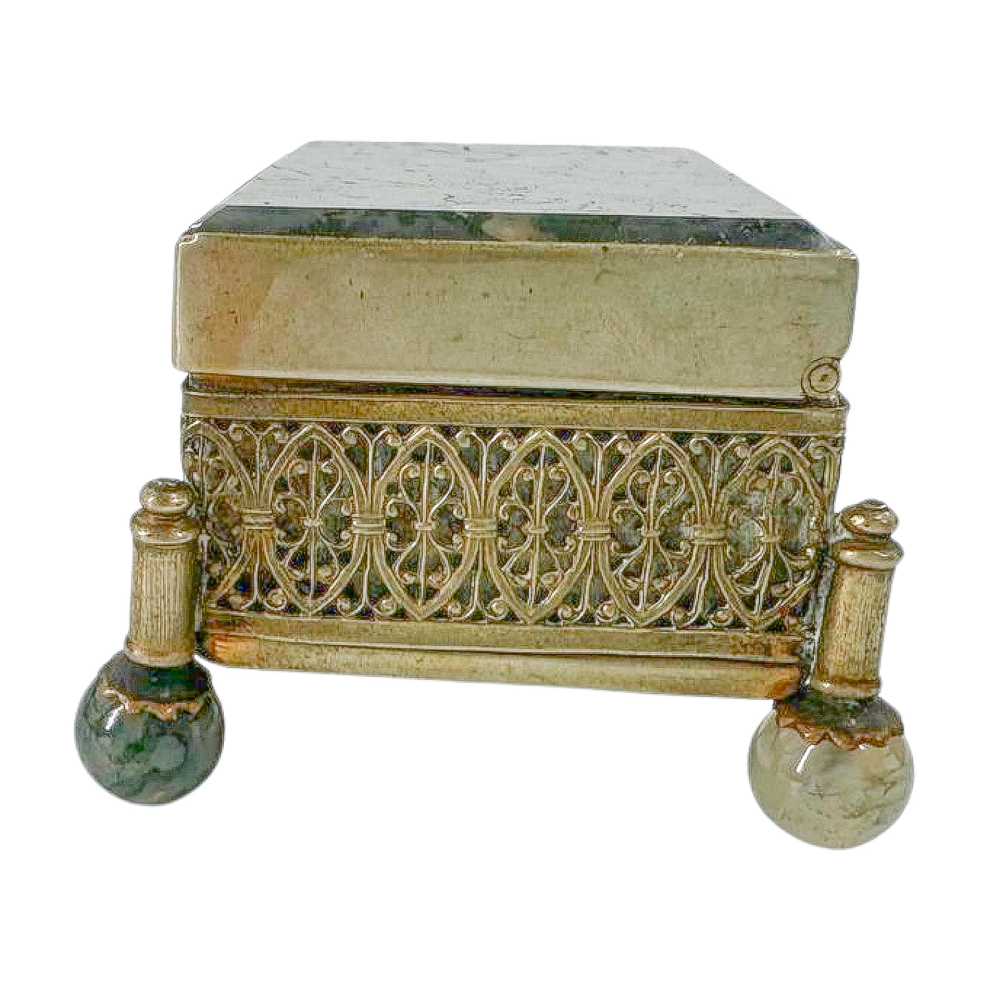 Old-world romance meets serious weight. This French-style footed box is crafted of gilded metal with ornate fretwork sides and a deep green marble top. Use it to corral rings and keys—or just leave it out to be admired.