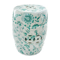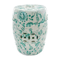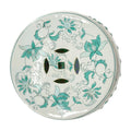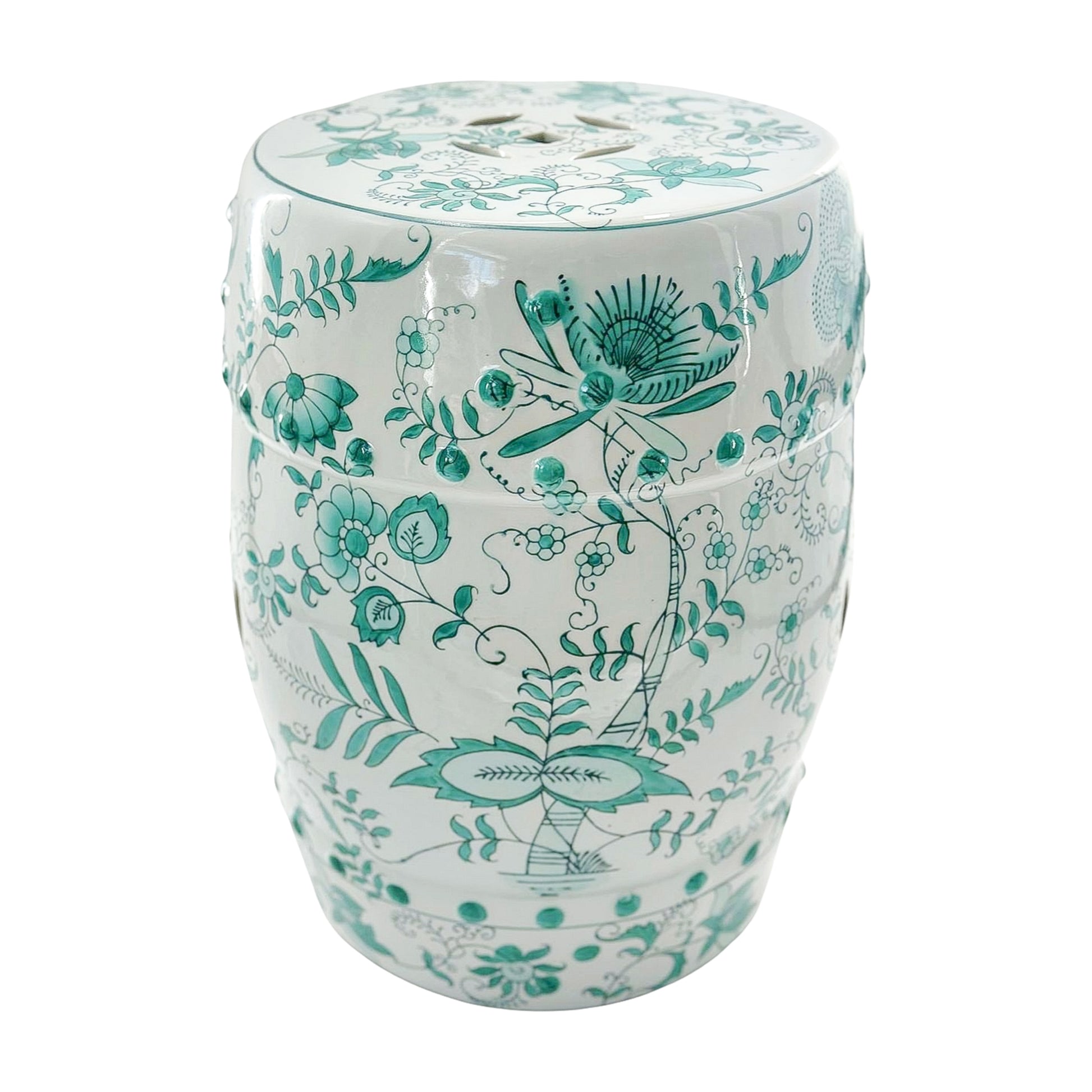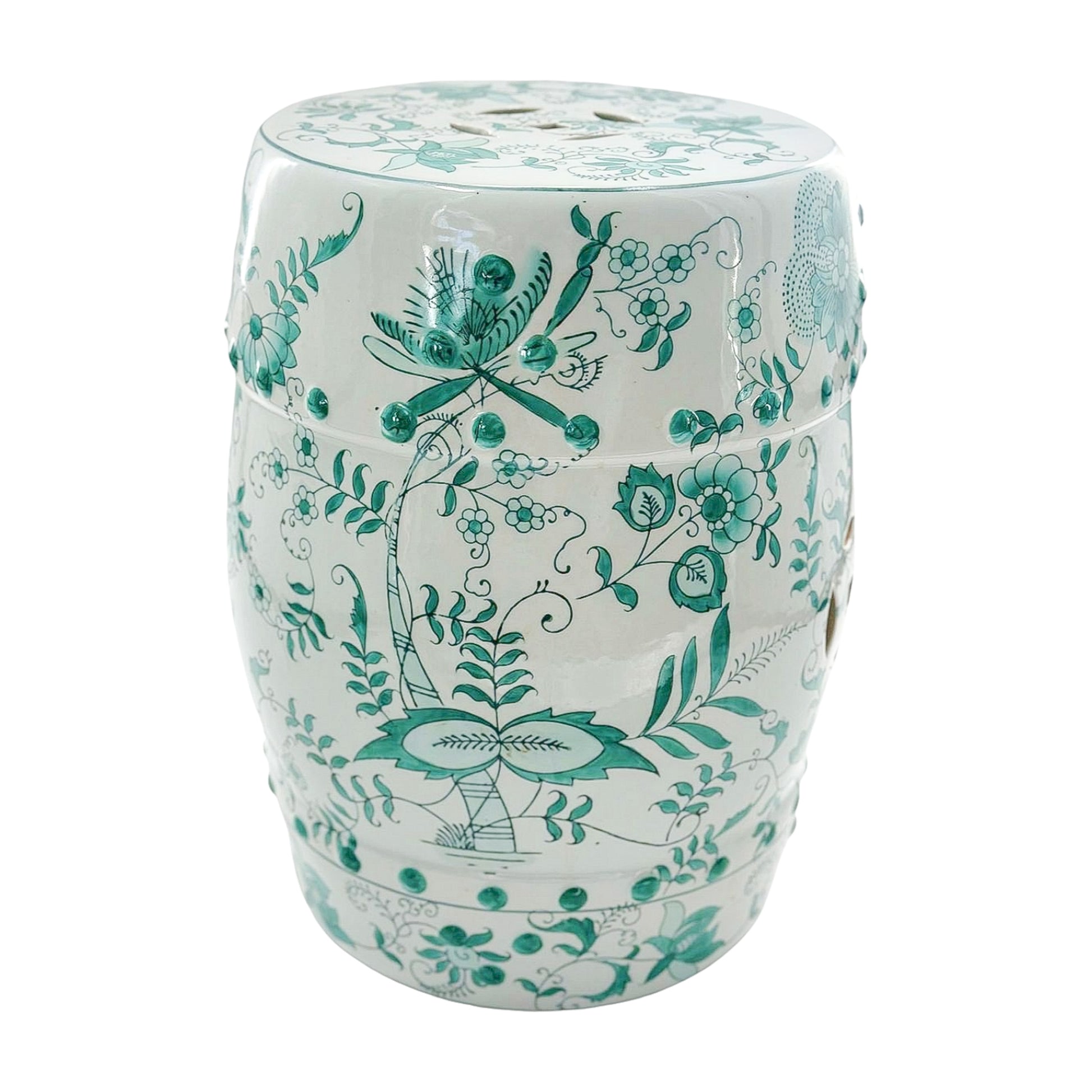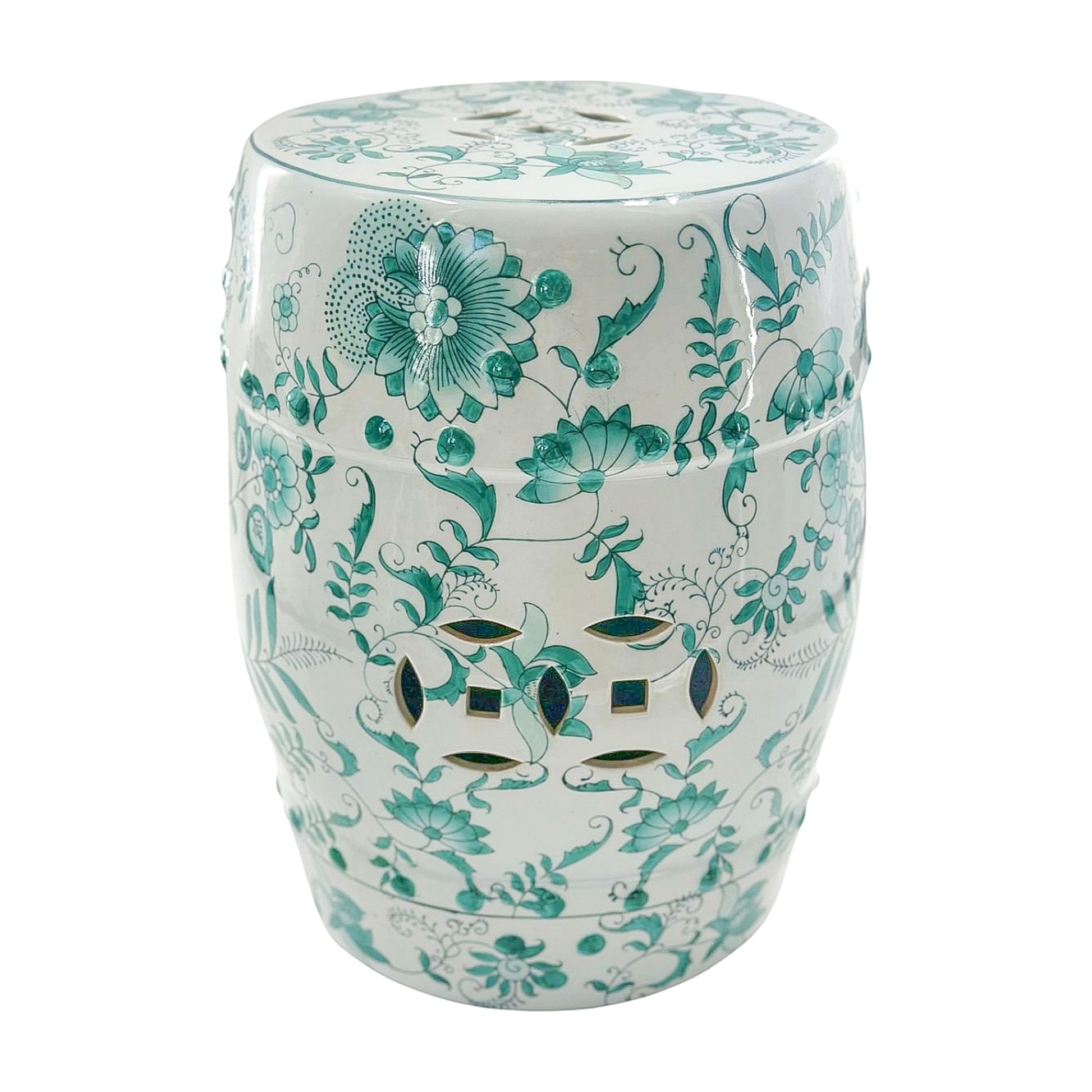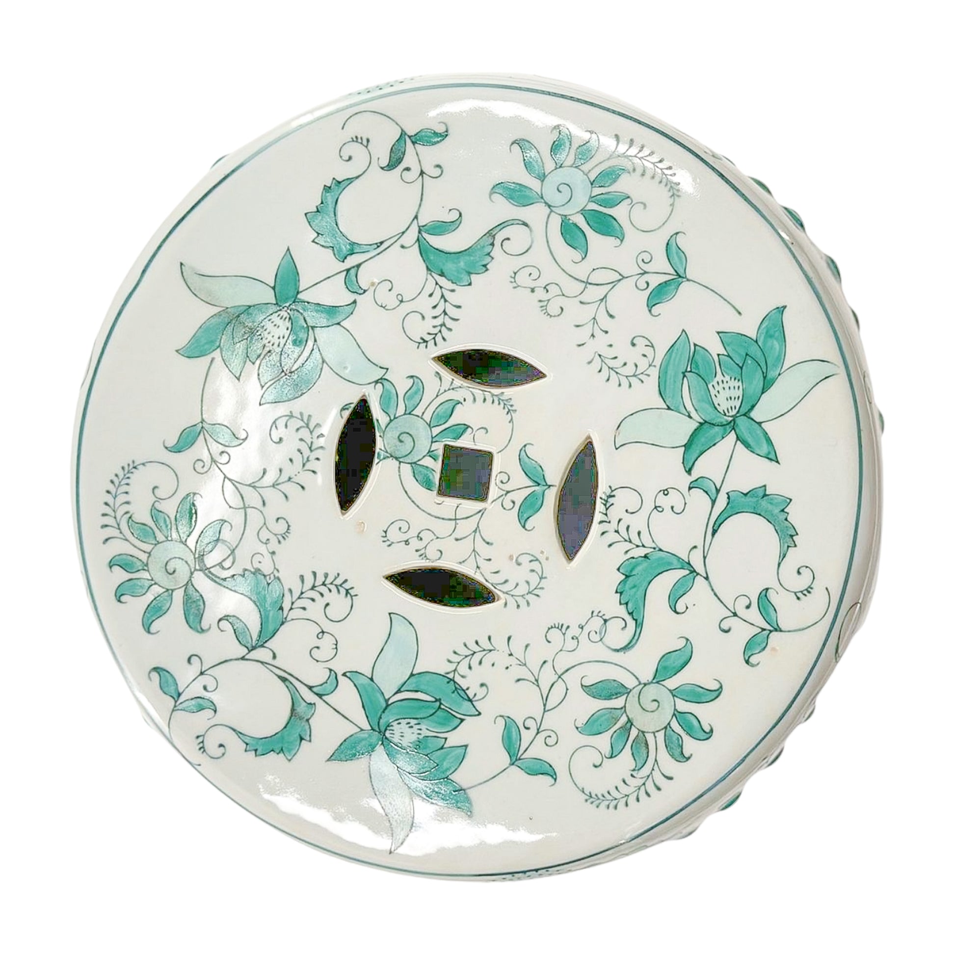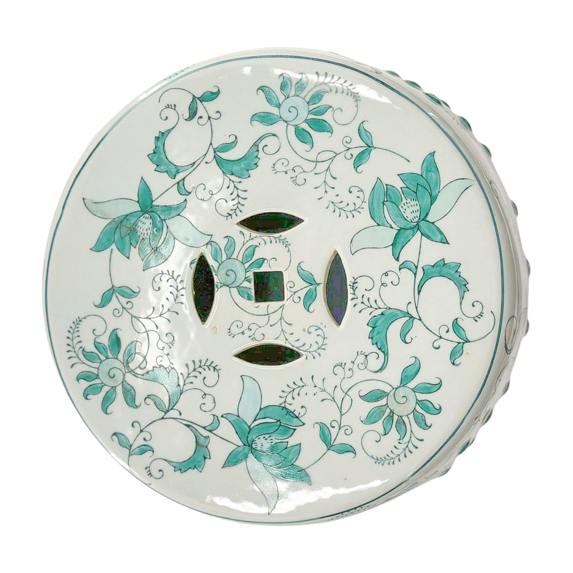 This elegant porcelain garden stool takes the classic barrel drum shape and brings it to life with a fresh green-and-white floral motif. Stylized peonies, plum blossoms, and lotus buds intertwine delicately, echoing the fluid scrollwork tradition. A ring of raised boss-head nails around the drum’s body nods to the authentic drums used to stretch hides, while the perforated eternal coin patterns on the top and sides symbolize prosperity and good fortune. Originally designed as a footrest, this versatile piece shines as a charming garden seat or a refined side table—indoors or out.