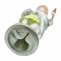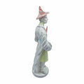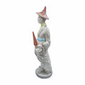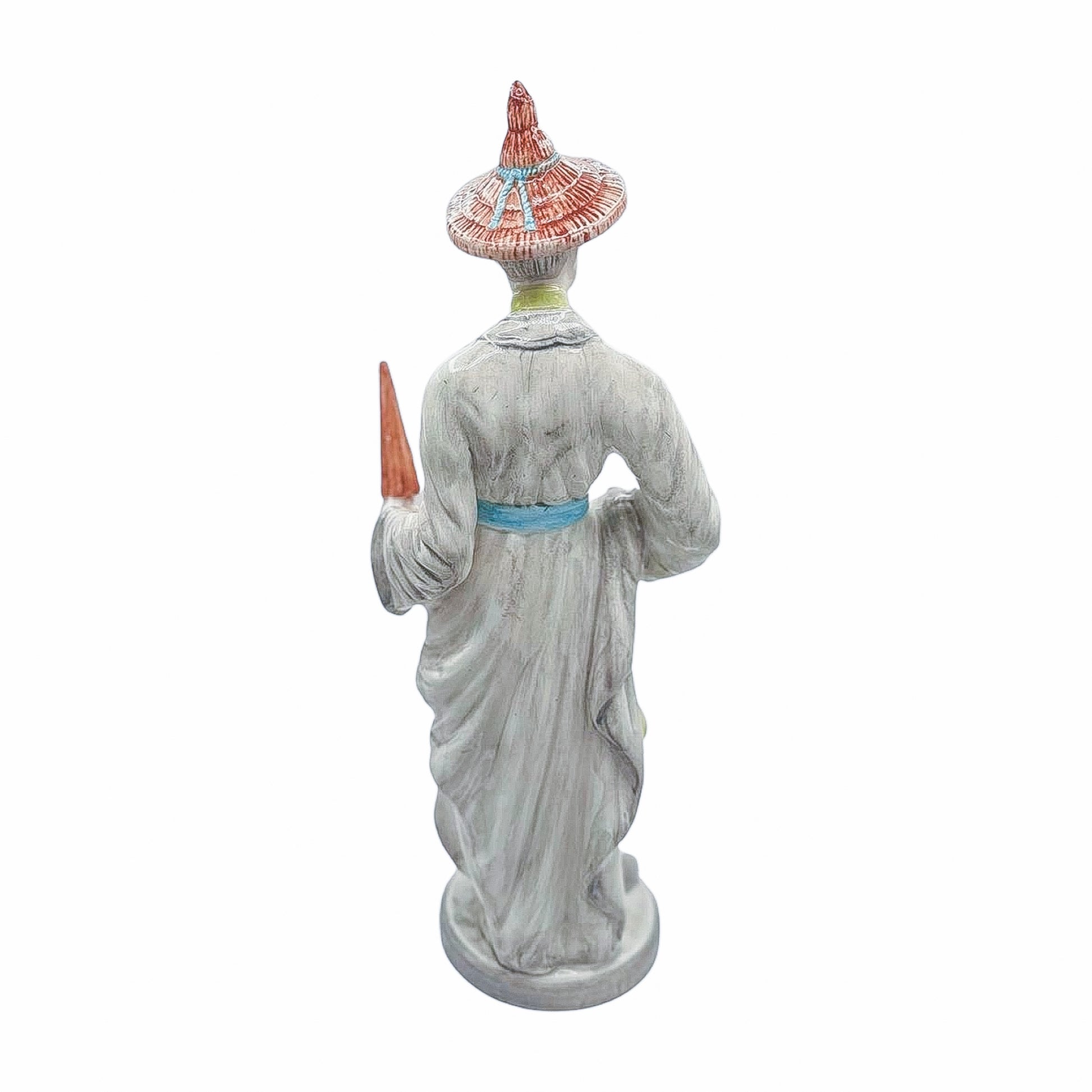 This detailed male figurine wears traditional dress with a gathered robe, bright sash, and parasol in hand. Painted in soft neutrals and light primary colors, he adds a sculptural note to a mantel or bookshelf.