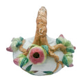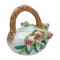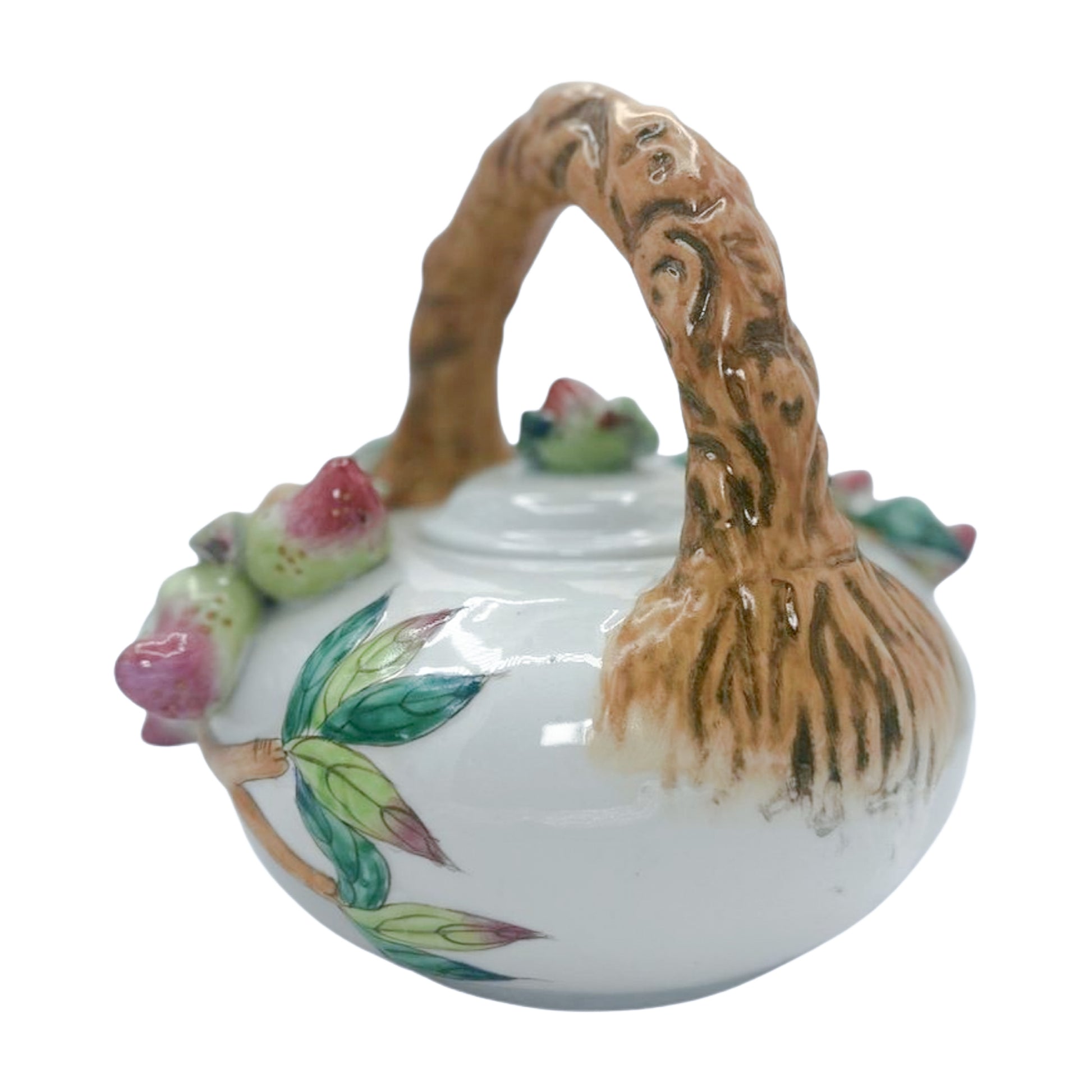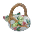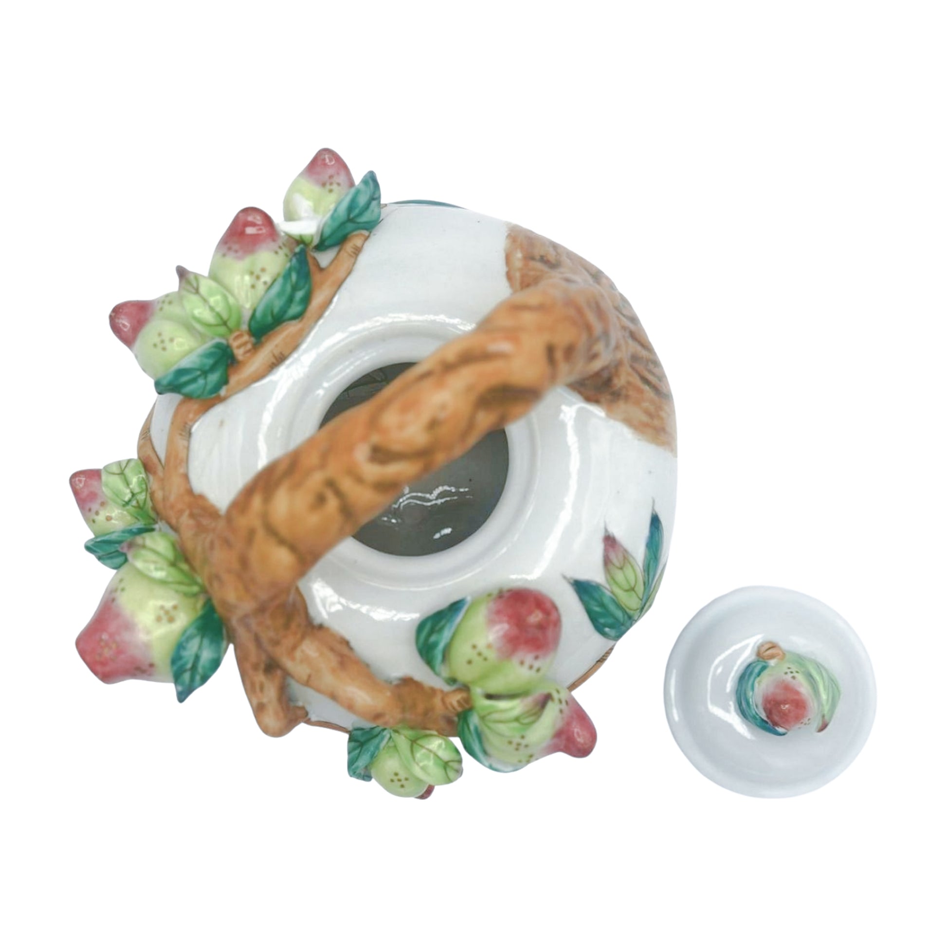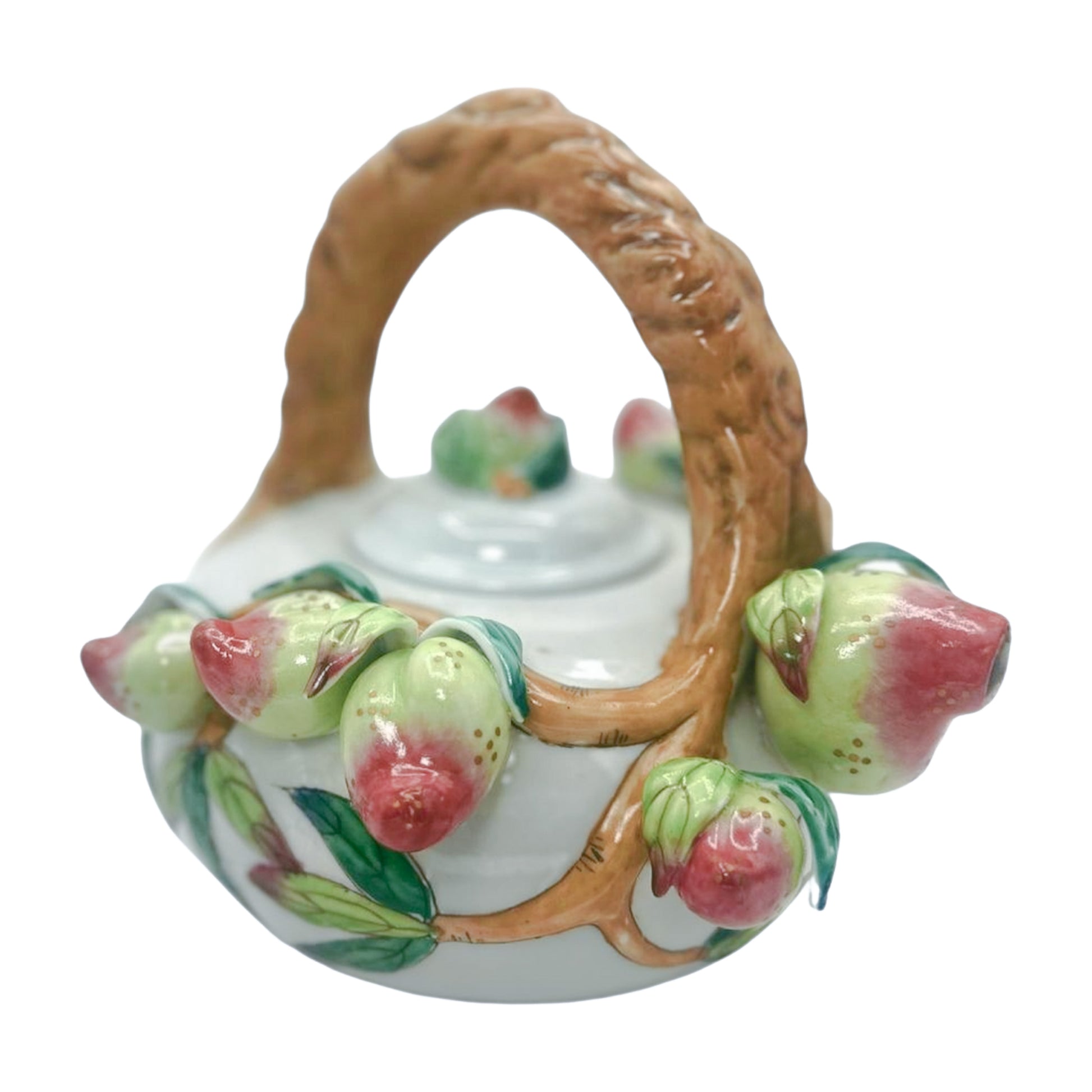 Straight from the garden. This hand-painted teapot is covered in blushing peaches and glossy green leaves, all climbing up a twisted branch-shaped handle. The effect is playful and painterly—a statement piece whether you’re serving tea or not.