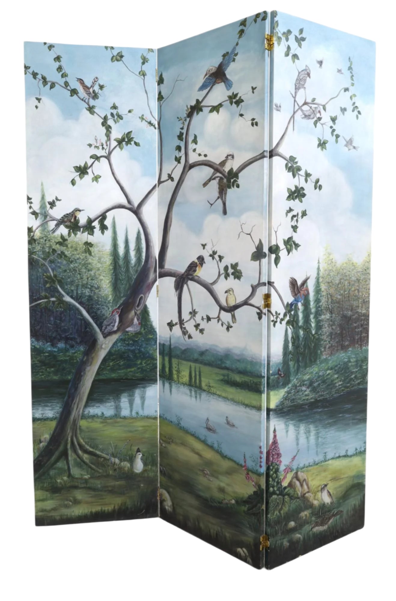 This captivating three-panel screen by Maitland Smith showcases a serene pastoral scene, where delicate songbirds perch gracefully on winding branches against an idyllic river landscape. Signed by the artist, it’s a standout statement piece perfect for an entryway, bedroom, or study. Retaining its original brass hinges, the screen is beautifully maintained with light, age-appropriate wear that adds warmth and authenticity. Minor scuffs along the base and a few subtle scuffs on the panel edges further enhance its vintage charm, making this artisan work truly one of a kind.