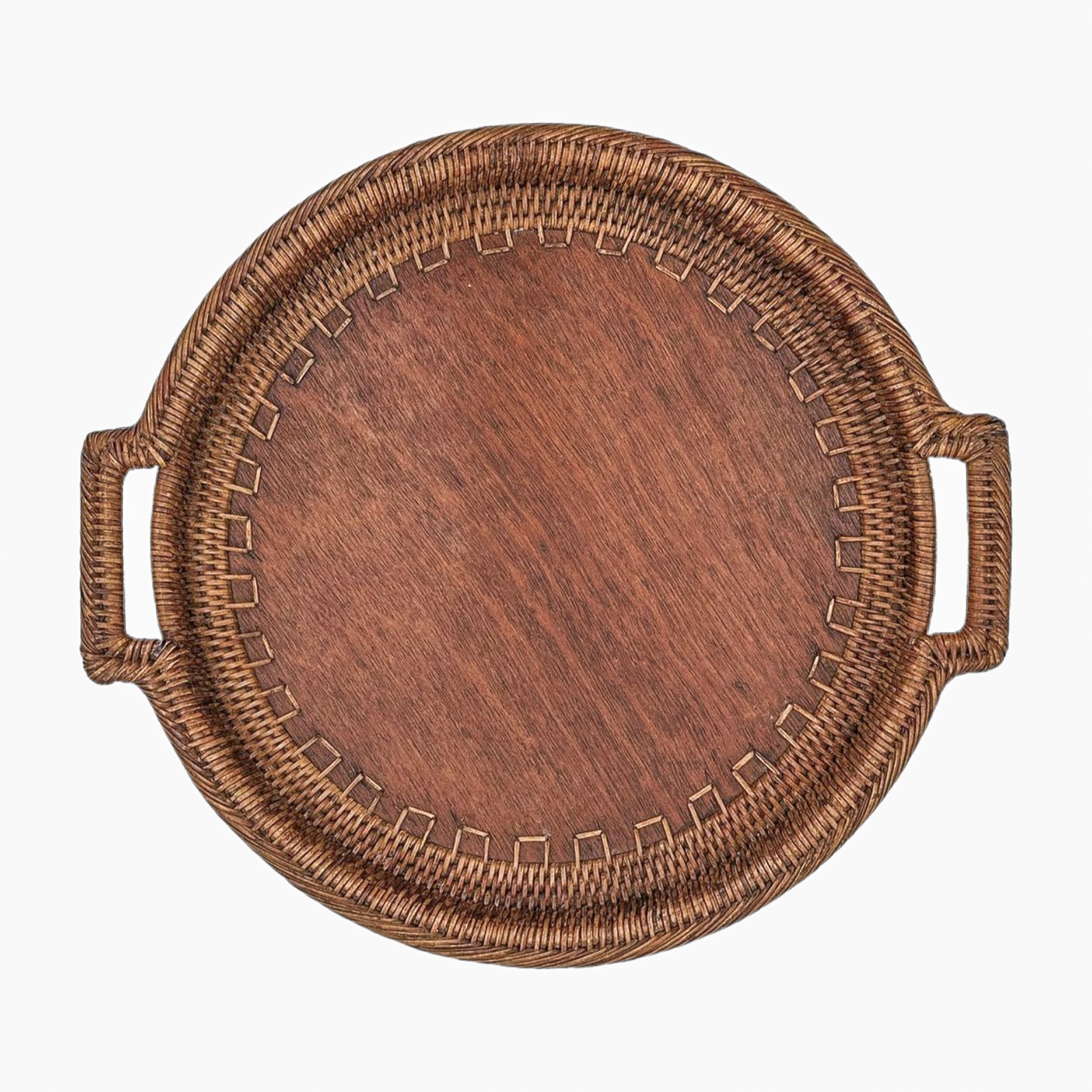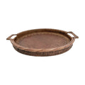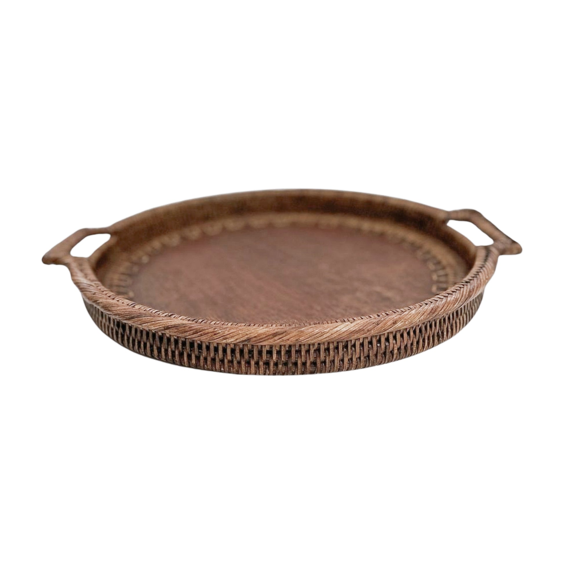 Woven Tray: 18”Diam (handle to handle) 14.75”Diam (interior) x 1.75”H
