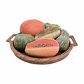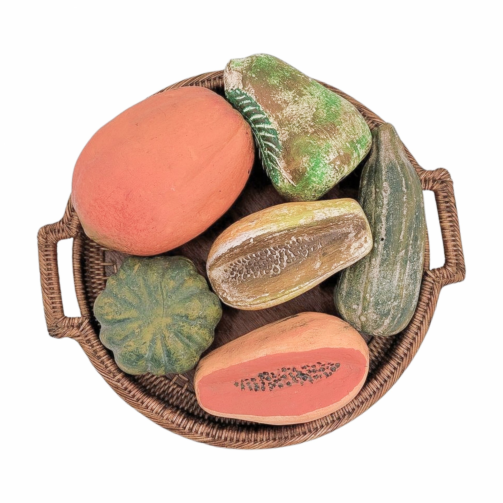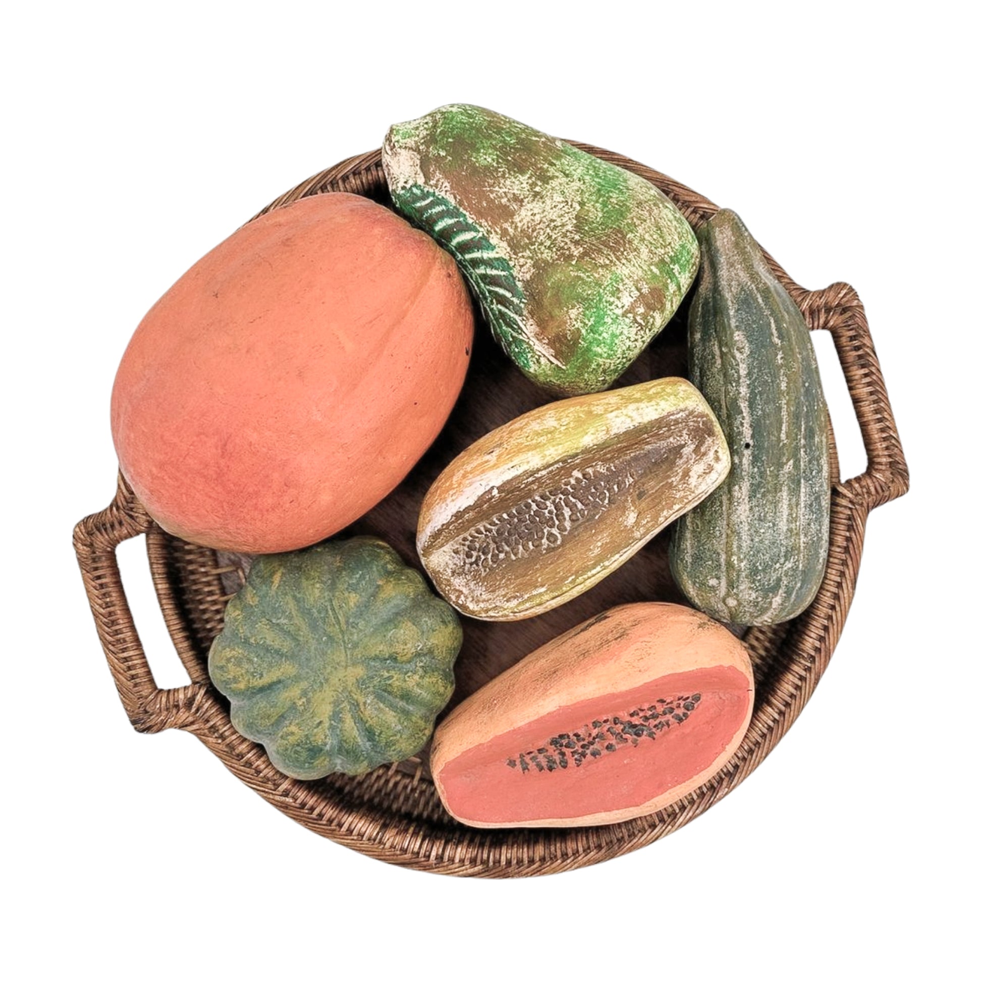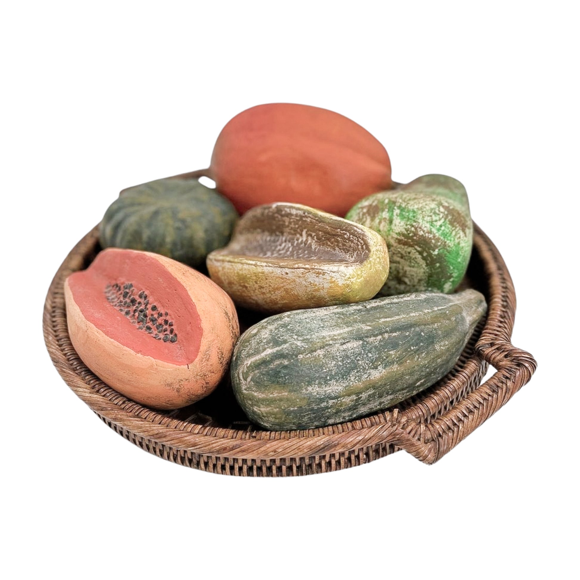A wonderfully surreal still life in three dimensions—this oversized fruit set was handmade in Mexico using what appear to be stone molds, giving each piece a substantial, slightly weighty feel. The set includes six large, vividly painted fruits and a matching tray, all crafted with sculptural presence and a hint of folk art whimsy. The small holes on the underside of each fruit suggest traditional casting methods, adding to their handmade charm. Whether styled together on a table or split up for visual interest on a shelf, this is the kind of piece that makes people stop and smile.