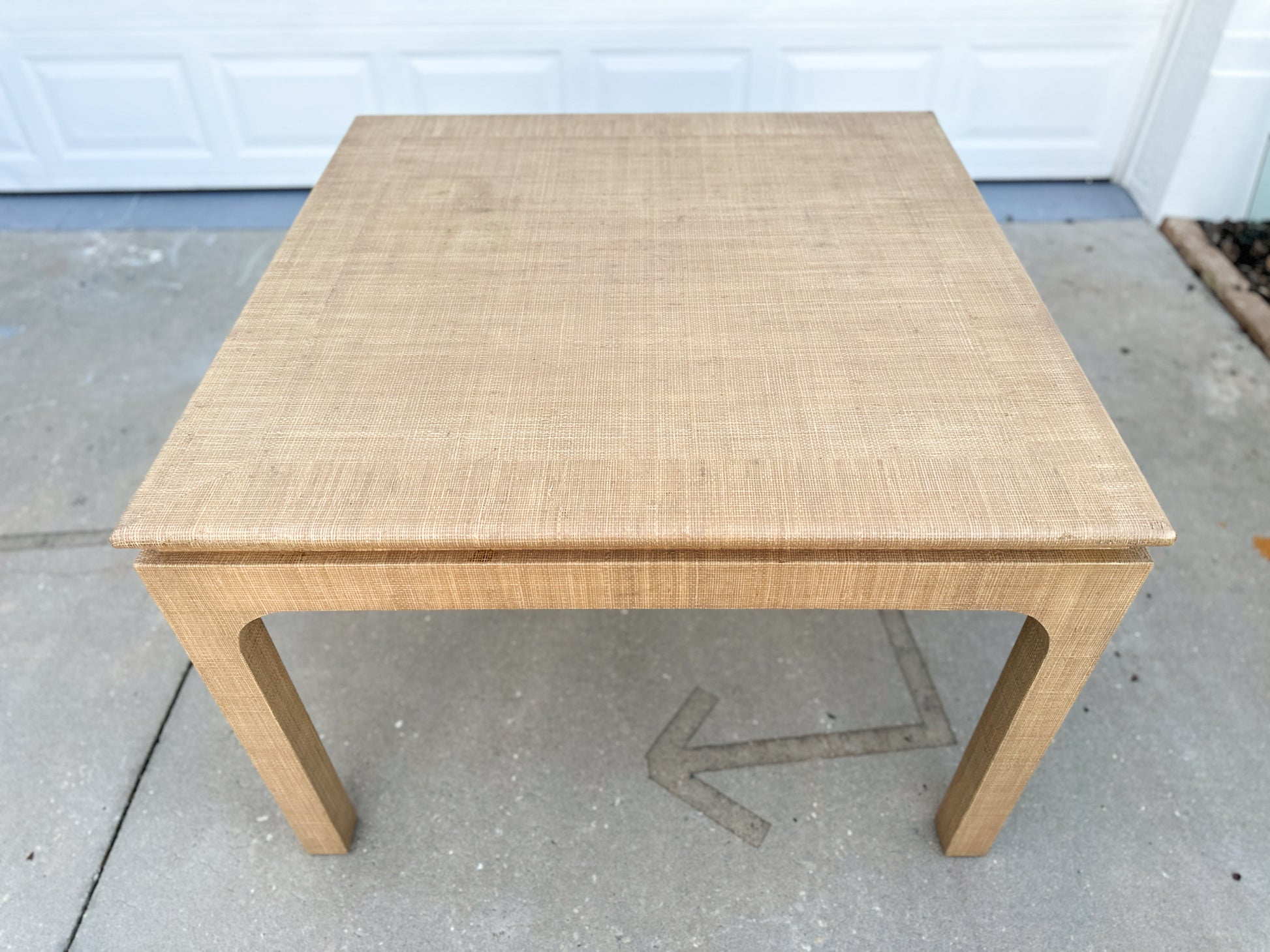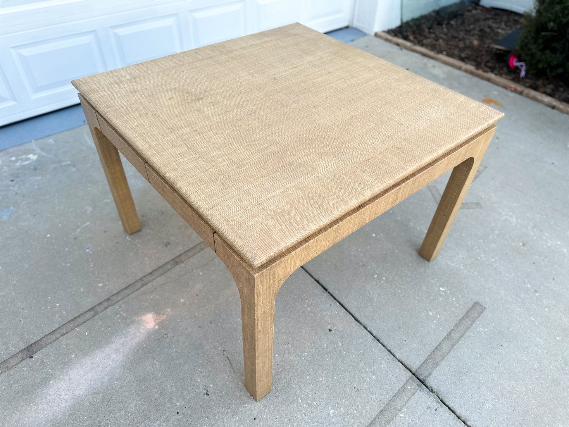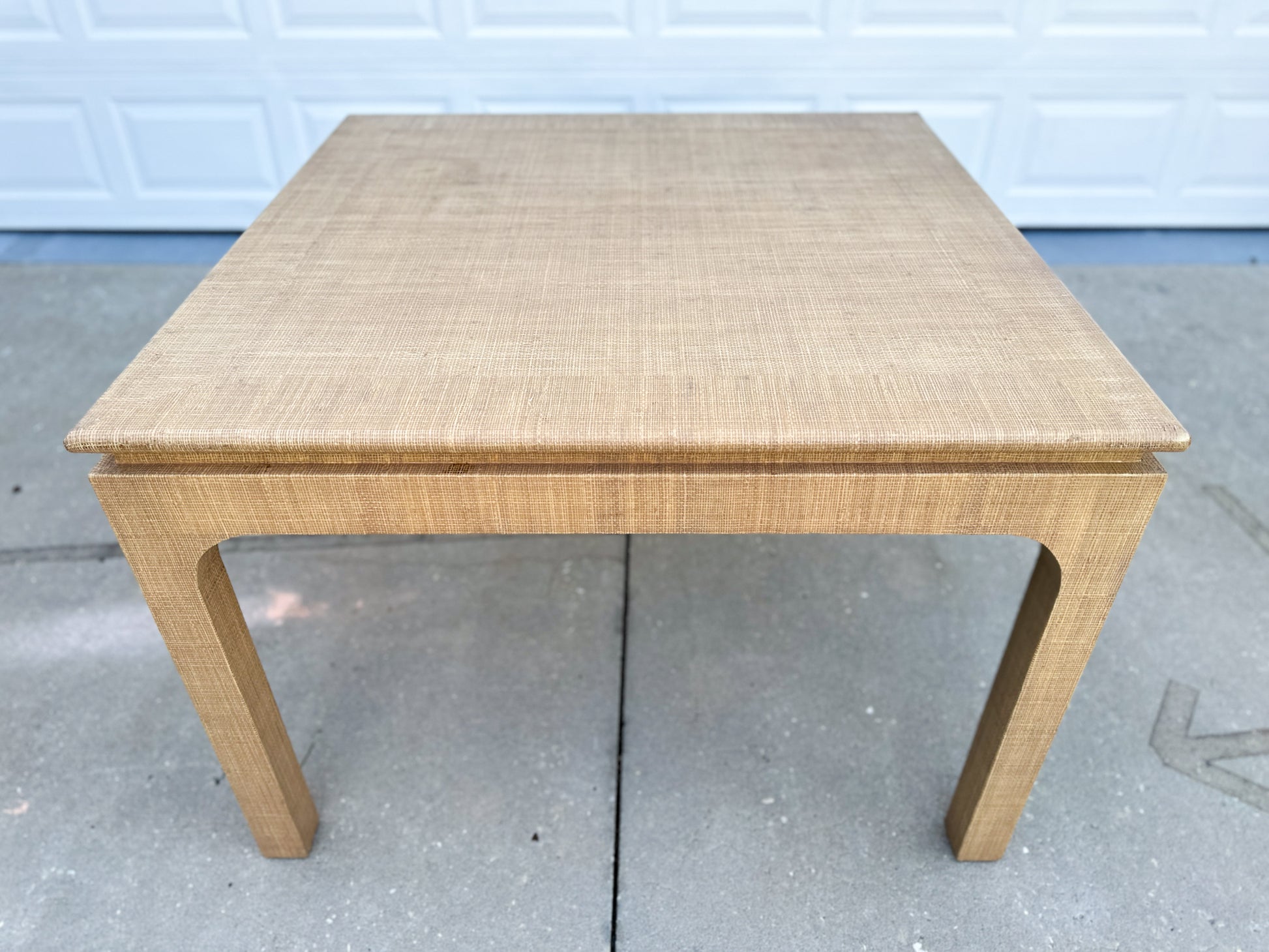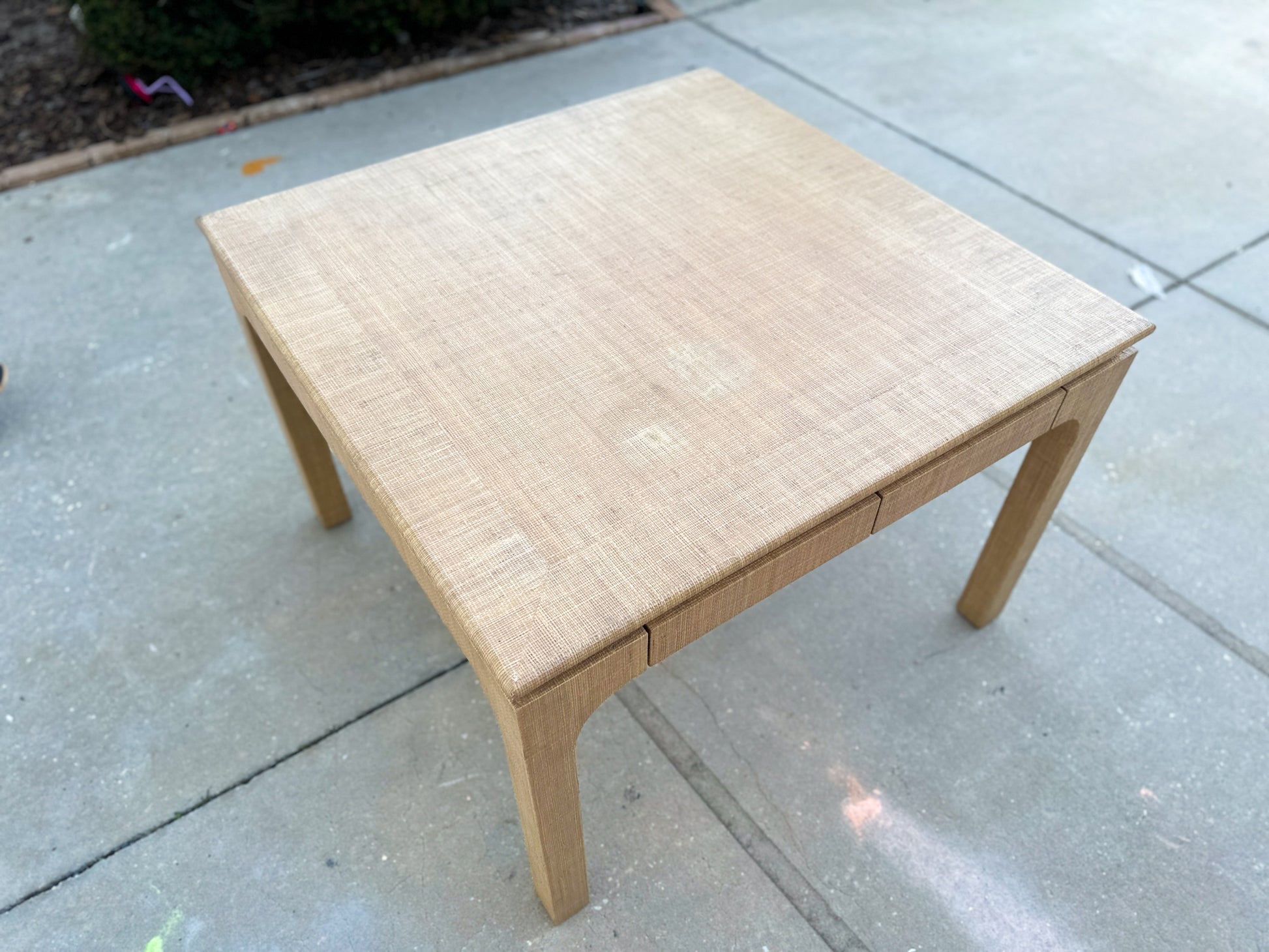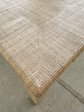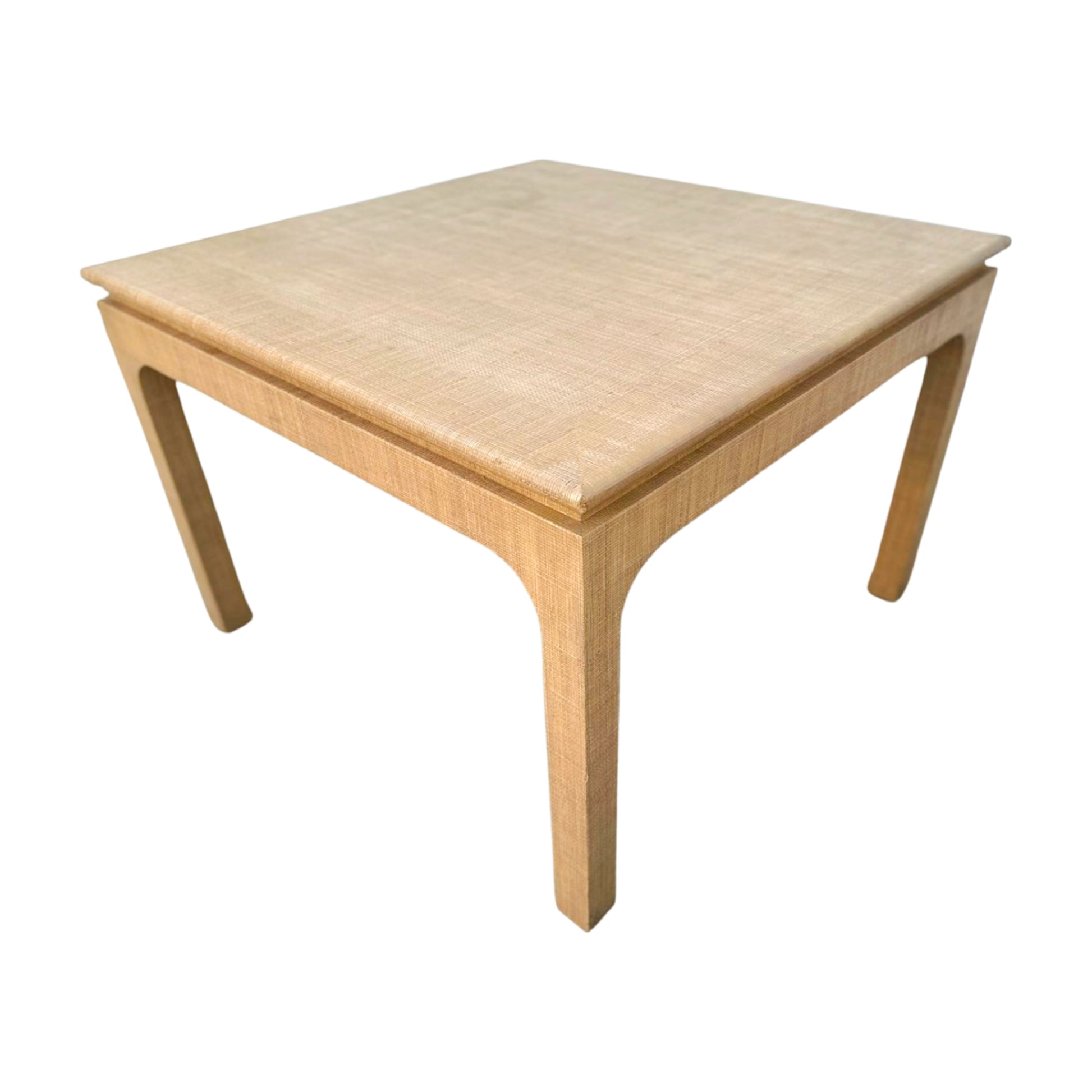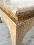 A classic silhouette meets tactile charm in this raffia-clad Parsons-style table by Harrison Van Horn. Wrapped in woven grasscloth with softly rounded waterfall legs, its tailored form is elevated by rich texture and a warm, natural tone. Two concealed drawers glide open with ease—perfect for stashing cocktail napkins, matches, or remotes without disrupting the clean lines. A statement in quiet luxury, whether styled as a breakfast table, games table, or center hall anchor.