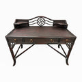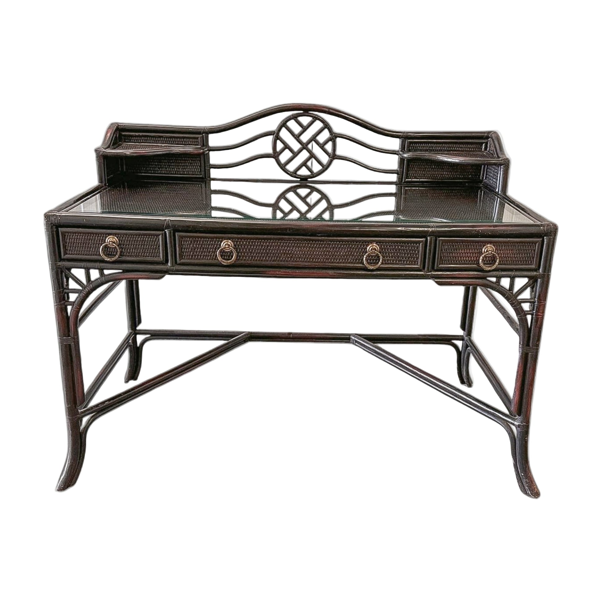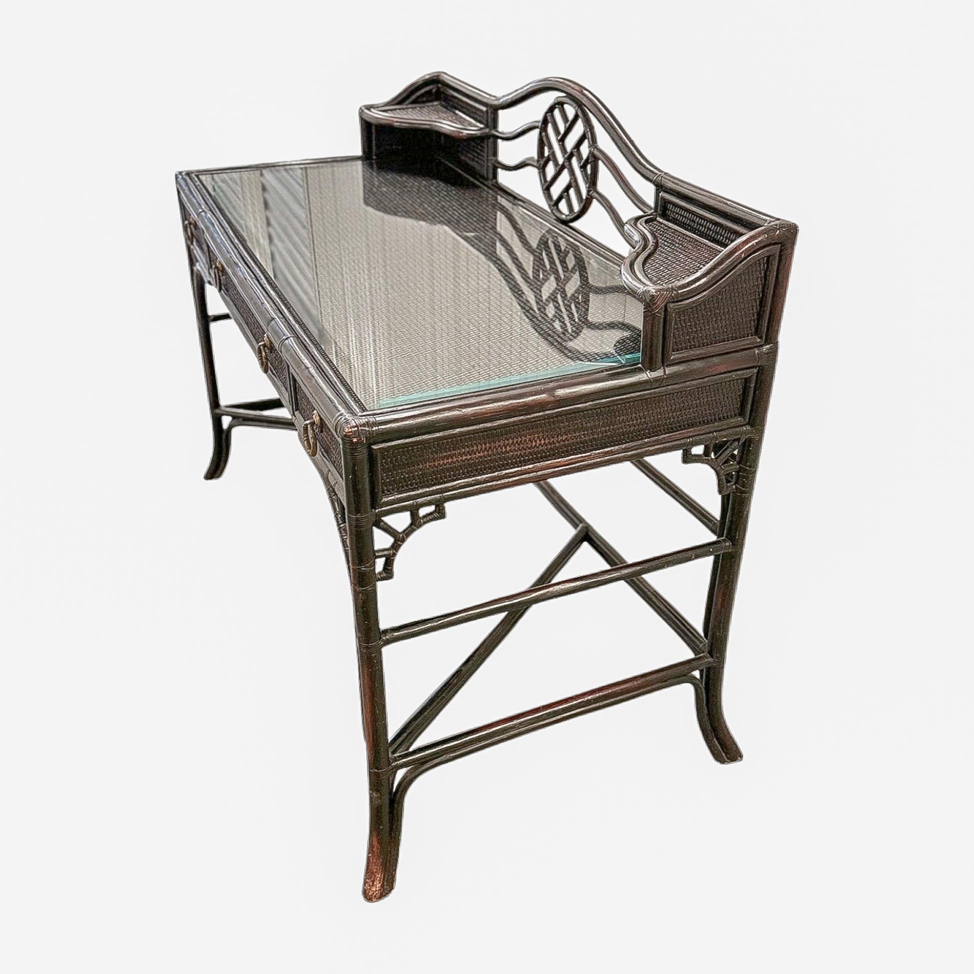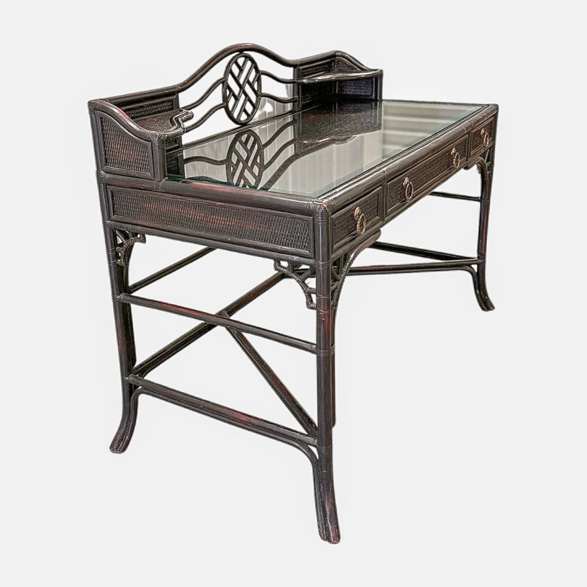 Hekman knew how to do structure. This ebonized rattan writing desk takes Chinoiserie curves and adds just enough gravitas via deep black lacquer, brass pulls, and graphic fretwork. The proportions are clean. The effect is quietly commanding.