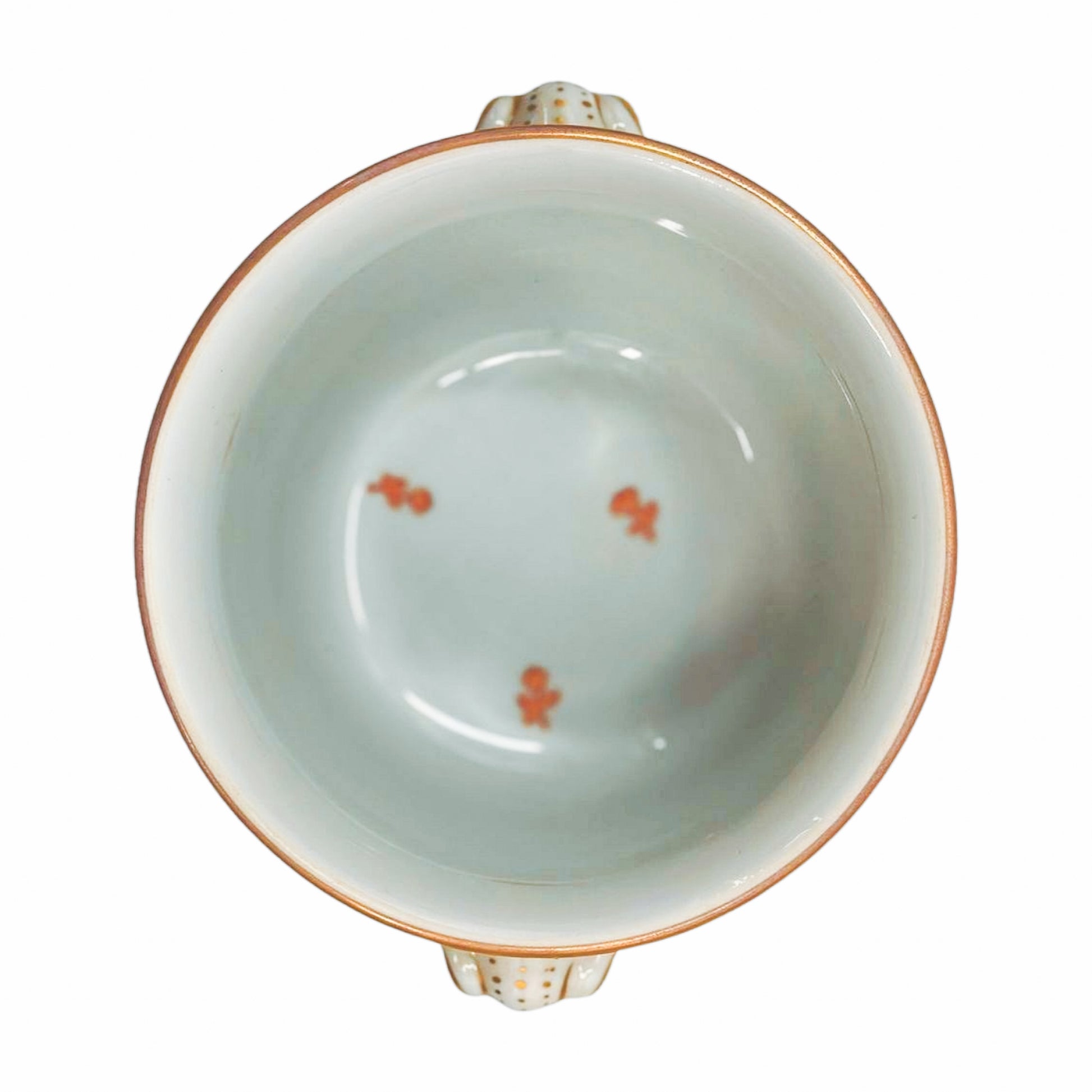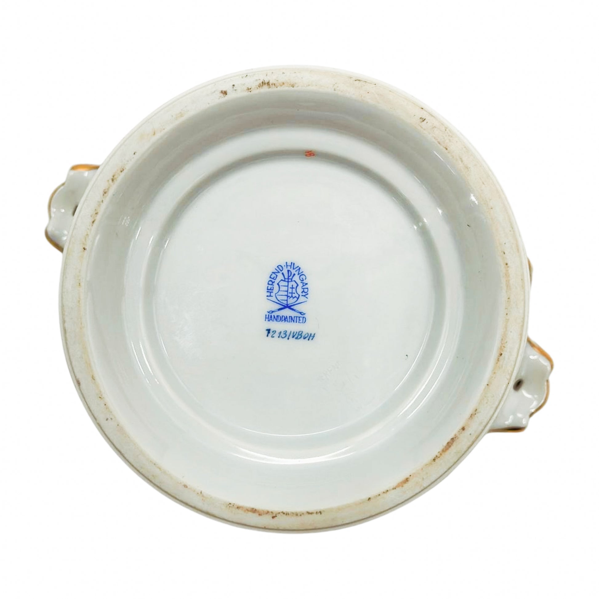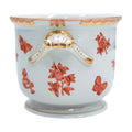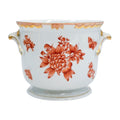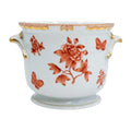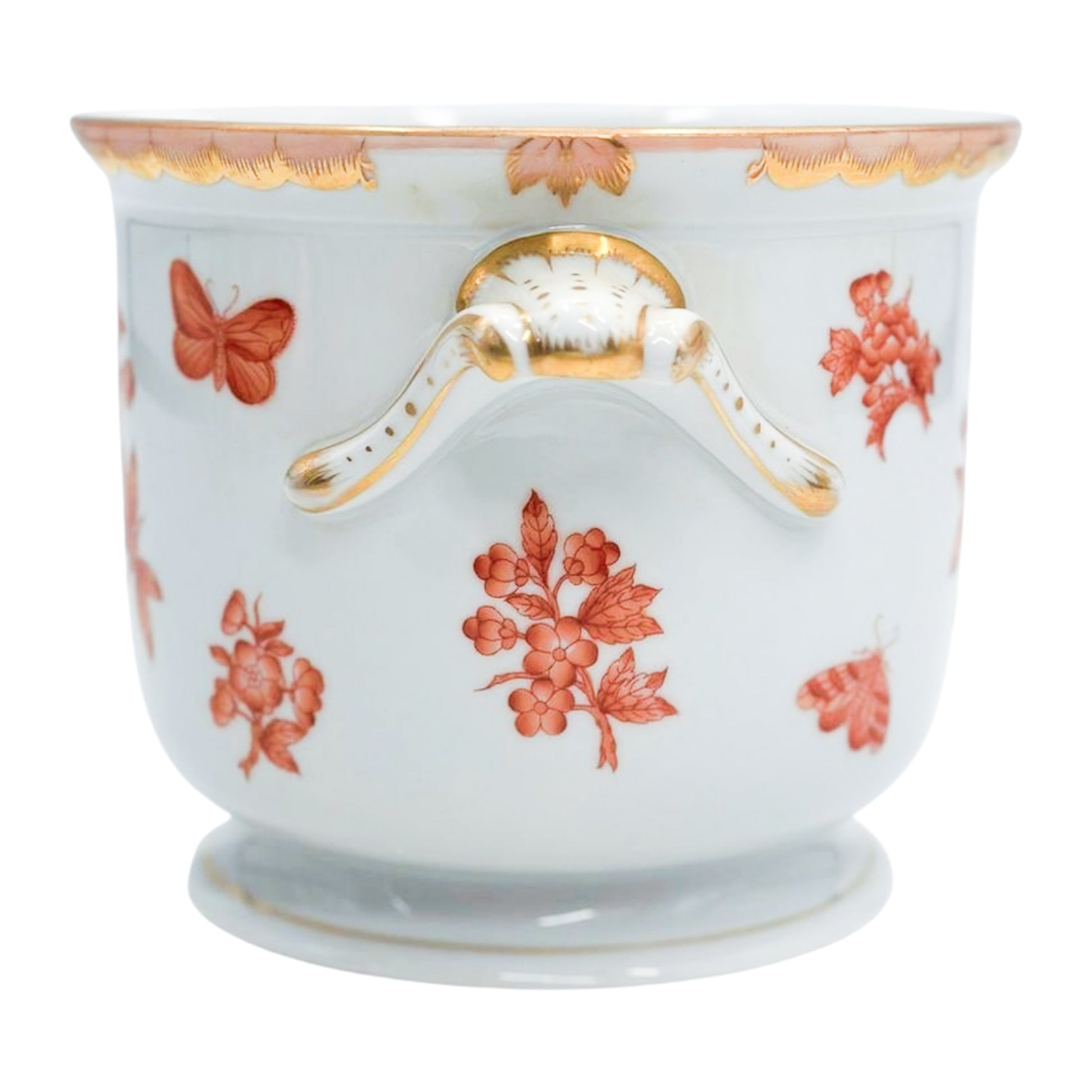 A classic silhouette dressed up just enough. This hand-painted Herend cachepot features the iconic rust floral motif—crisp, warm, and unmistakably refined. Butterfly and blossom details float across the porcelain, framed by gilded handles and a scalloped rim. Elegant without being delicate, it’s just as suited to orchids as it is to ice tongs.