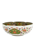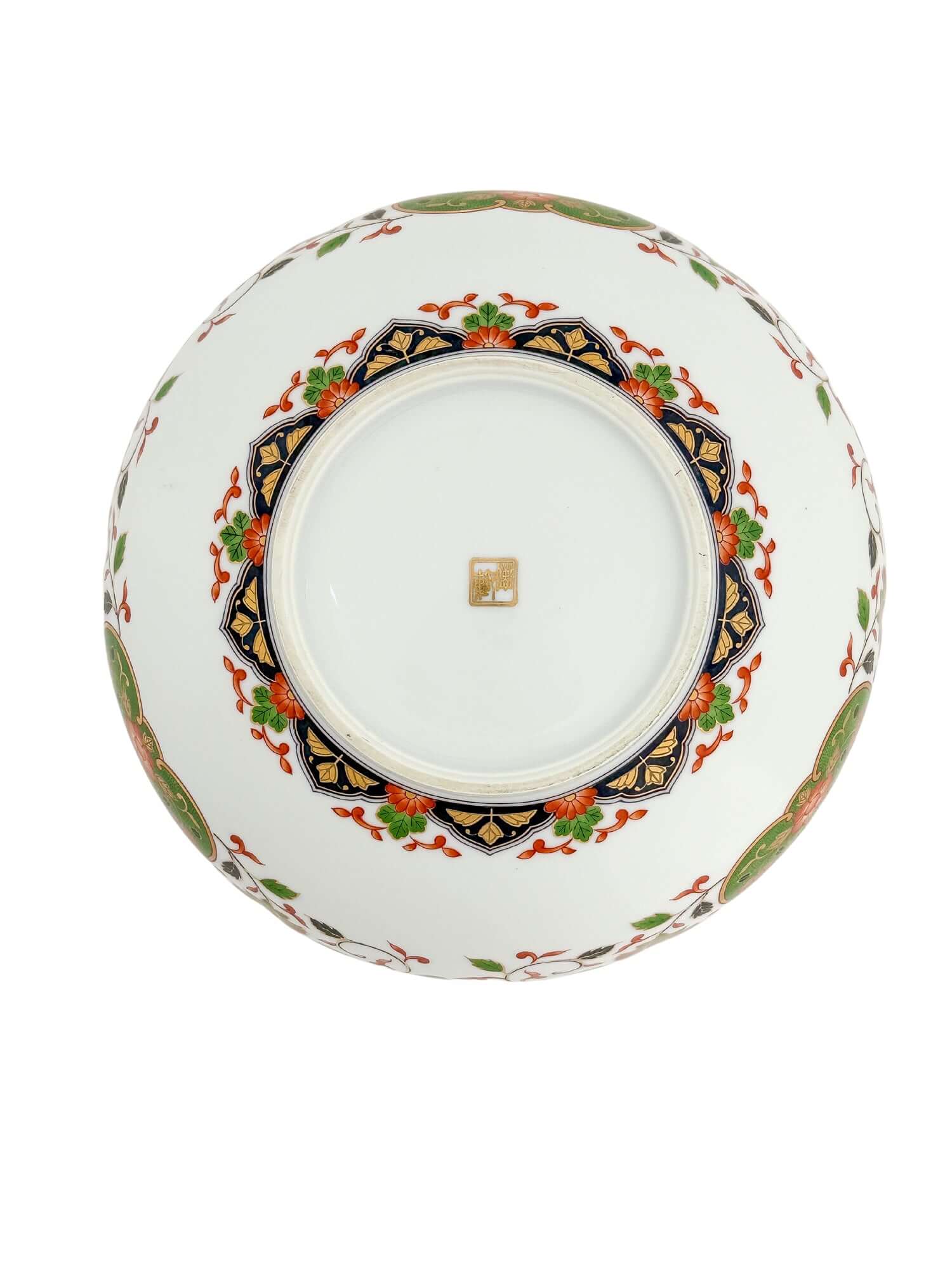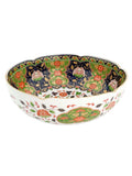 A dazzling statement in porcelain, balancing ornate florals with crisp symmetry. The interior is richly decorated in traditional Imari style—scrolling gold vines, scarlet peonies, and layered panels of navy and green. A gently scalloped rim repeats the motifs with restraint, giving dimension without overwhelm. Just under 10″ in diameter, it holds its own as display or centerpiece.