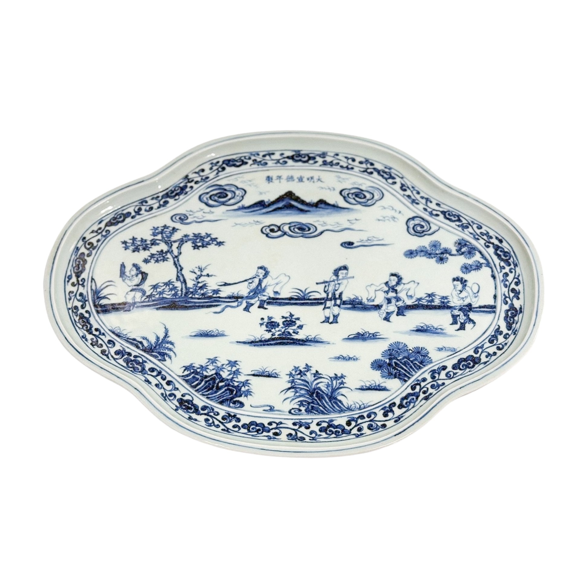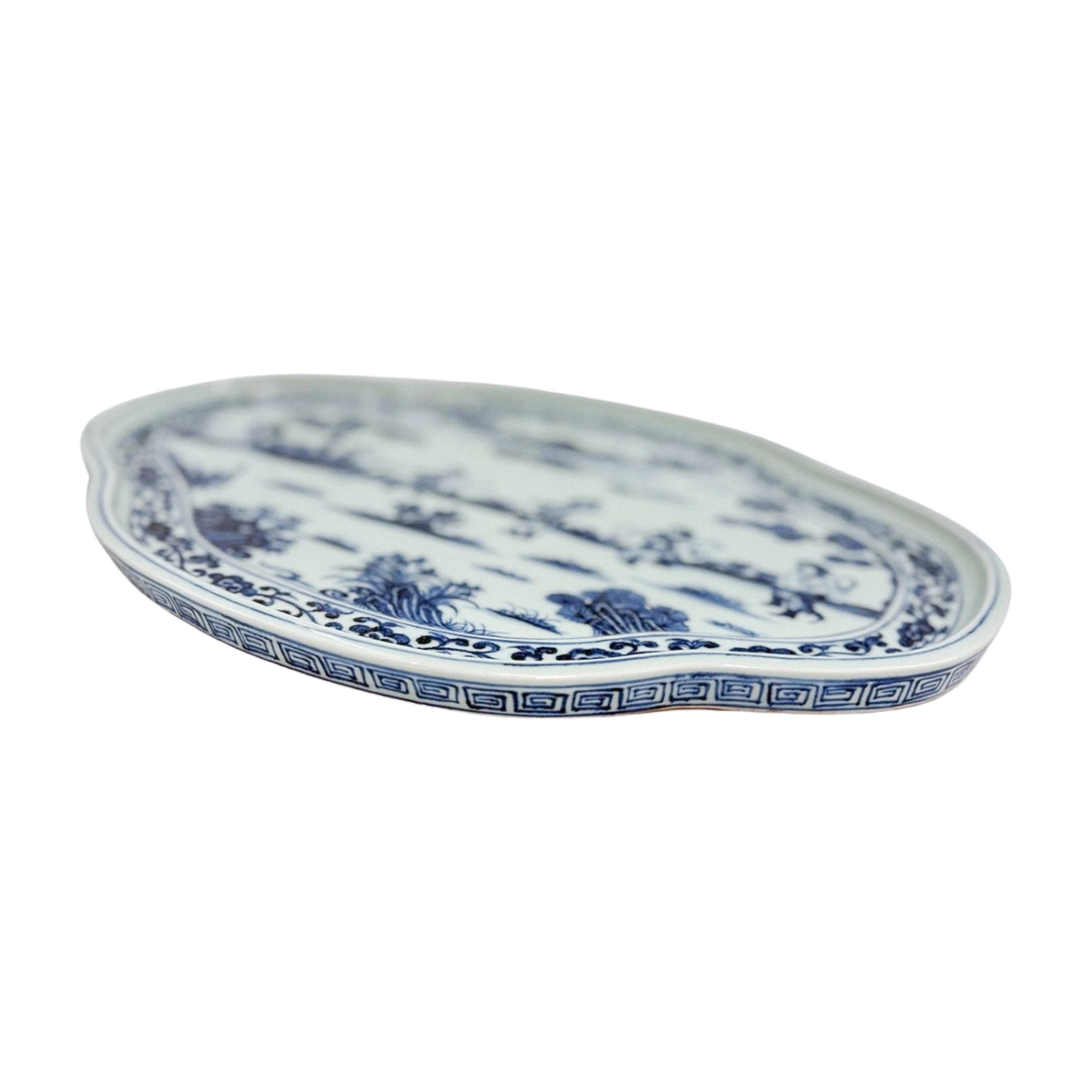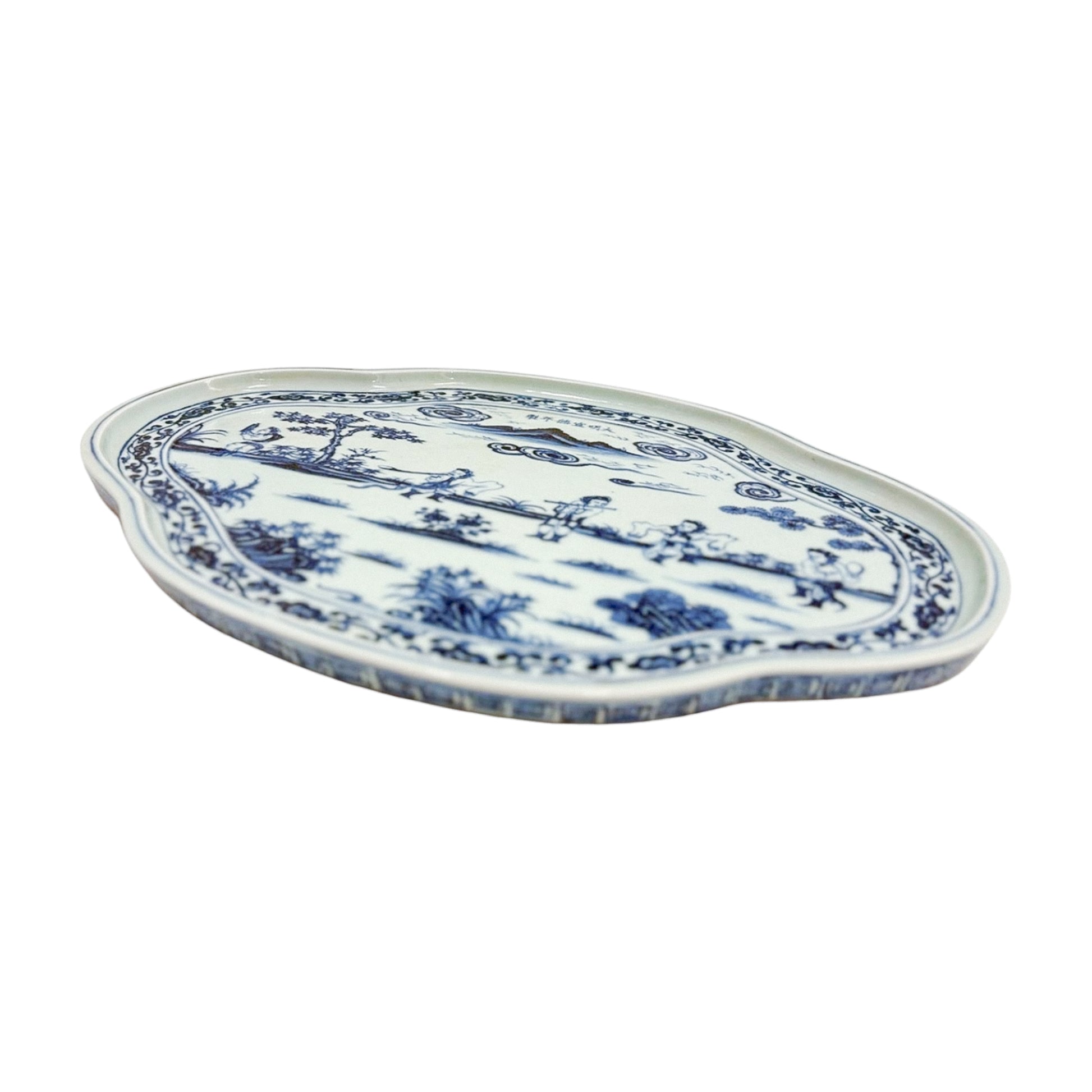 A generous porcelain tray with scalloped edges and an intricate village scene in inky cobalt. It leans traditional, but the scale and painterly detail give it real presence. This is the kind of tray that makes a table feel thought through.