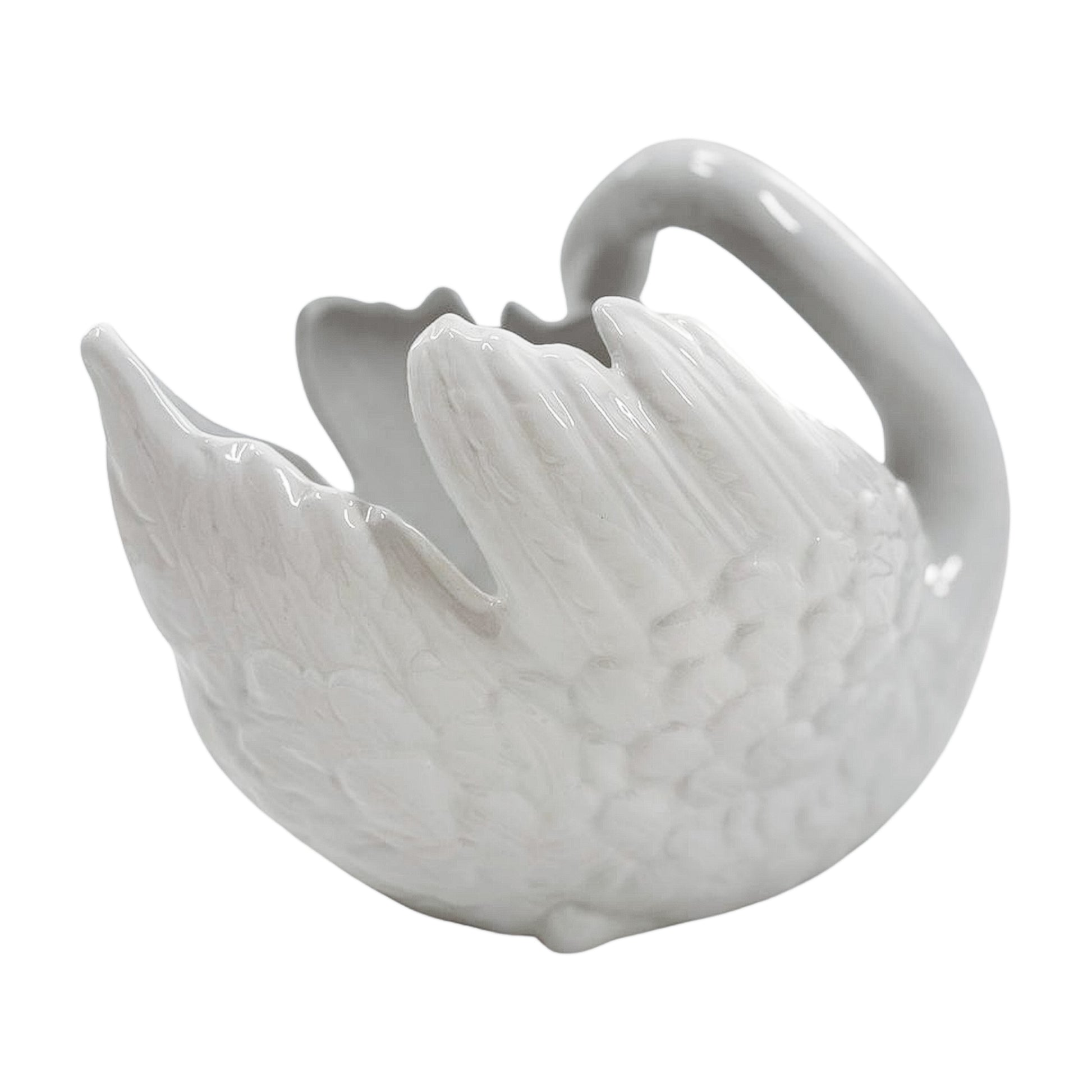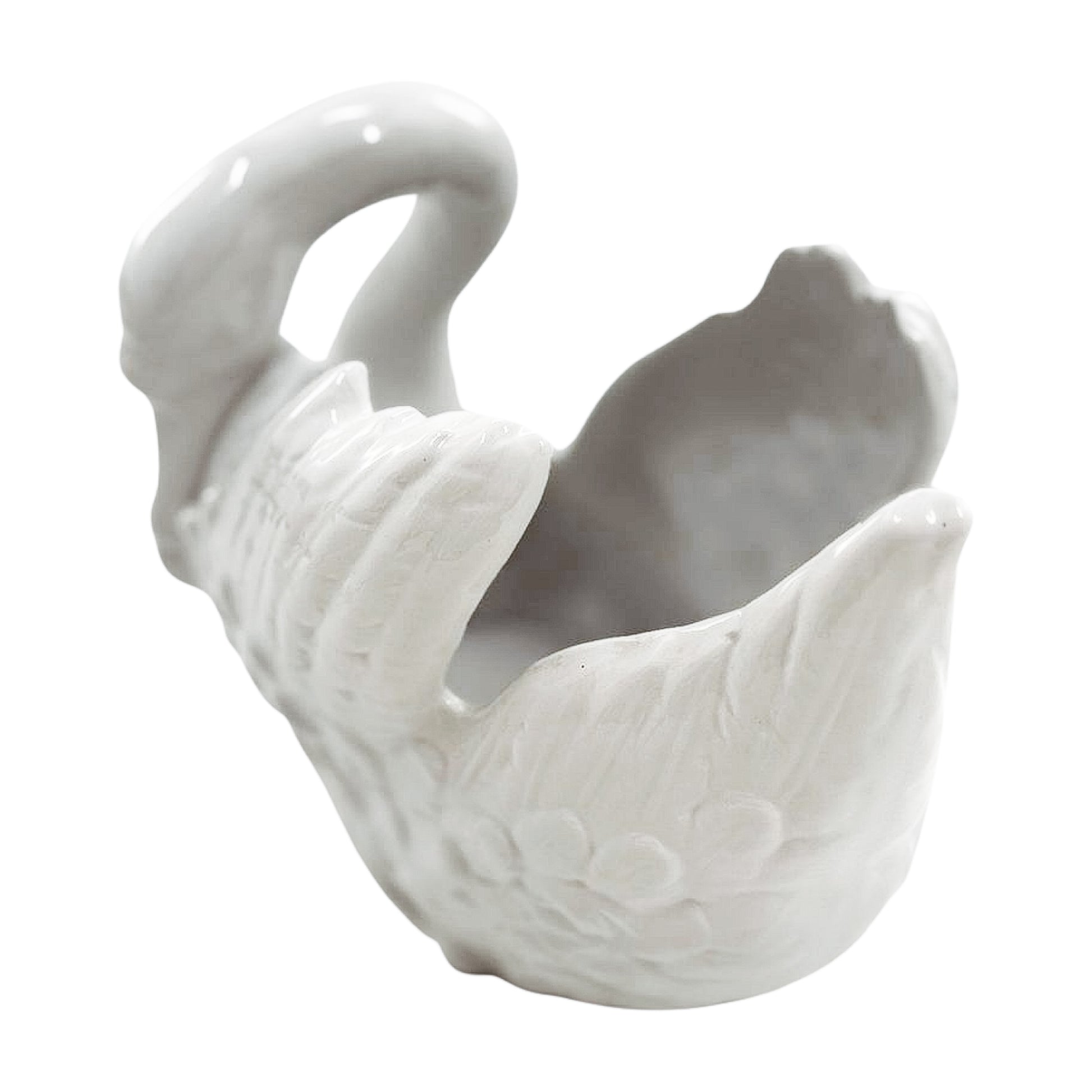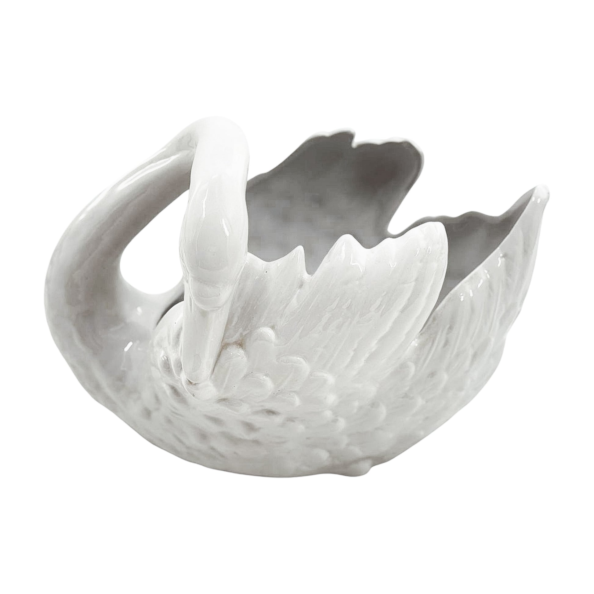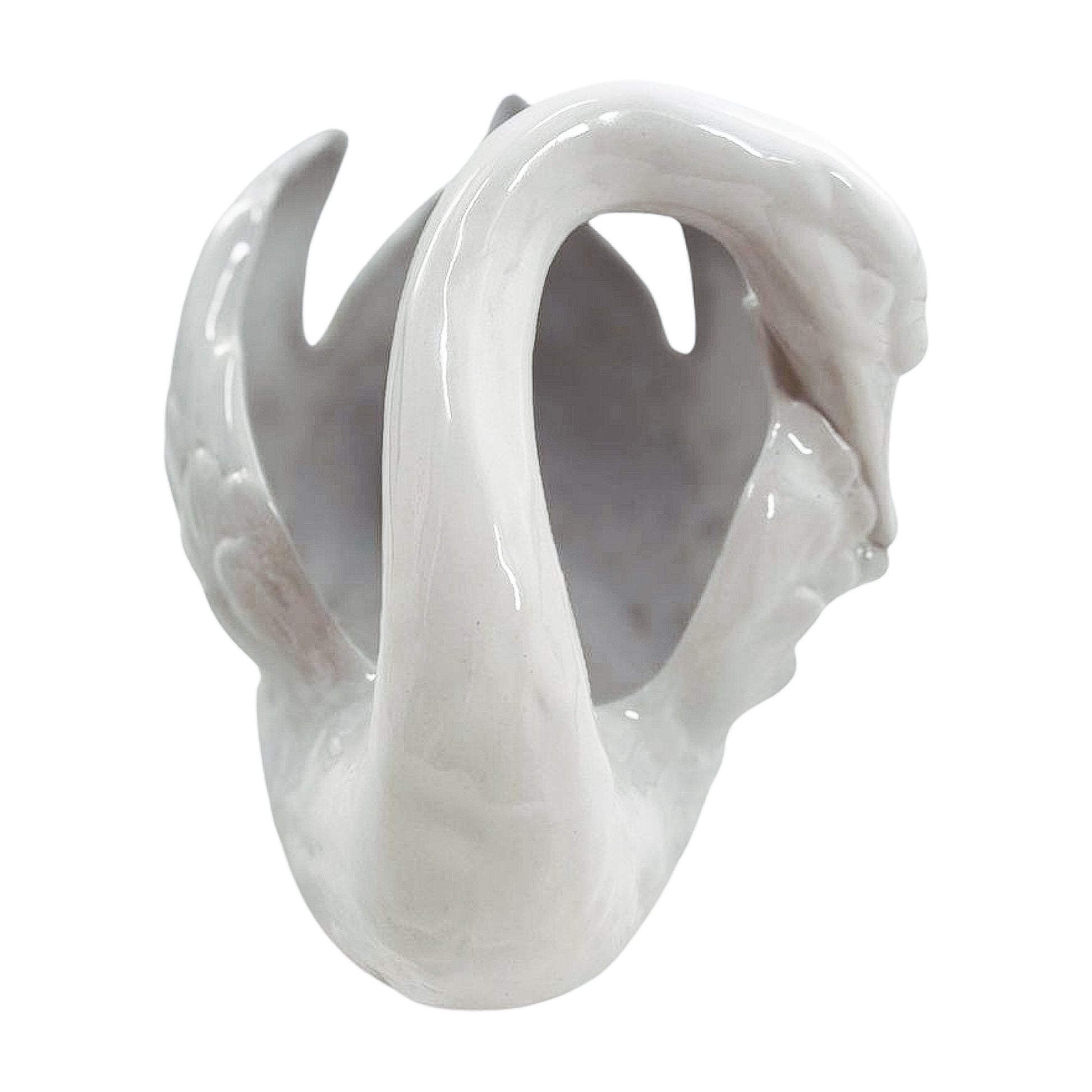 All curve and sweep, this vintage swan has presence without pretense. A glossy white glaze and sculptural form make it a solid choice for centerpieces, frond-heavy floral arrangements—or just admiration on its own.
