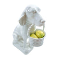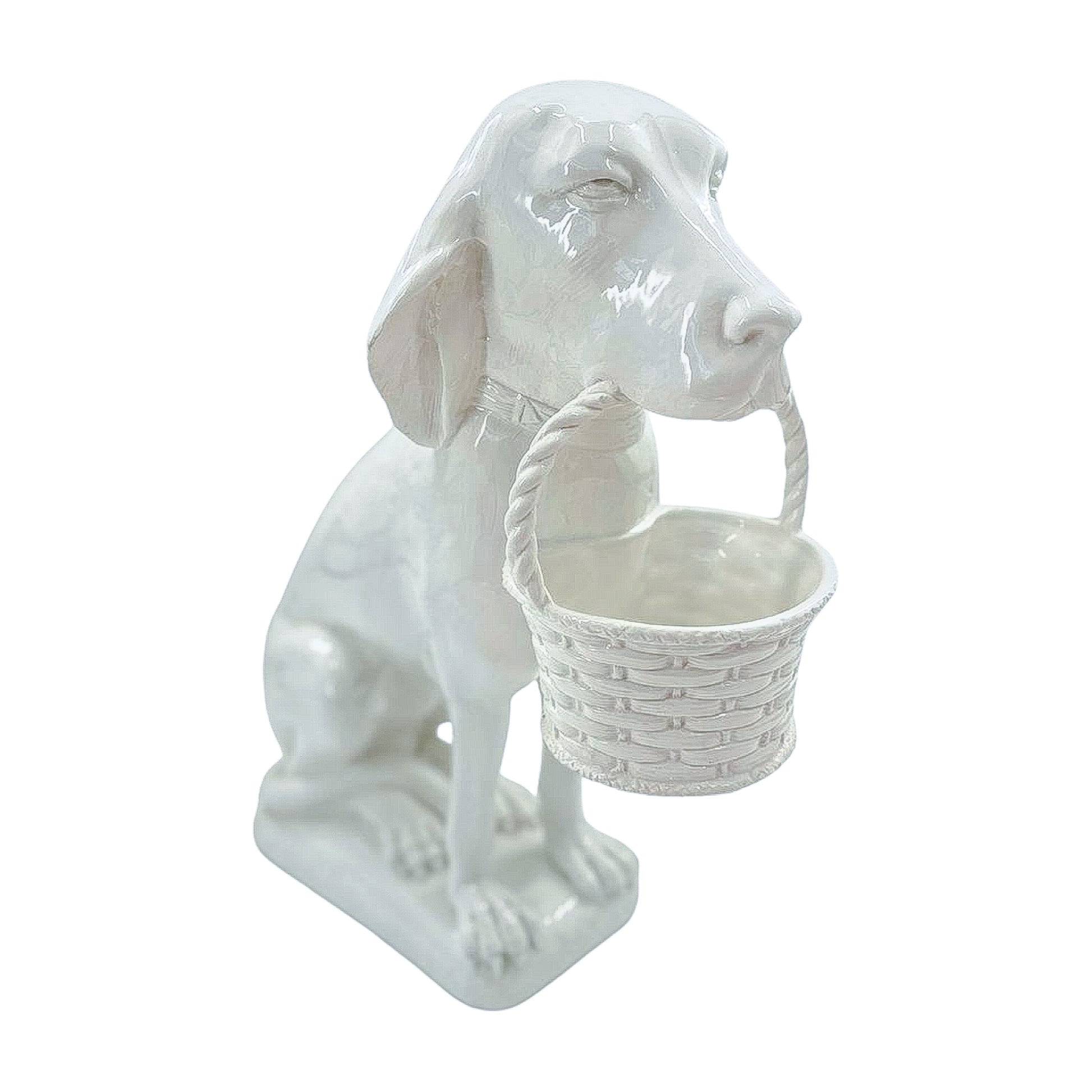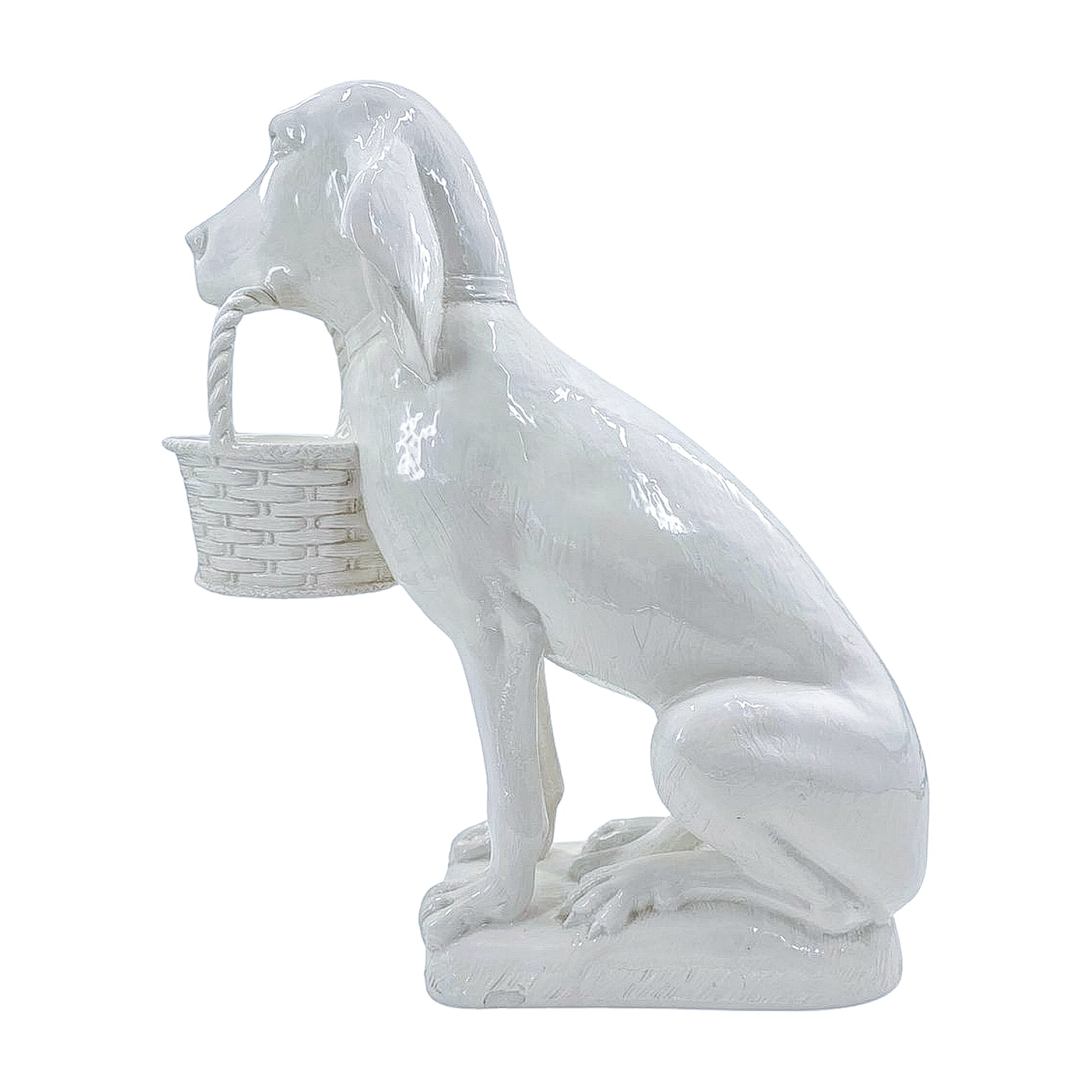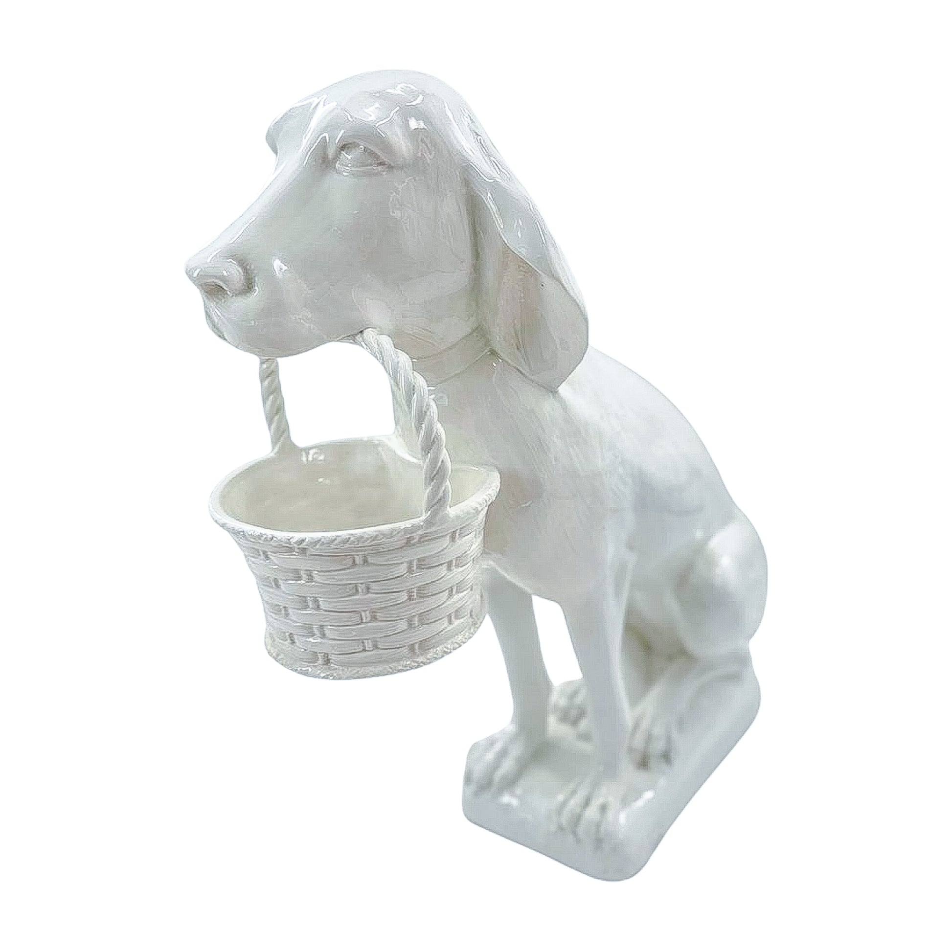 Endearing and elegant, this life-size porcelain dog figurine, marked “Italy,” gently holds a basket filled with removable ceramic lemons, crafted with delicate attention to detail and a glossy white finish. The serene expression and charming basket weave texture add character and grace, making it a darling companion for an entryway, sunroom, garden, or any welcoming space. Perfect for adding a whimsical yet sophisticated statement, this piece effortlessly combines charm and presence.