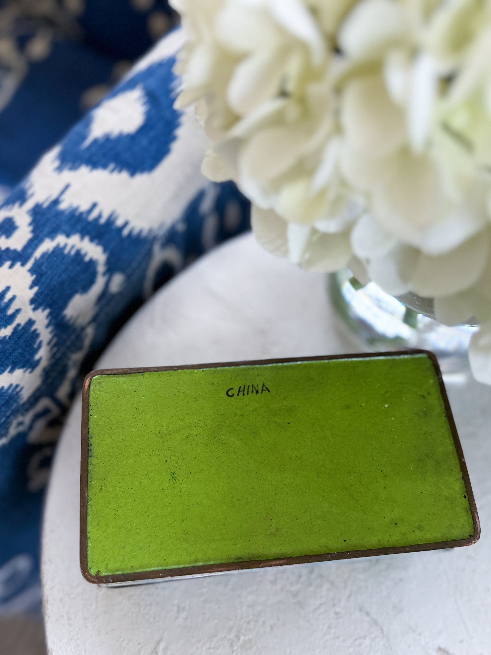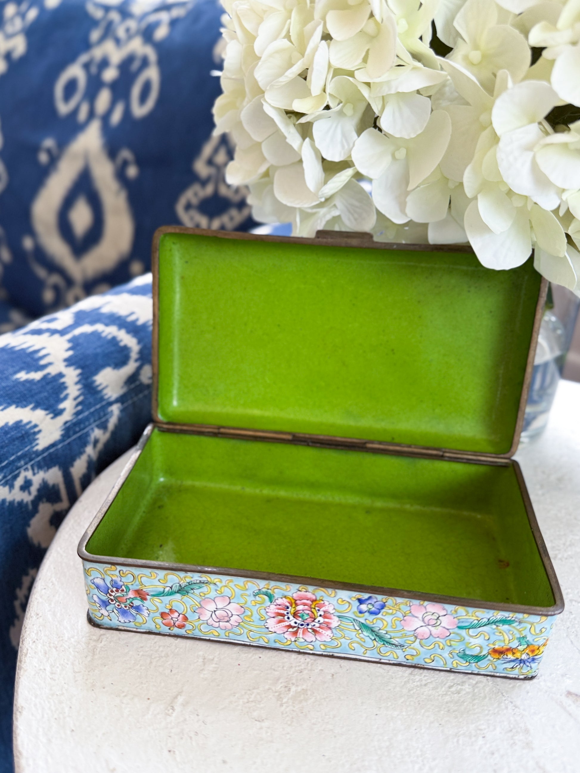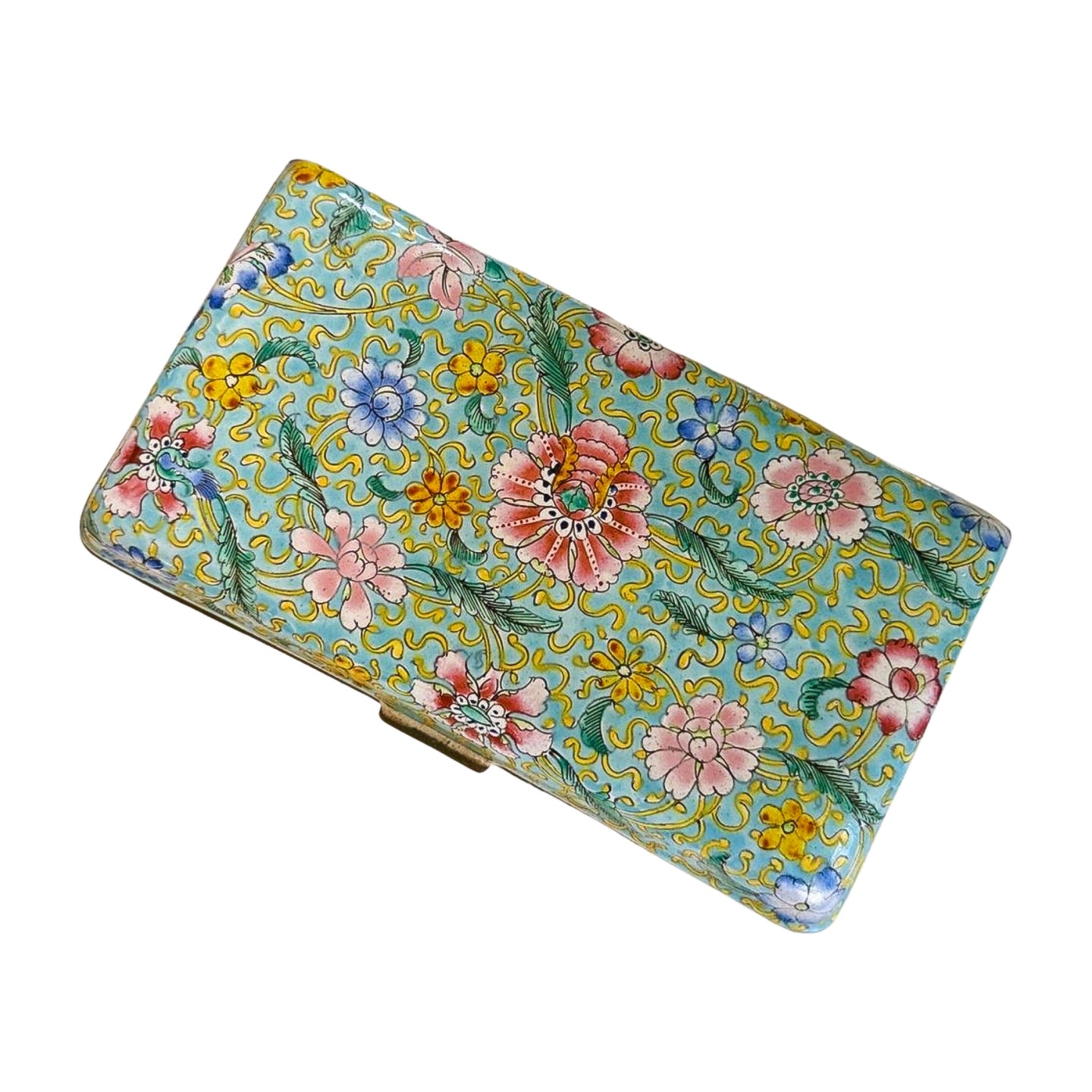 An elongated rectangular form in soft turquoise enamel with scrolling gilt wire and scattered florals in pink, yellow, and blue.