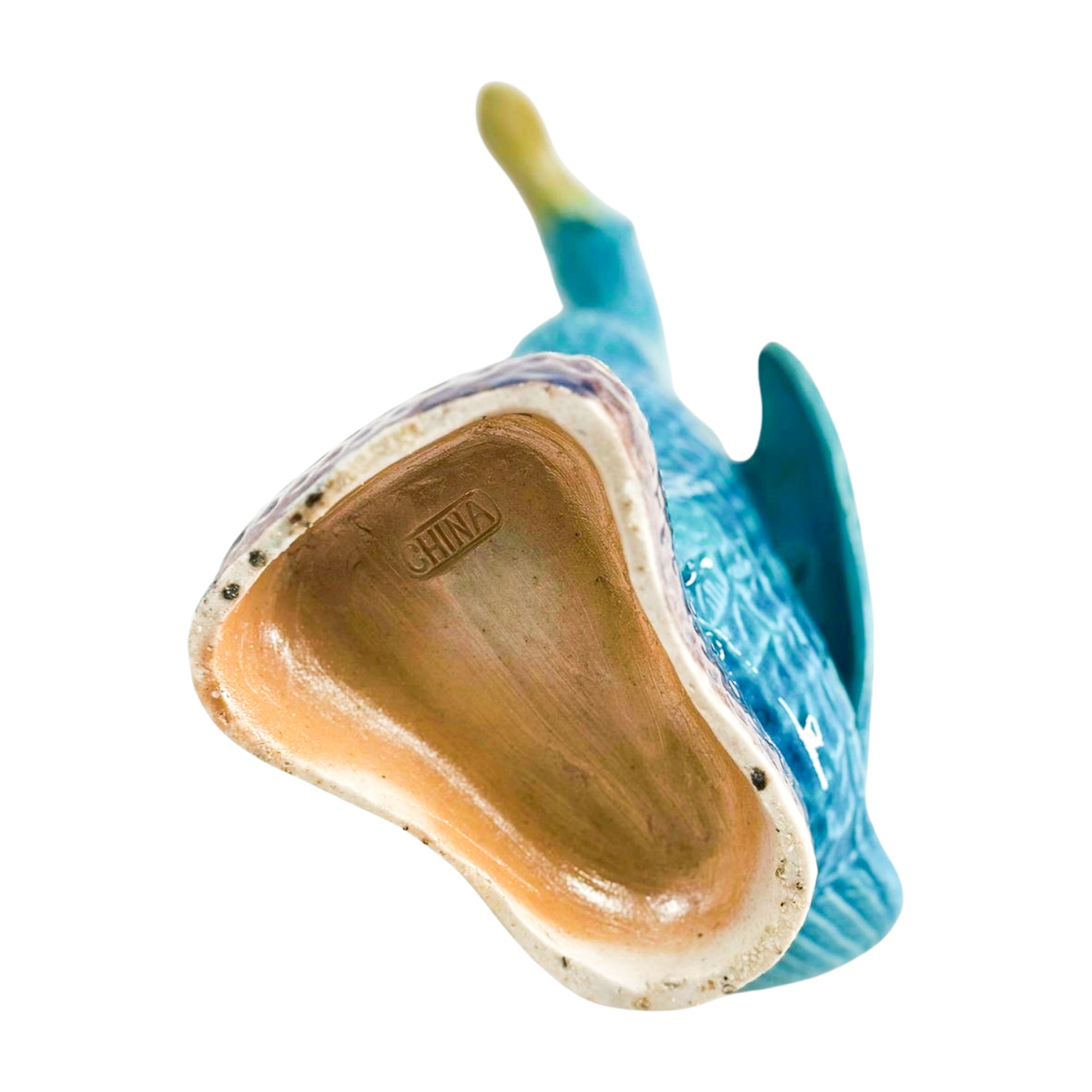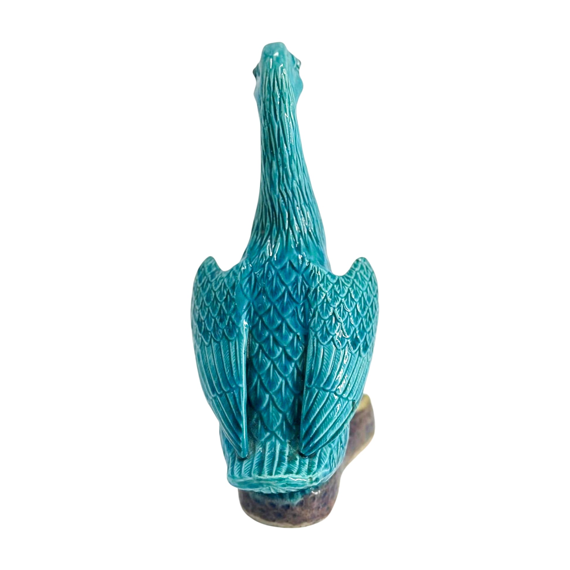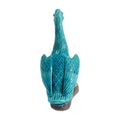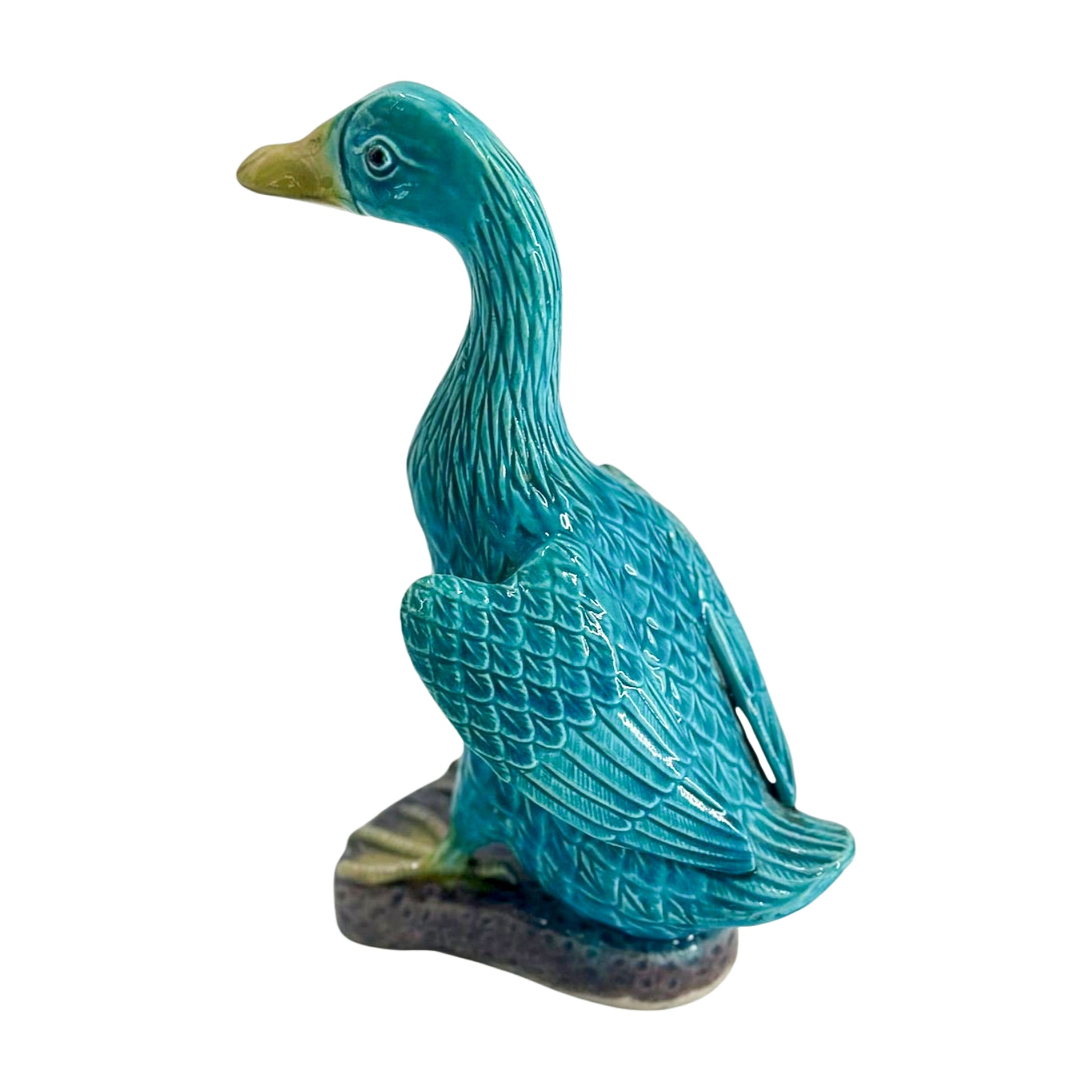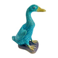 Whimsical and wonderfully glazed, this turquoise duck brings charm to a bookshelf, windowsill, or bar cart. Rich in detail and saturated in jewel tones, it perches proudly with webbed feet and curious expression.