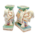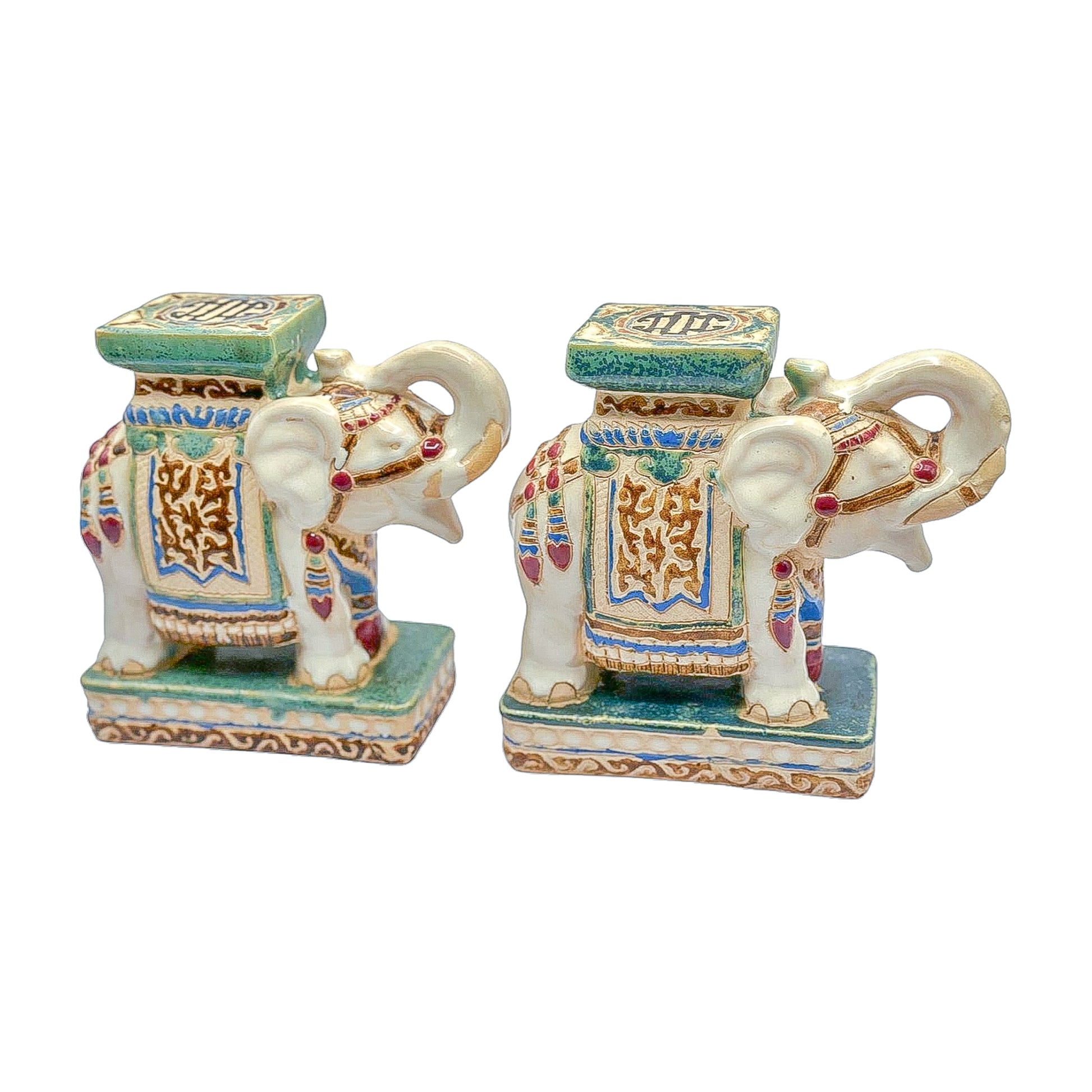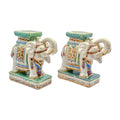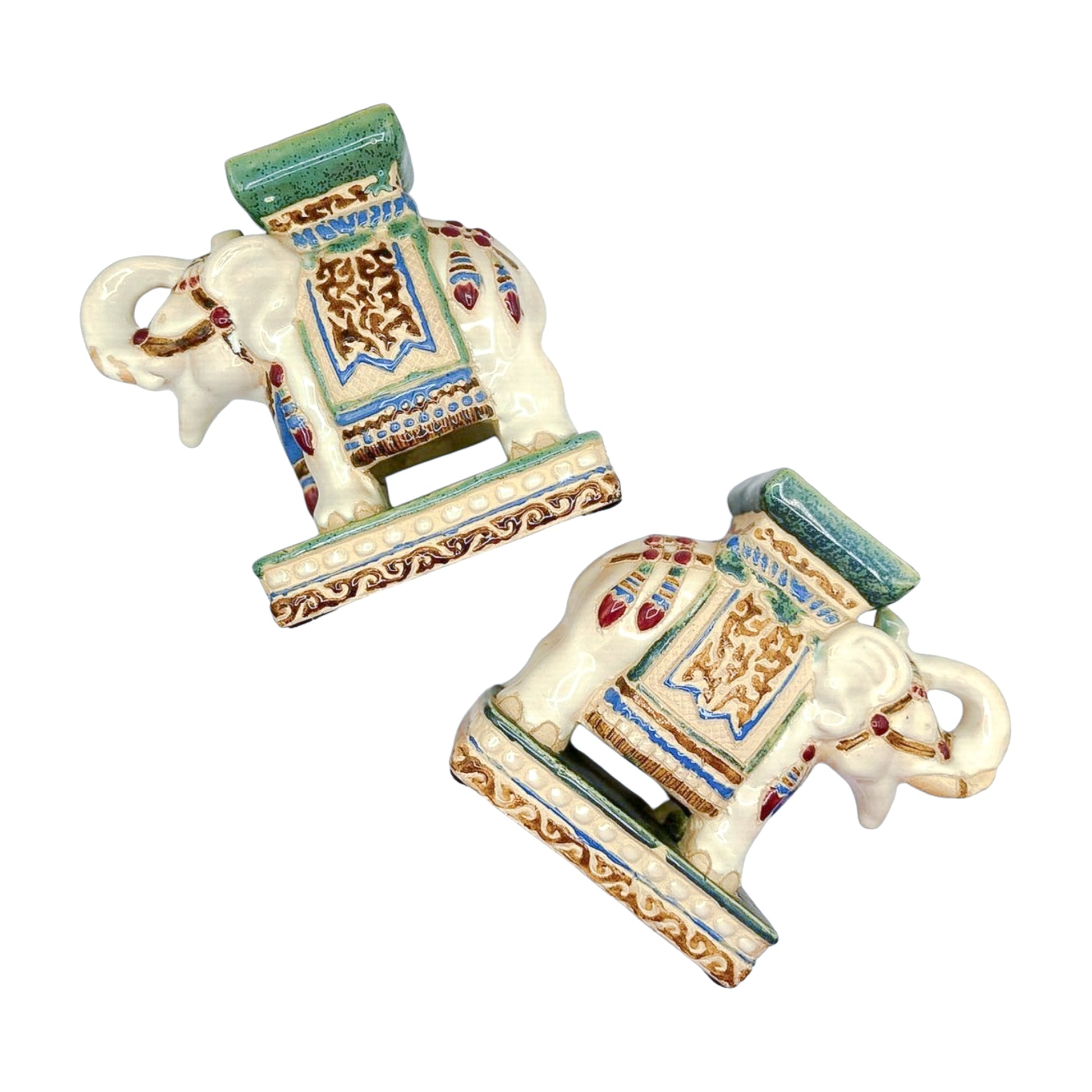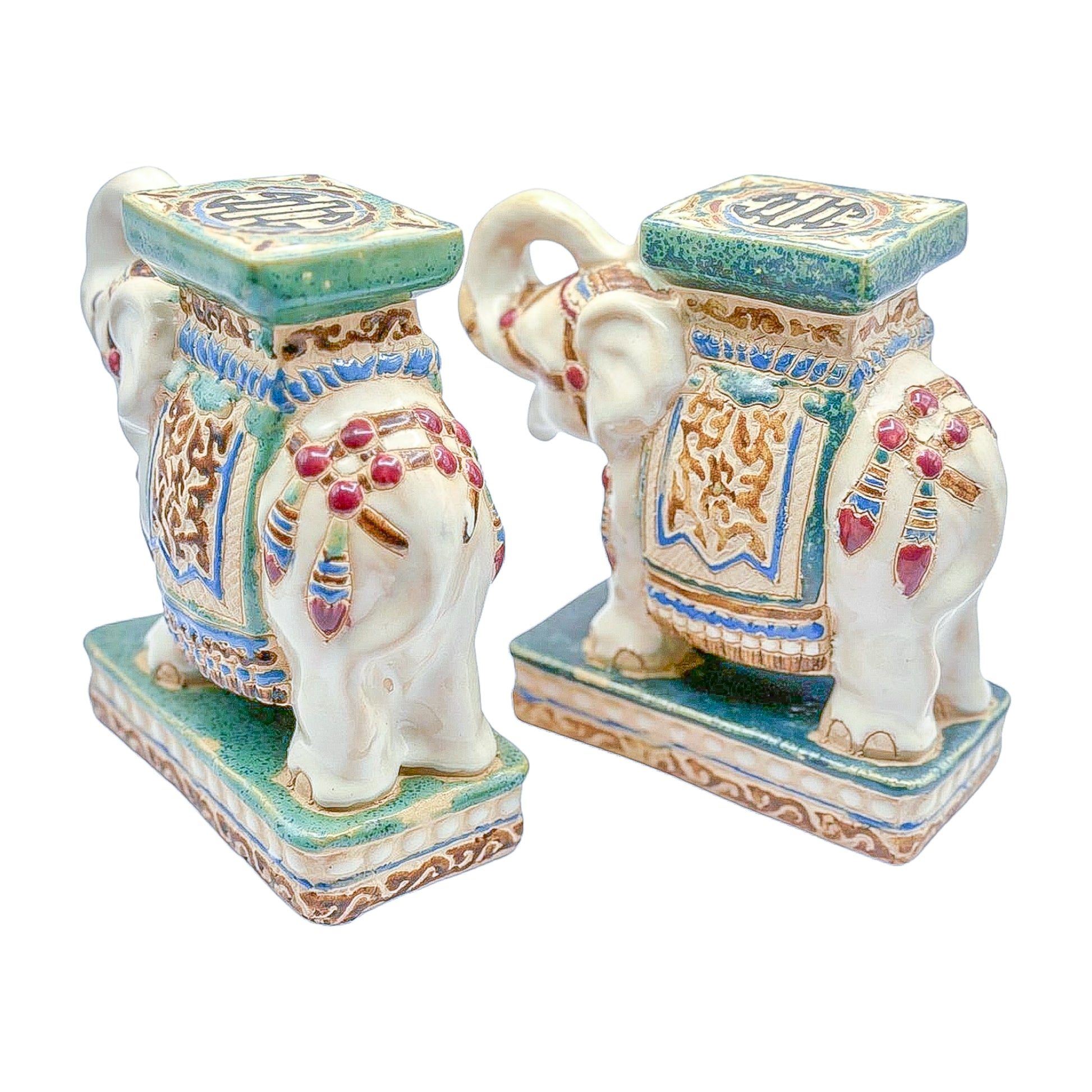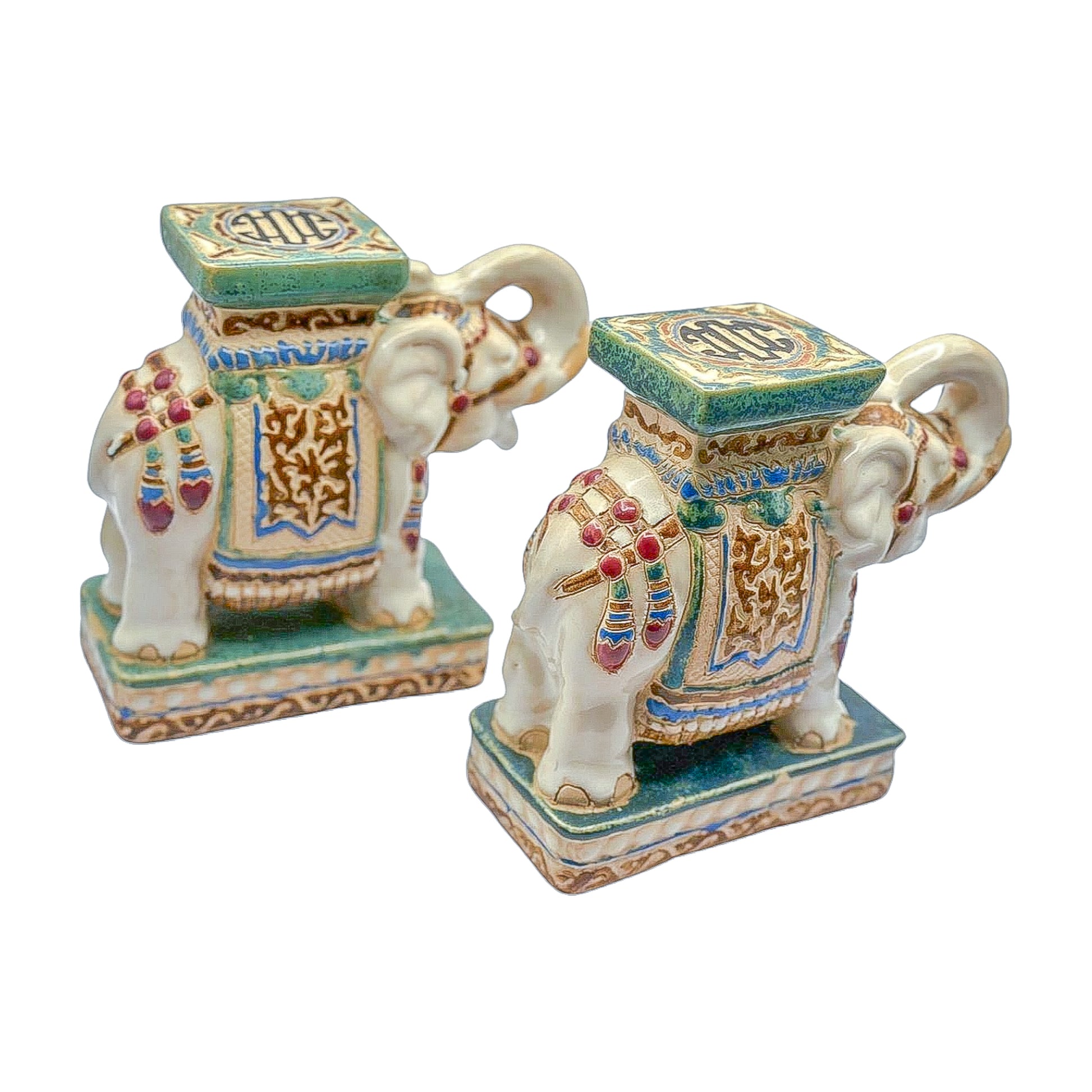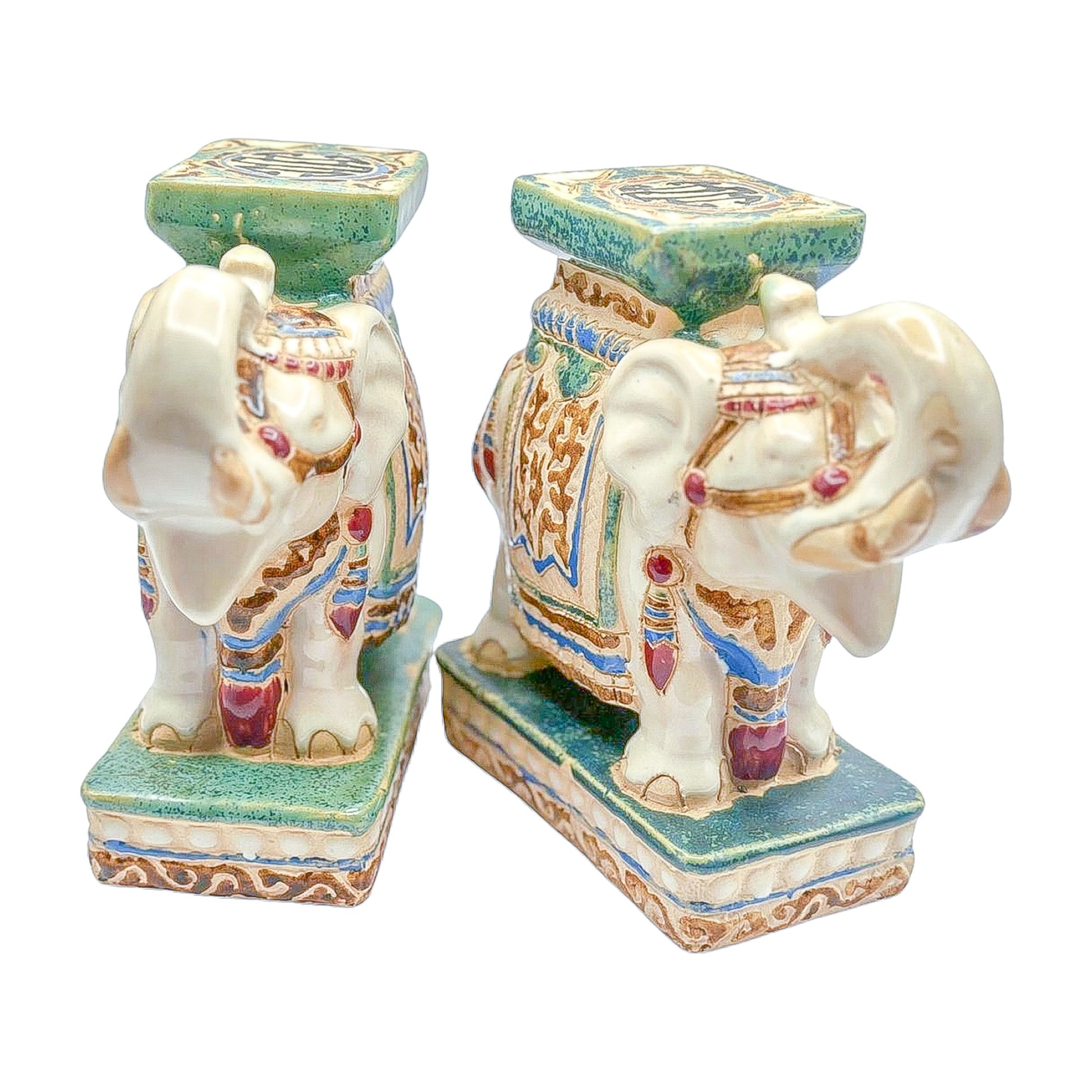 Small but mighty. This pair of ceramic elephant garden seats packs serious charm into a petite footprint. Glazed in layered greens, creams, and jewel tones, with ornate saddles and serene expressions, they’re perfect as risers, bookends, or sculptural moments on a console or shelf.