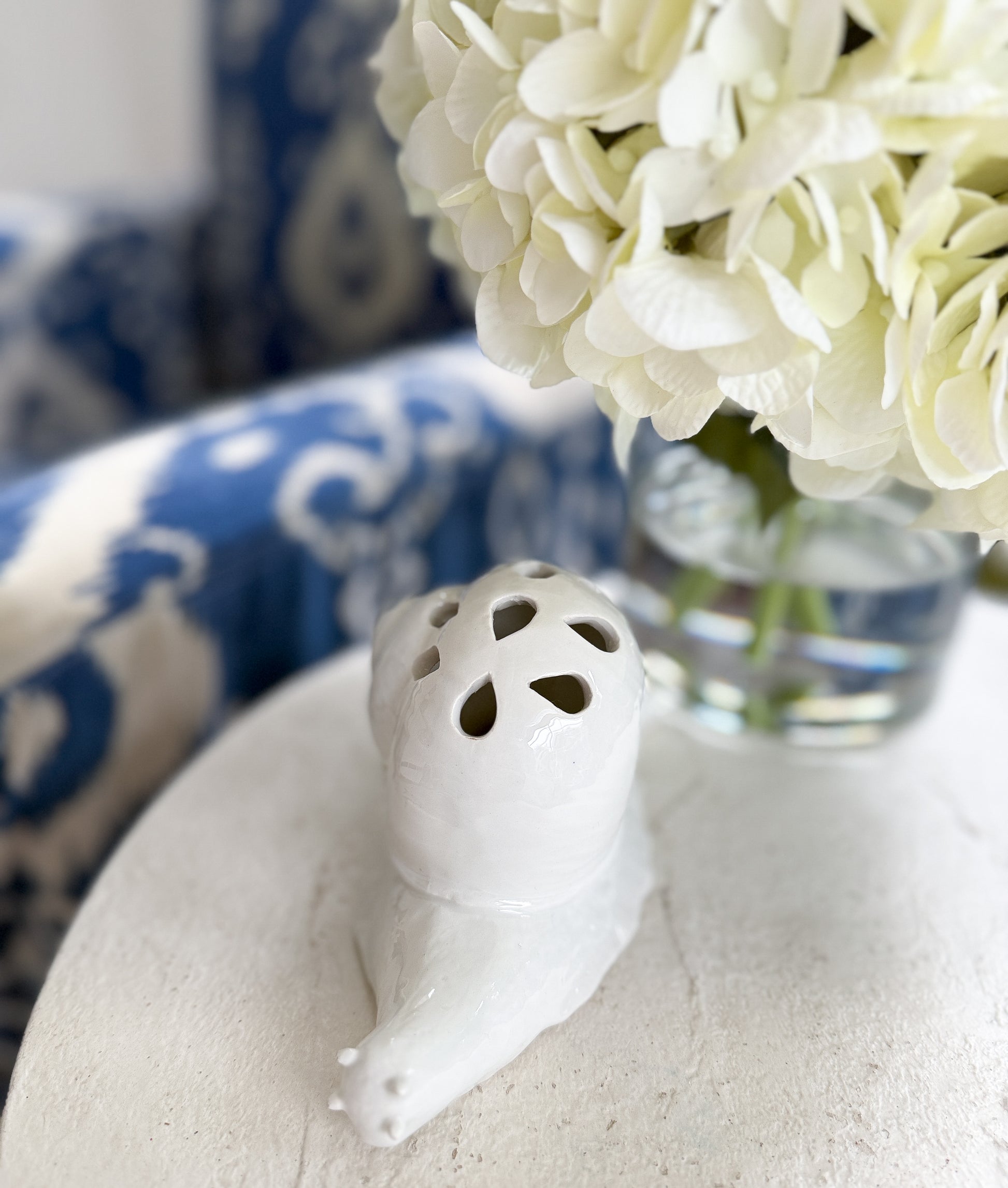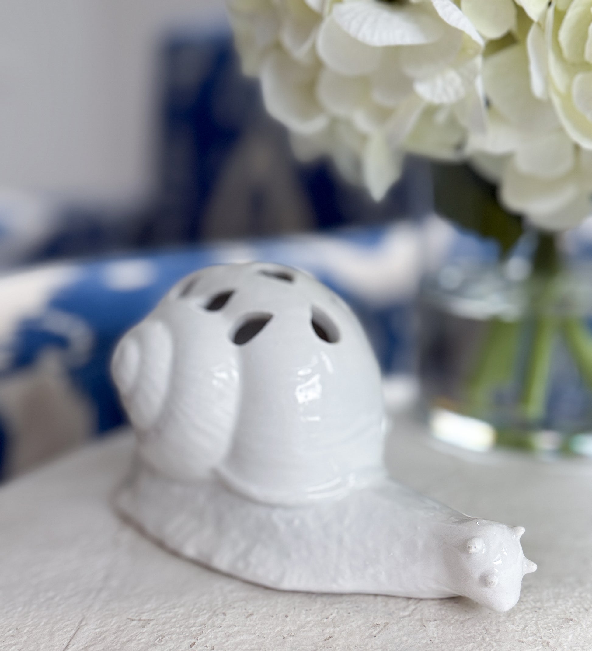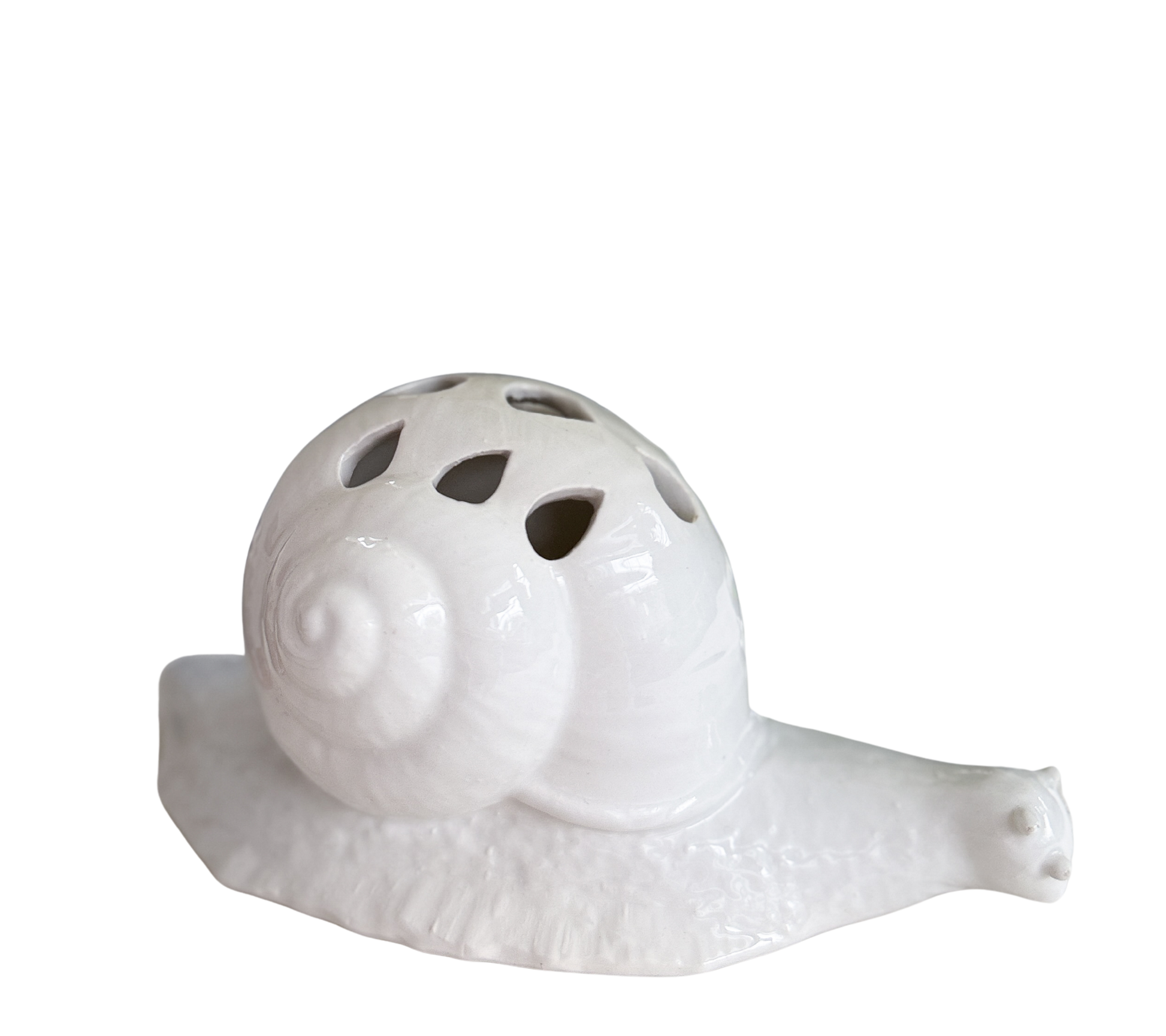 A white ceramic snail flower frog by Mottahedeh, with a pierced shell top designed to hold stems. The glossy glaze and softly modeled form are understated — it does its job without drawing attention to itself.