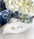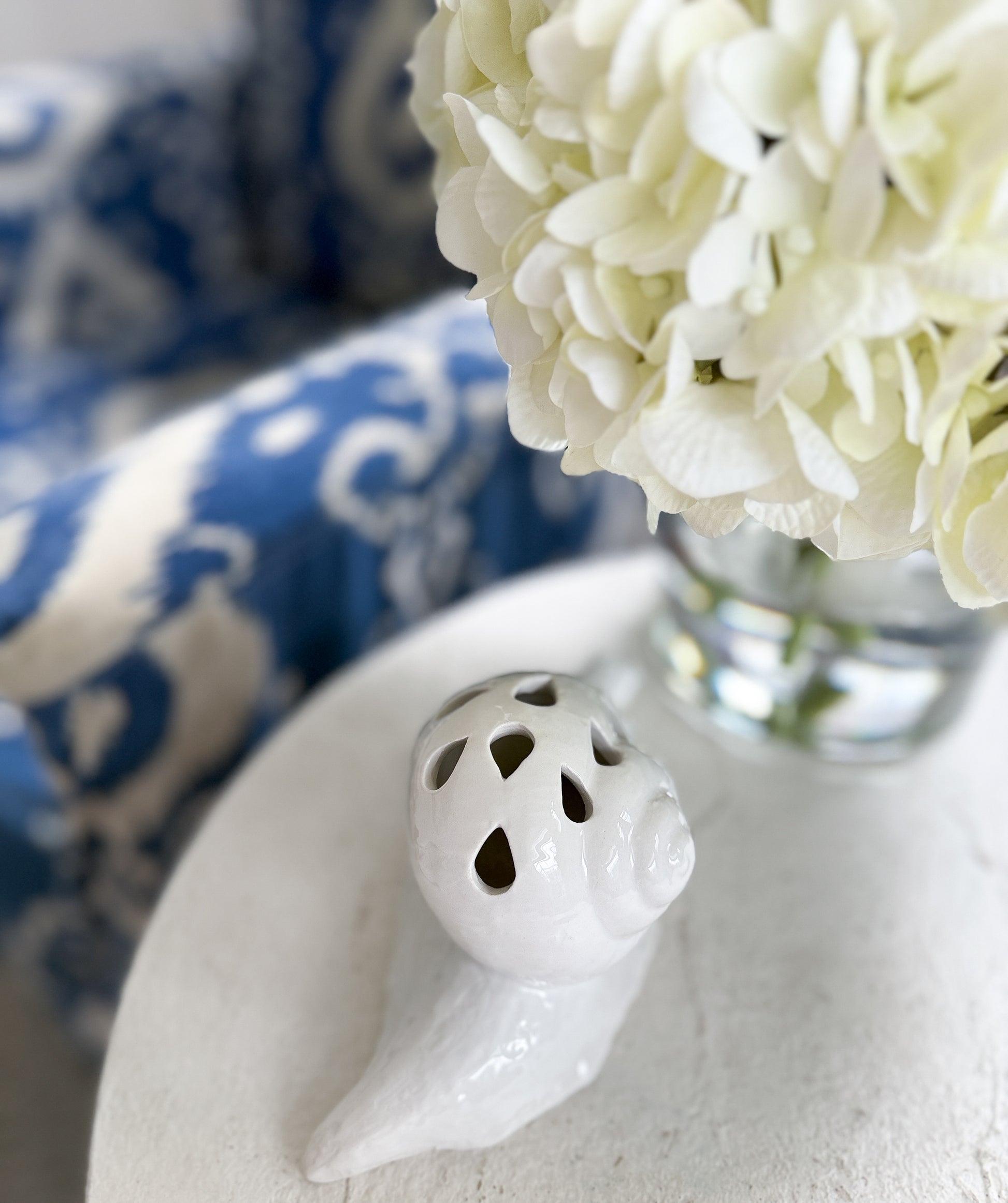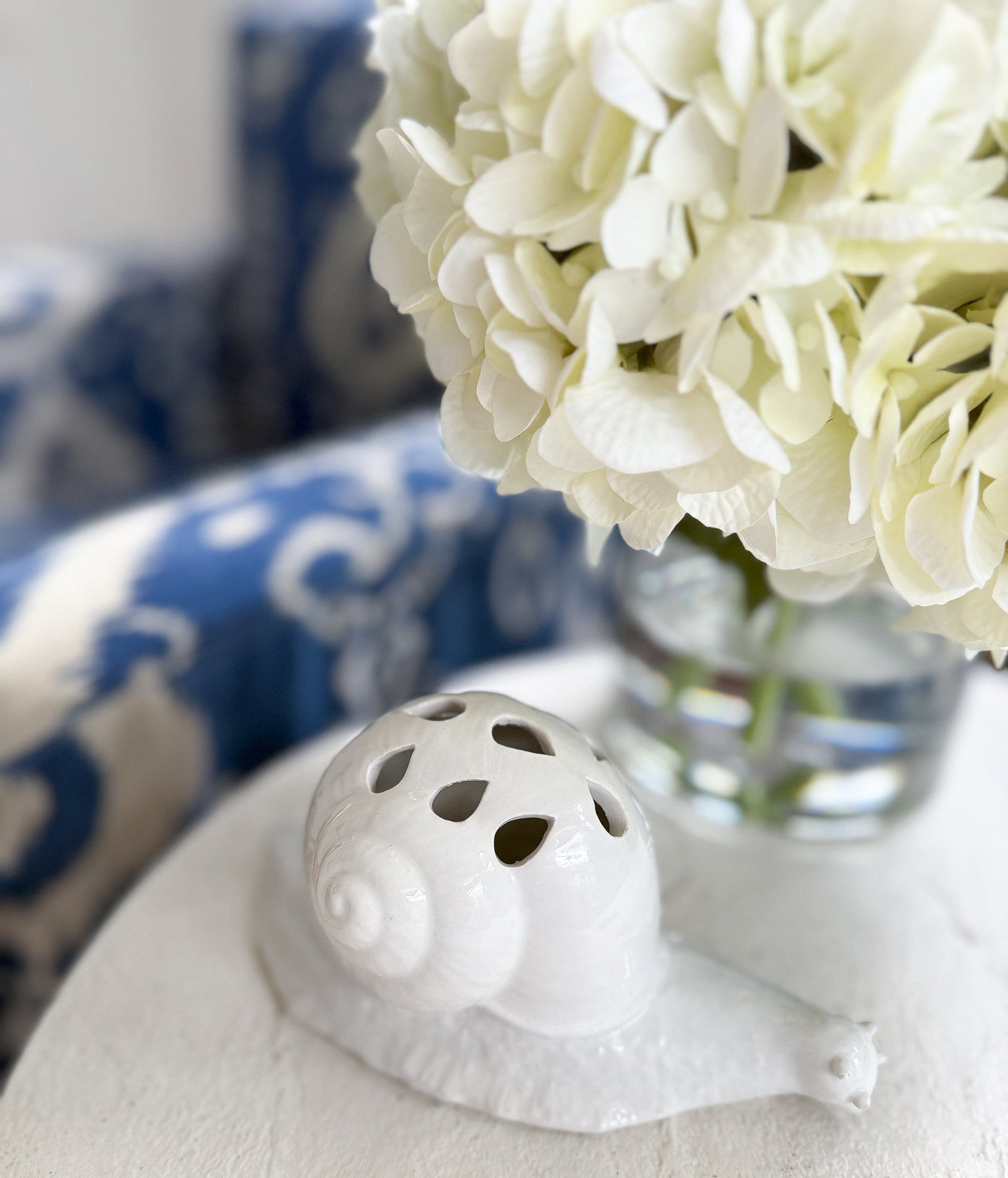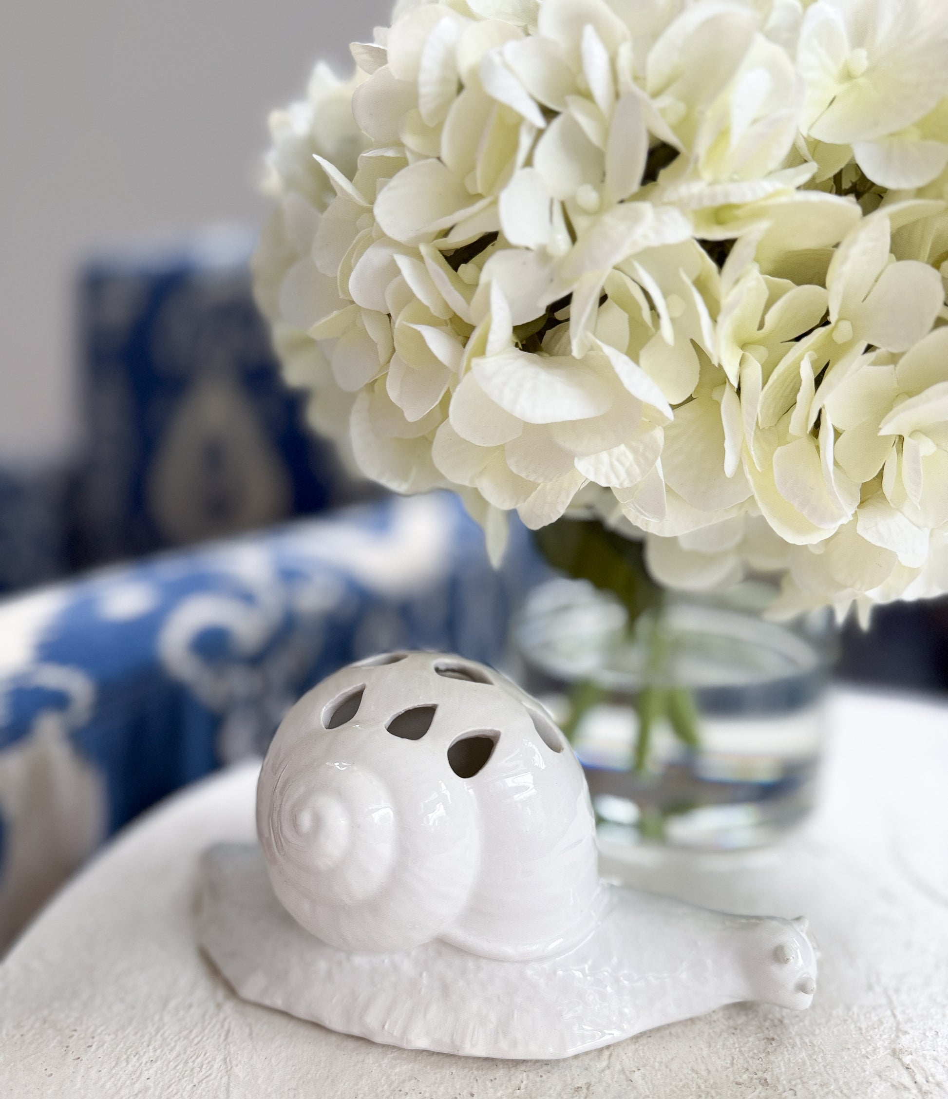 A white ceramic snail flower frog by Mottahedeh, with a pierced shell top designed to hold stems. The glossy glaze and softly modeled form are understated — it does its job without drawing attention to itself.