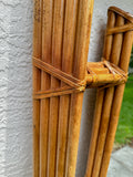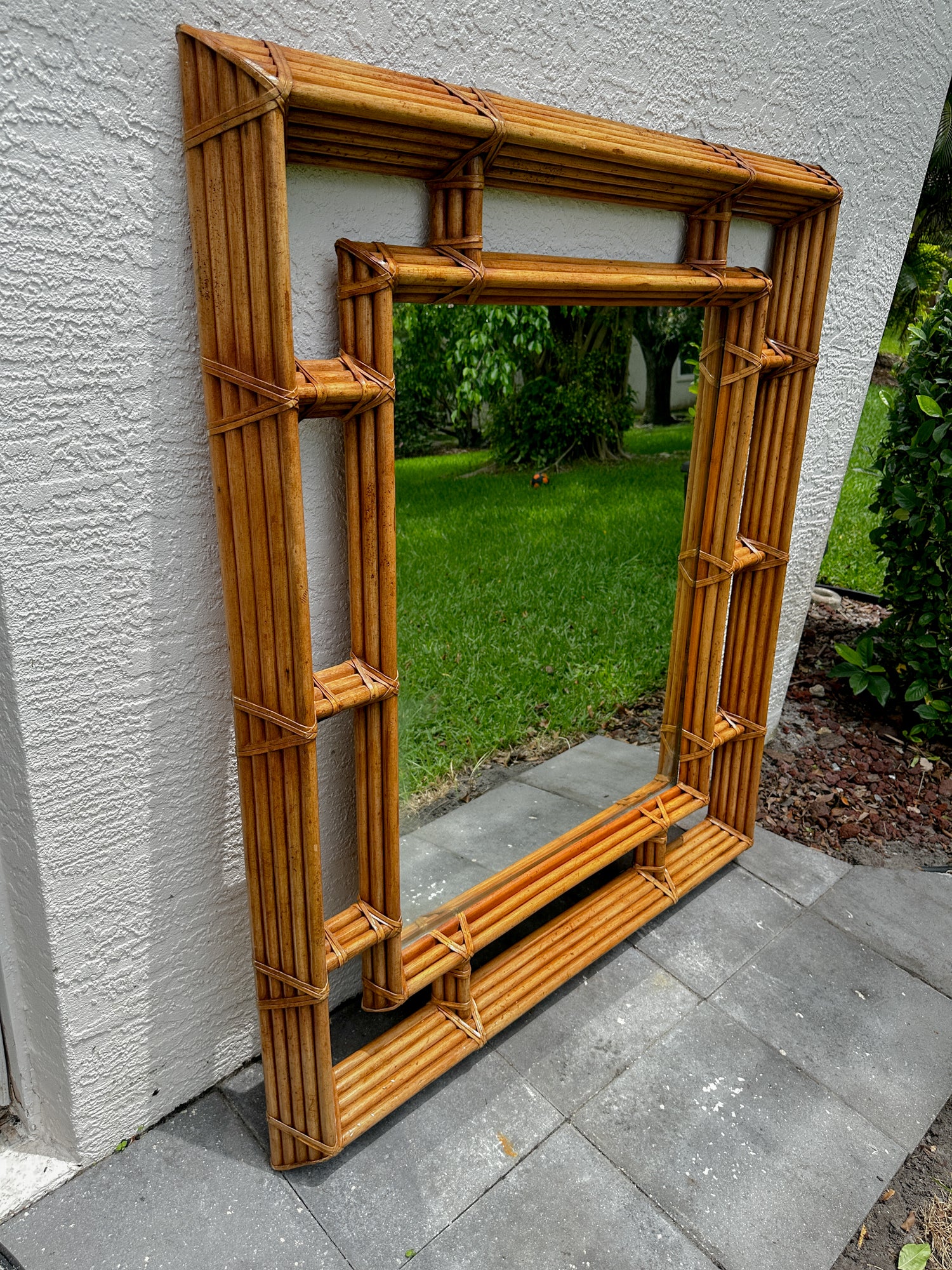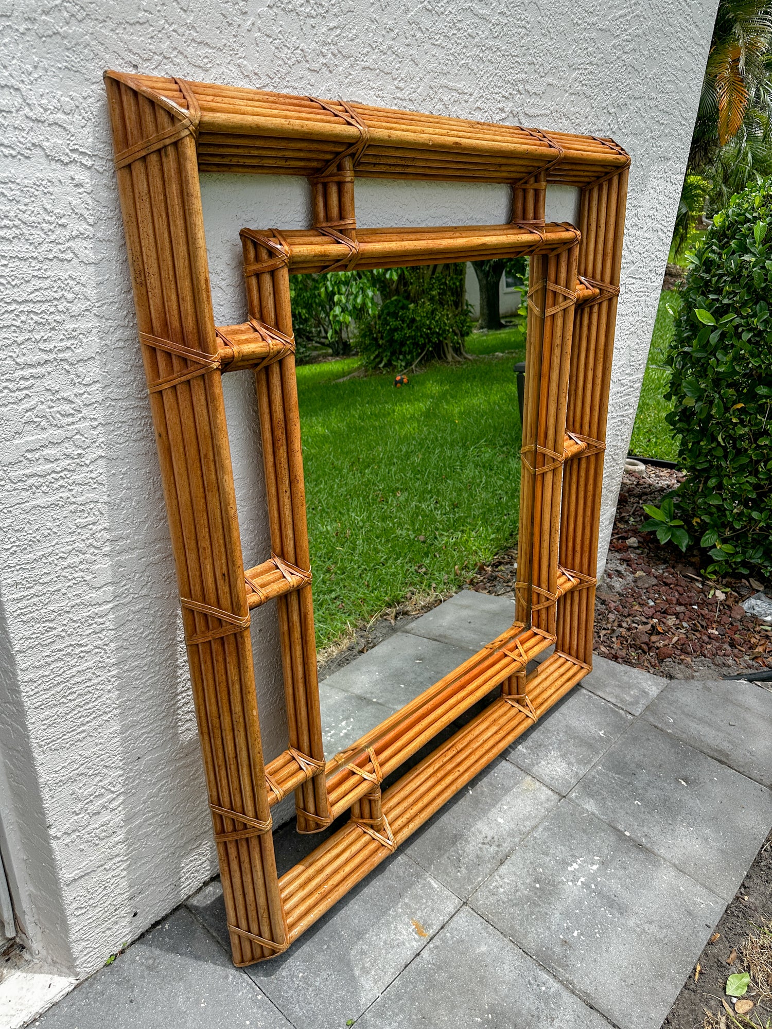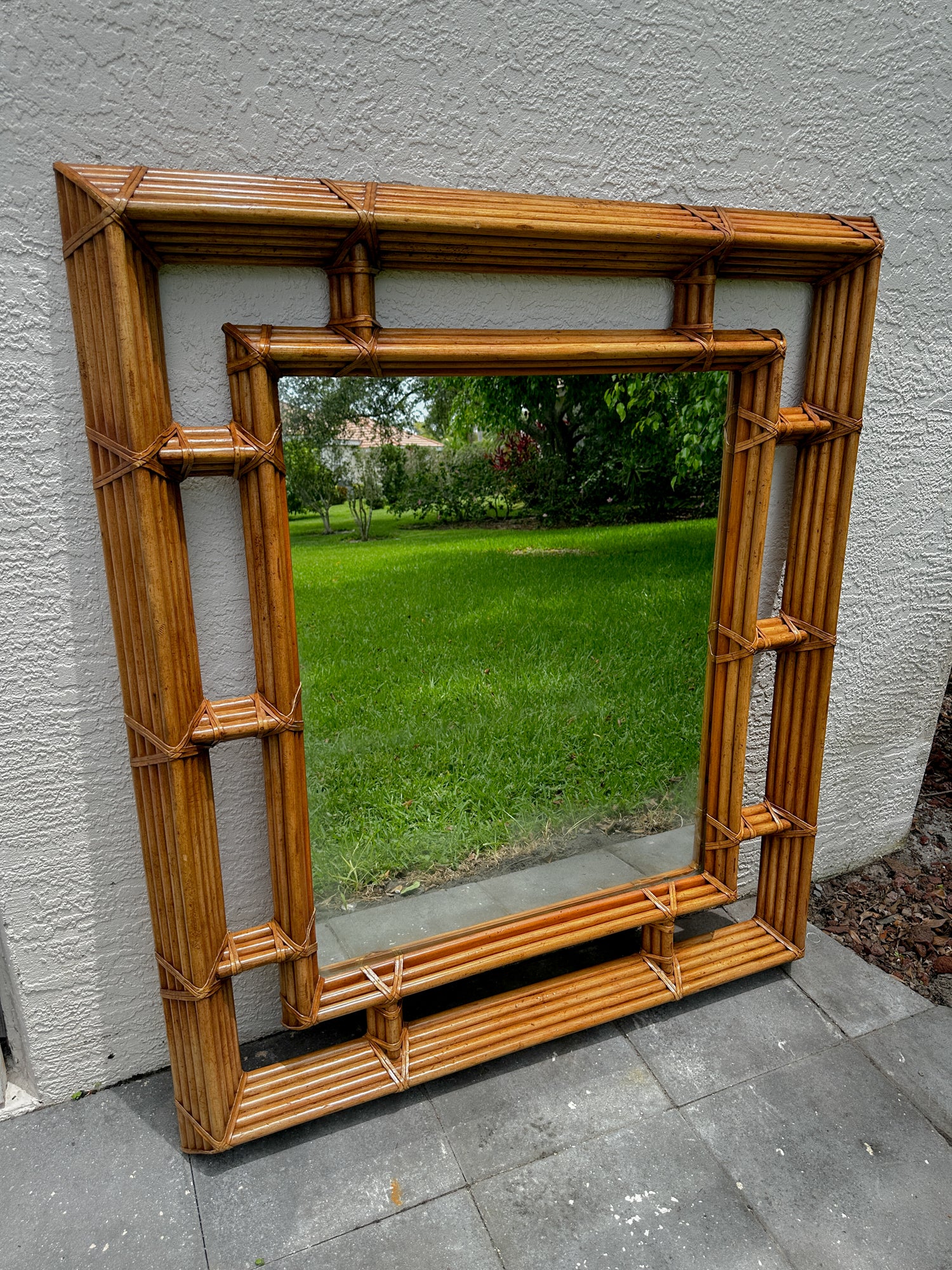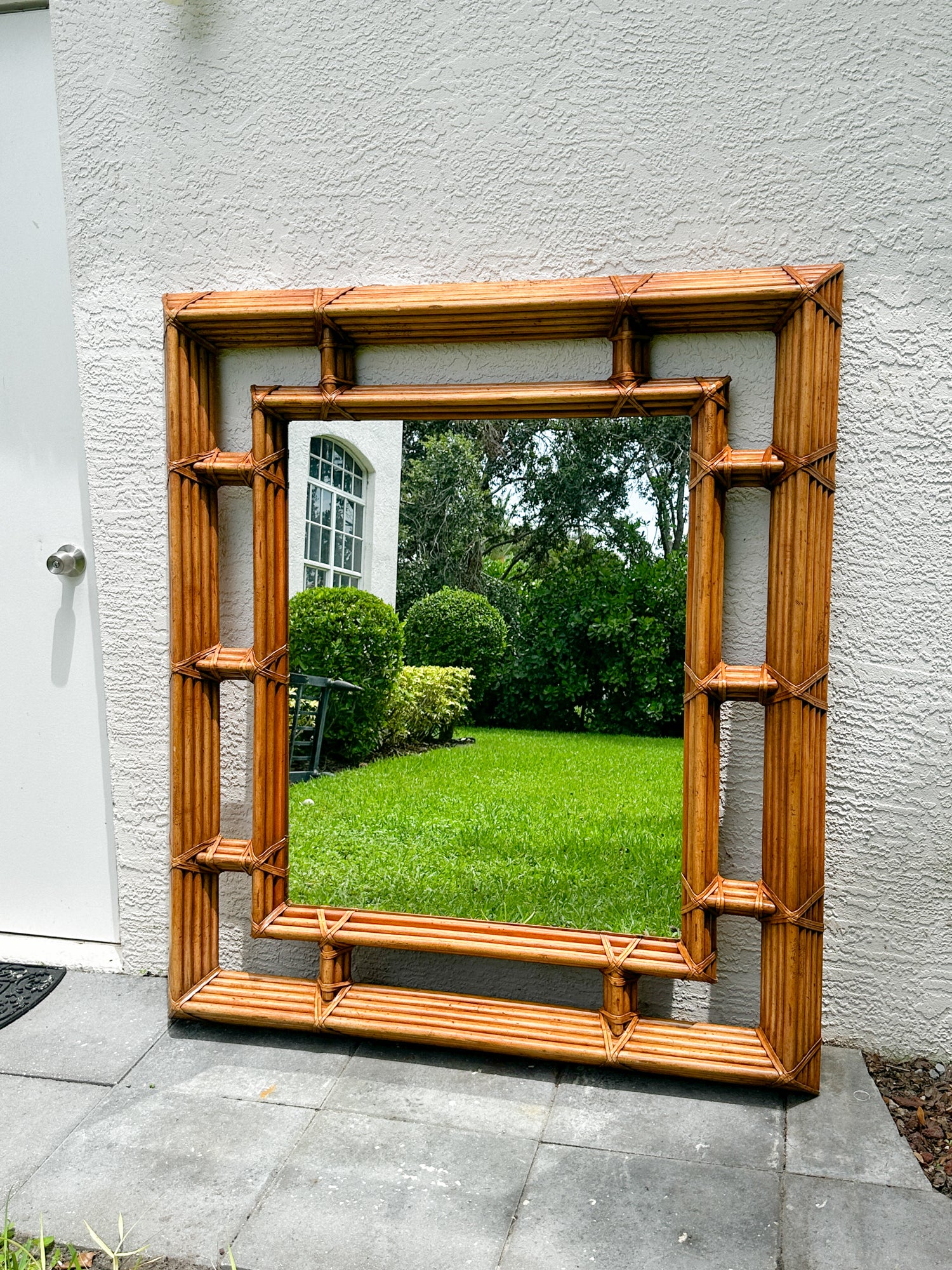 A major statement. This oversized mirror features sculptural layers of rattan and reed, tied with wrapped raffia in a geometric grid pattern. The warm finish adds instant texture, making this piece ideal for coastal homes, sunrooms, or anywhere you want to go big.