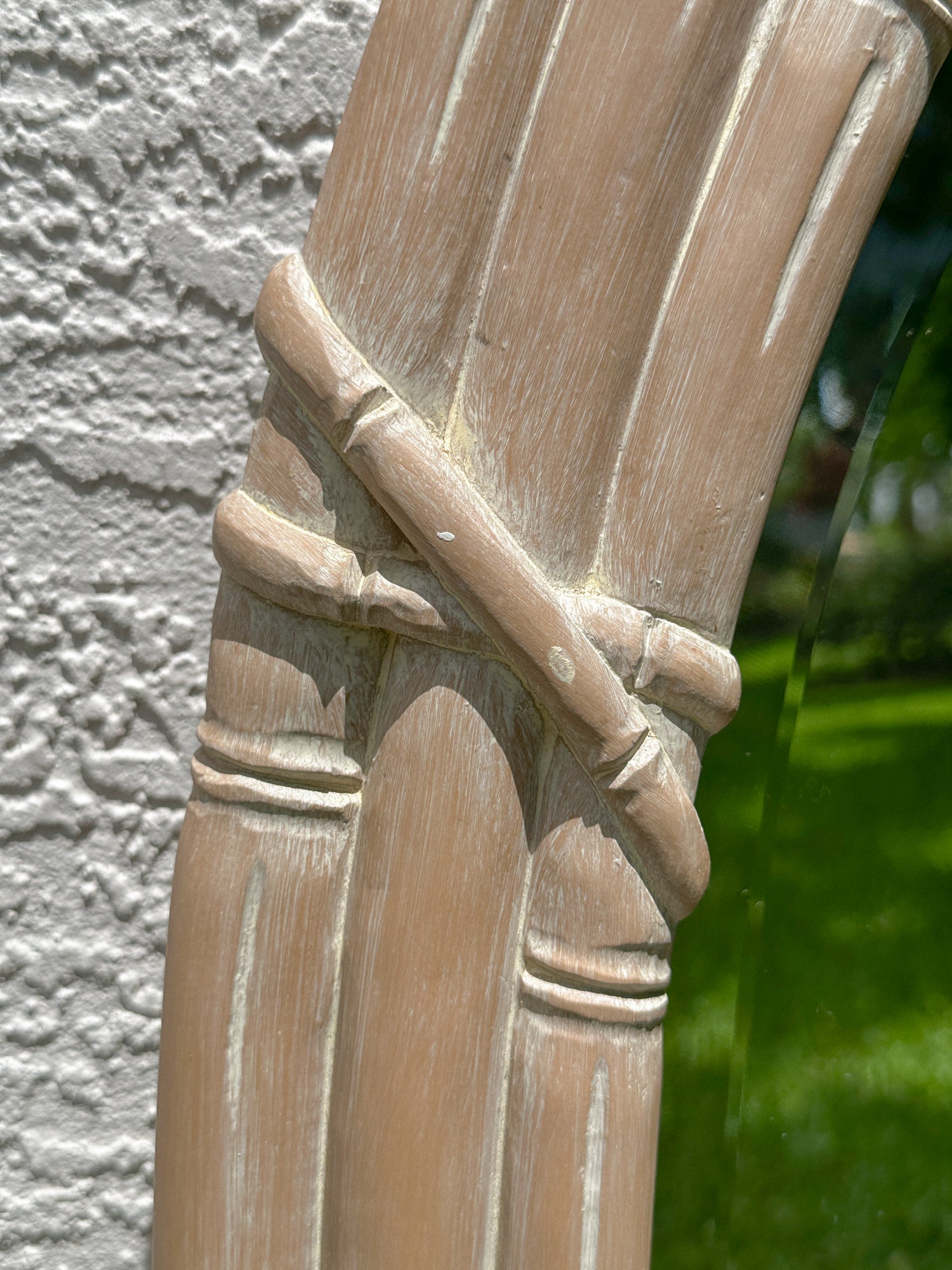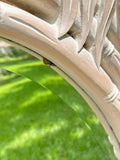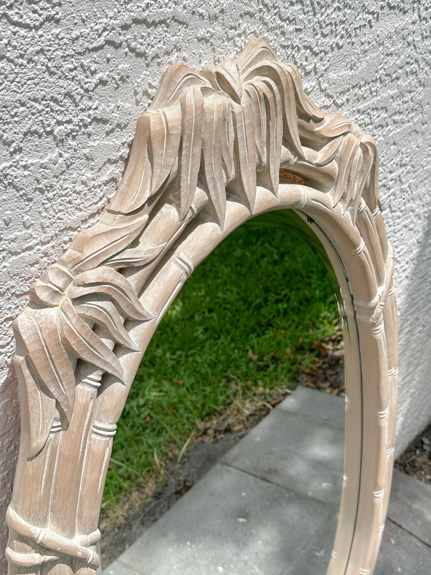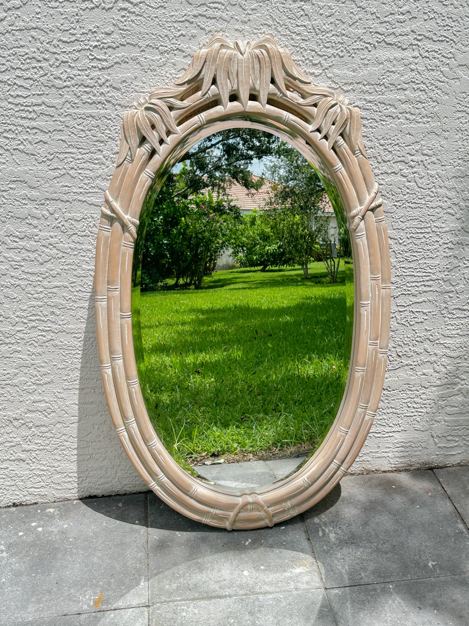 Breezy, sculptural, and a little unexpected. This oval mirror features a palm-frond carved frame with bamboo banding and top bow detail. It’s coastal done chic—not theme-y. Perfect for hallways, bathrooms, or adding softness above a console. Very good vintage condition. Minor surface marks from age.