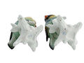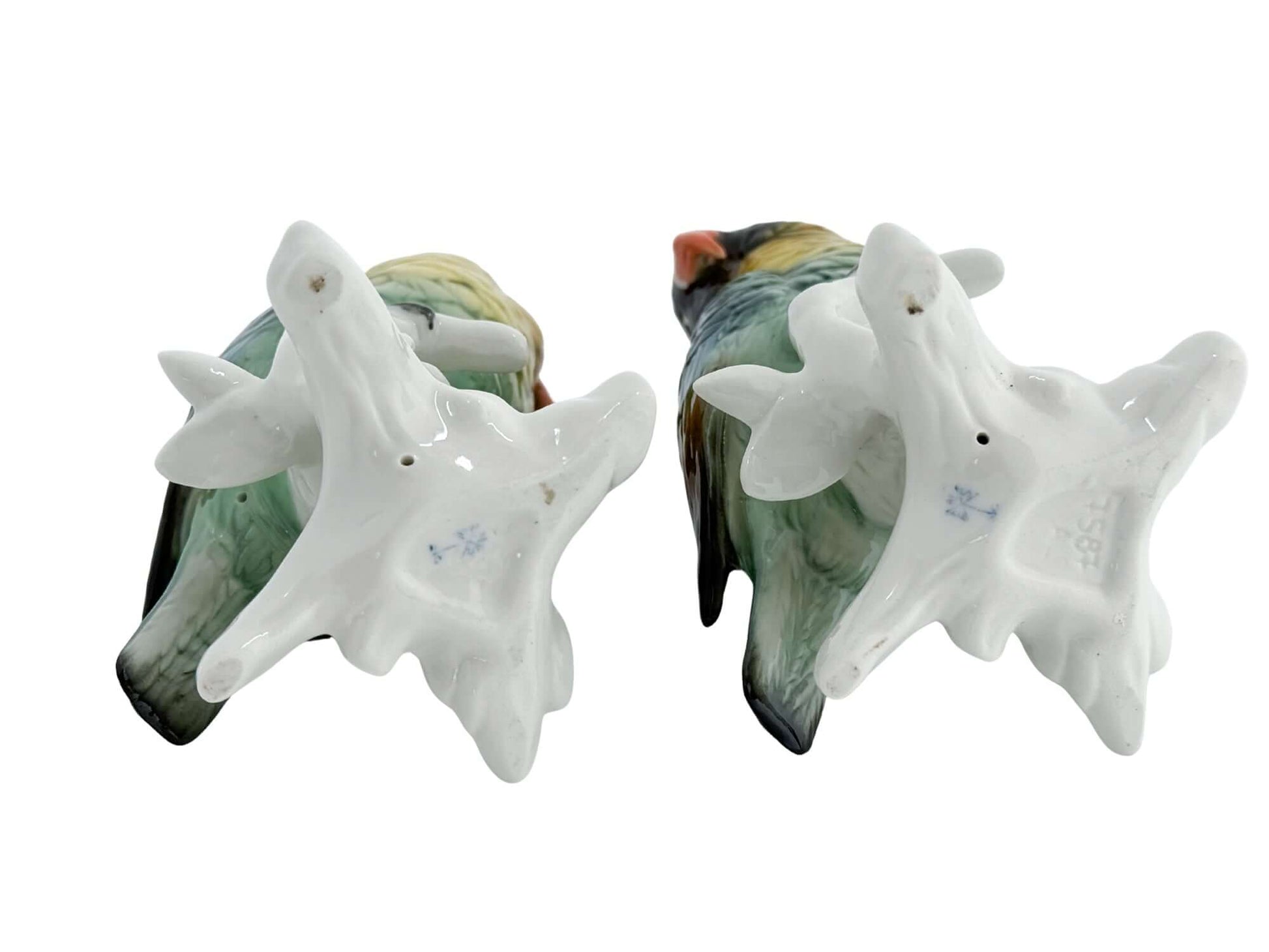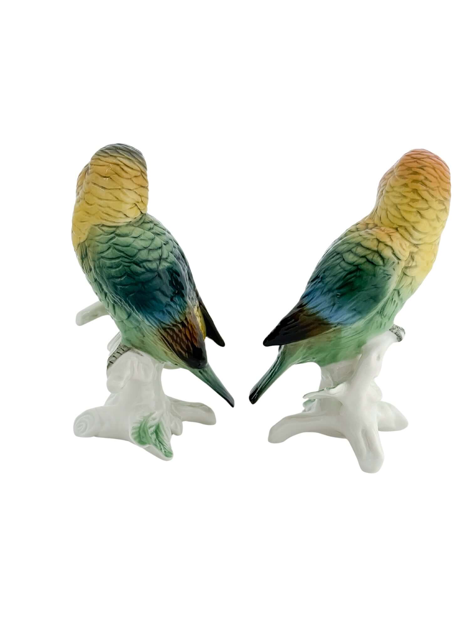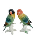 A rare pair of porcelain lovebirds from the Karl Ens Volkstedt manufactory. Each parrot perches on a naturalistic branch, their plumage hand-painted in saturated greens, soft blush, and golden yellow. Lifelike detailing carries through the feathers, eyes, and bases. Marked on underside with the green Karl Ens windmill stamp, dating to the early–mid 20th century. Coveted German craftsmanship—displayed together, they read as a true collector’s find.
