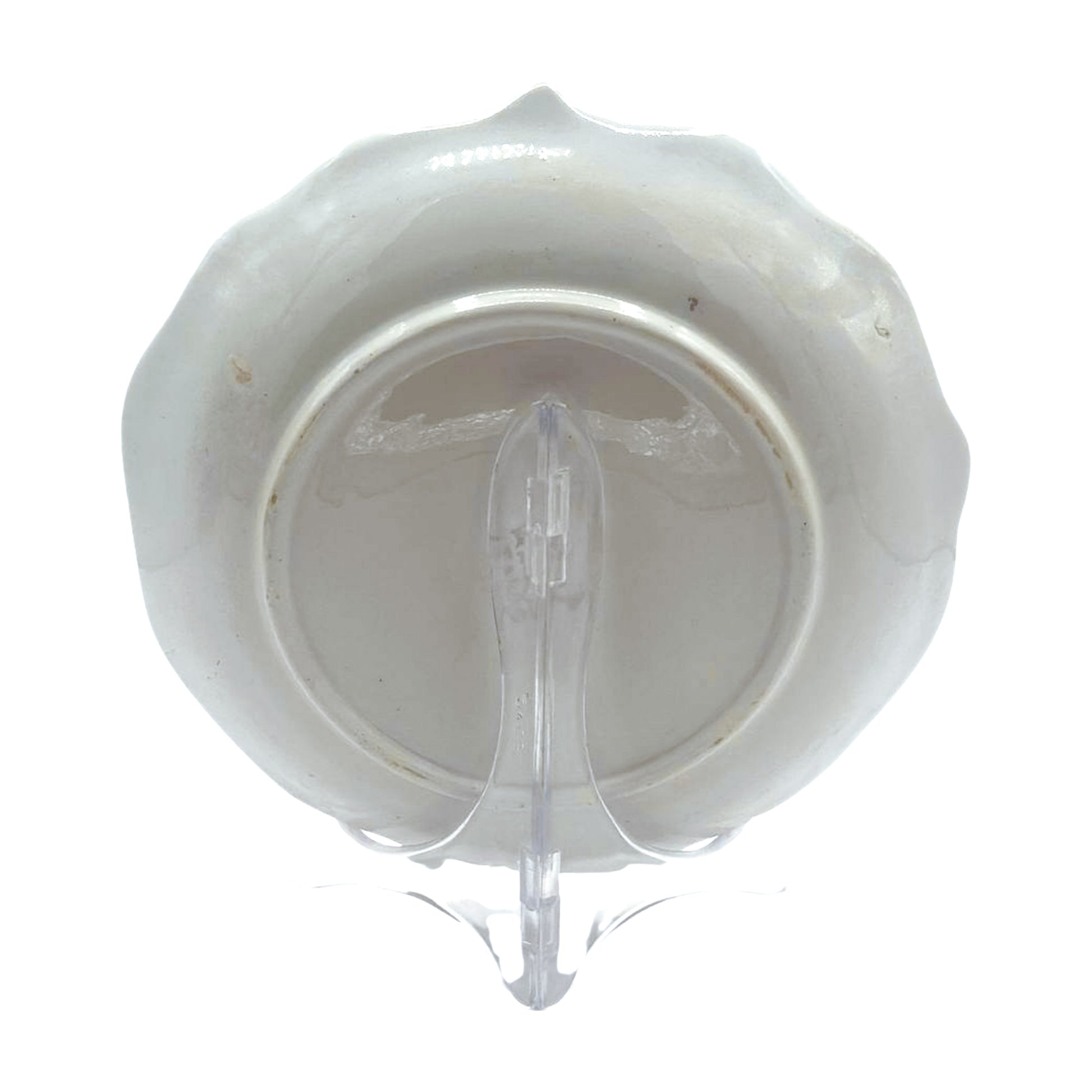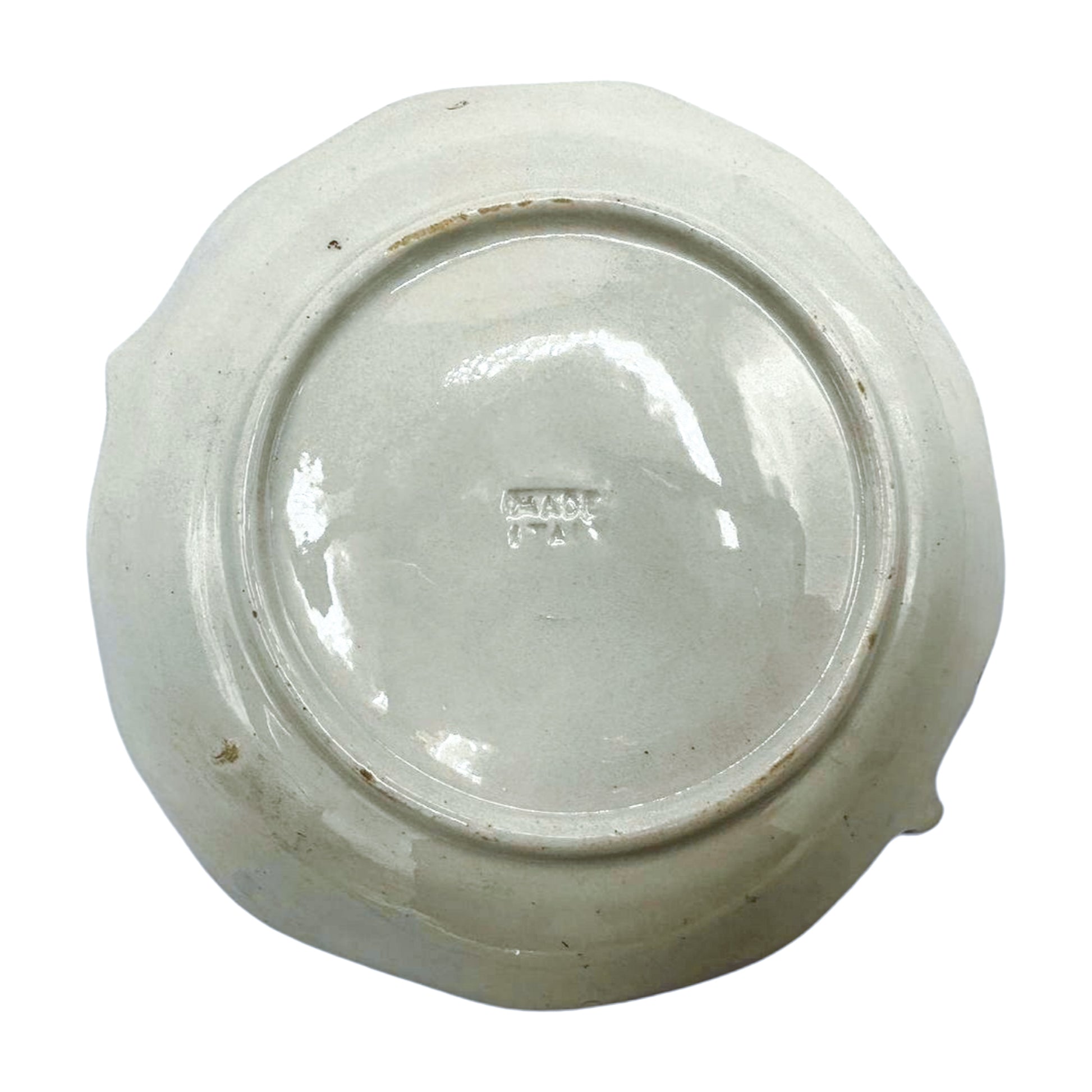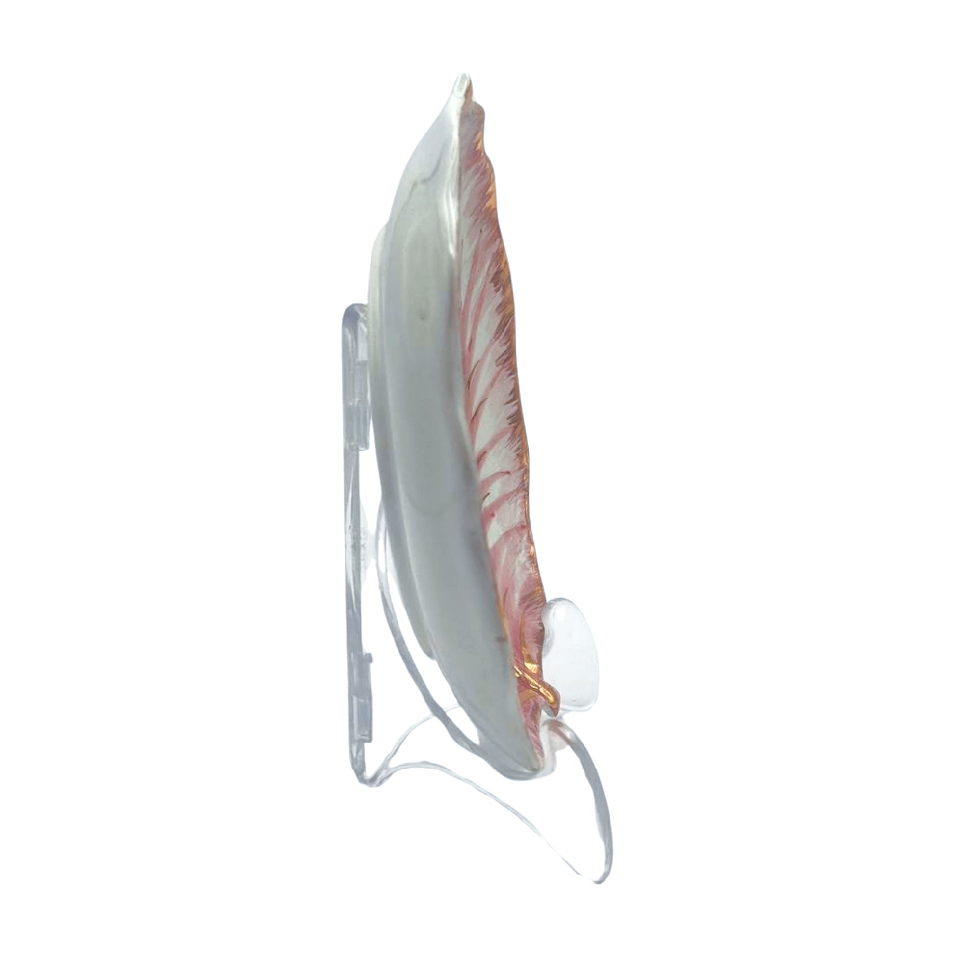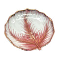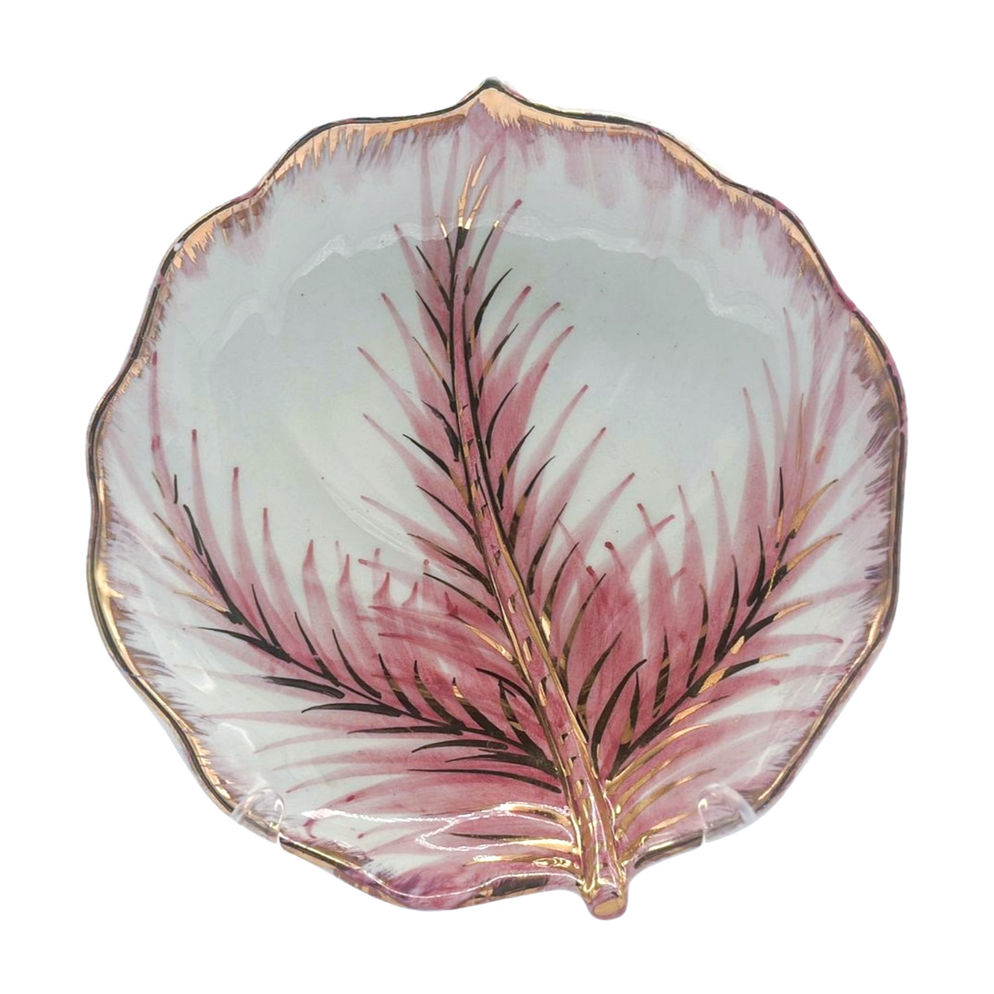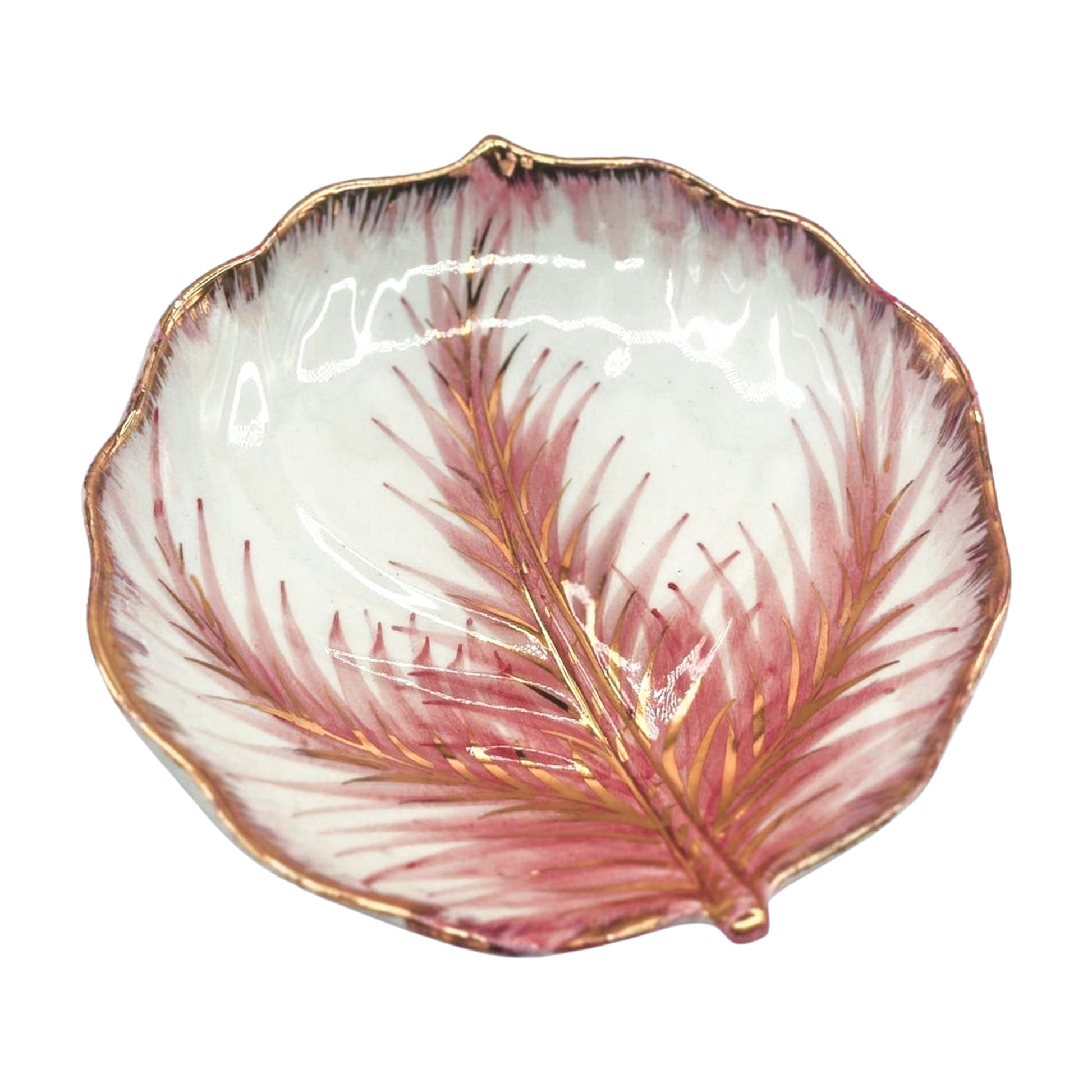A hand-painted Italian ceramic dish shaped like a leaf and glazed in painterly shades of blush, coral, and deep plum. Delicate veining radiates from a golden stem, giving the piece both movement and softness. Petite in scale but rich in detail—perfect for serving olives, holding rings, or simply catching the light on a nightstand.