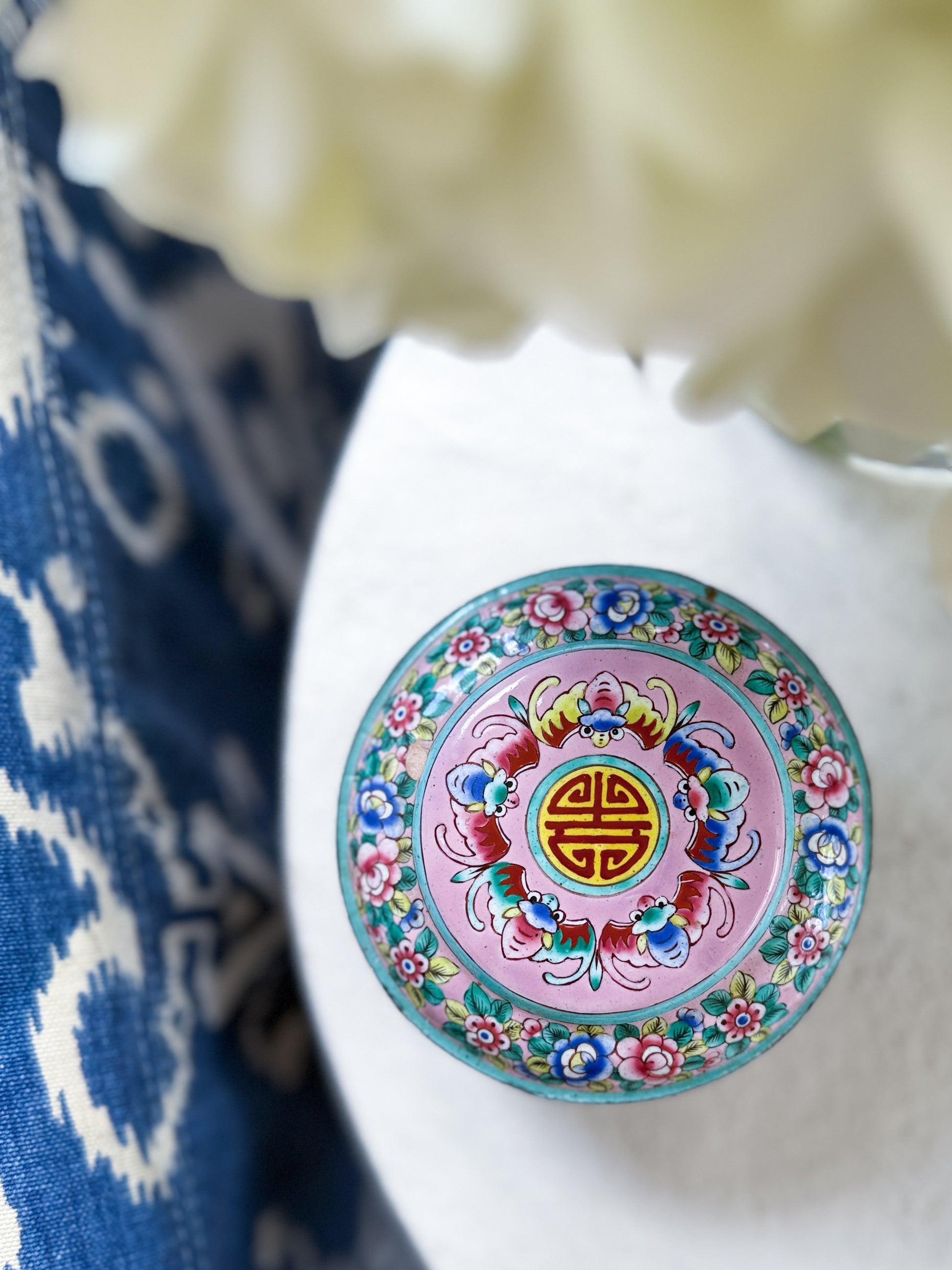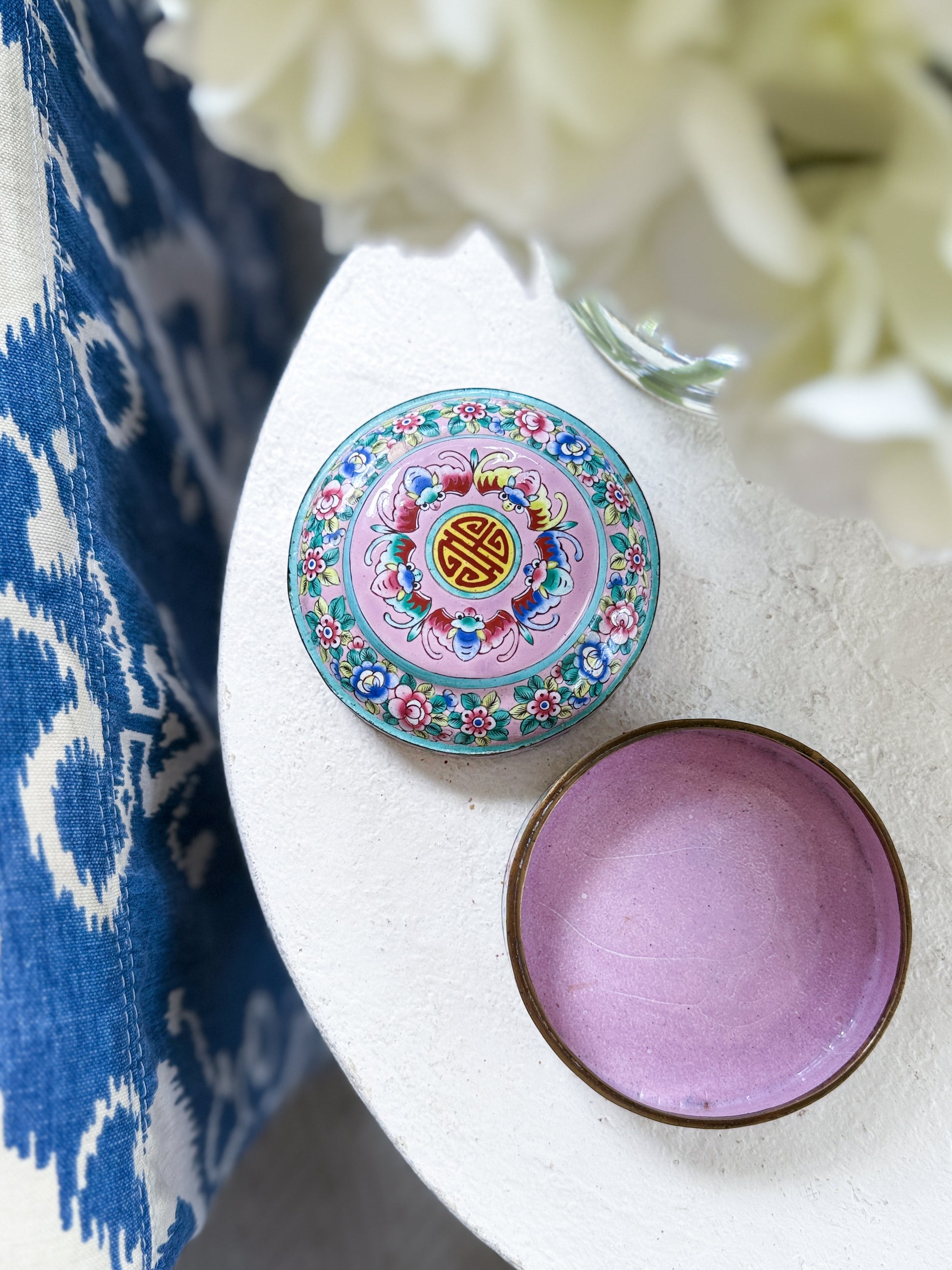 A domed cloisonné box in soft pink enamel, framed with turquoise and fine brass wirework. The lid centers a traditional longevity medallion, surrounded by stylized florals in coral, blue, and green.